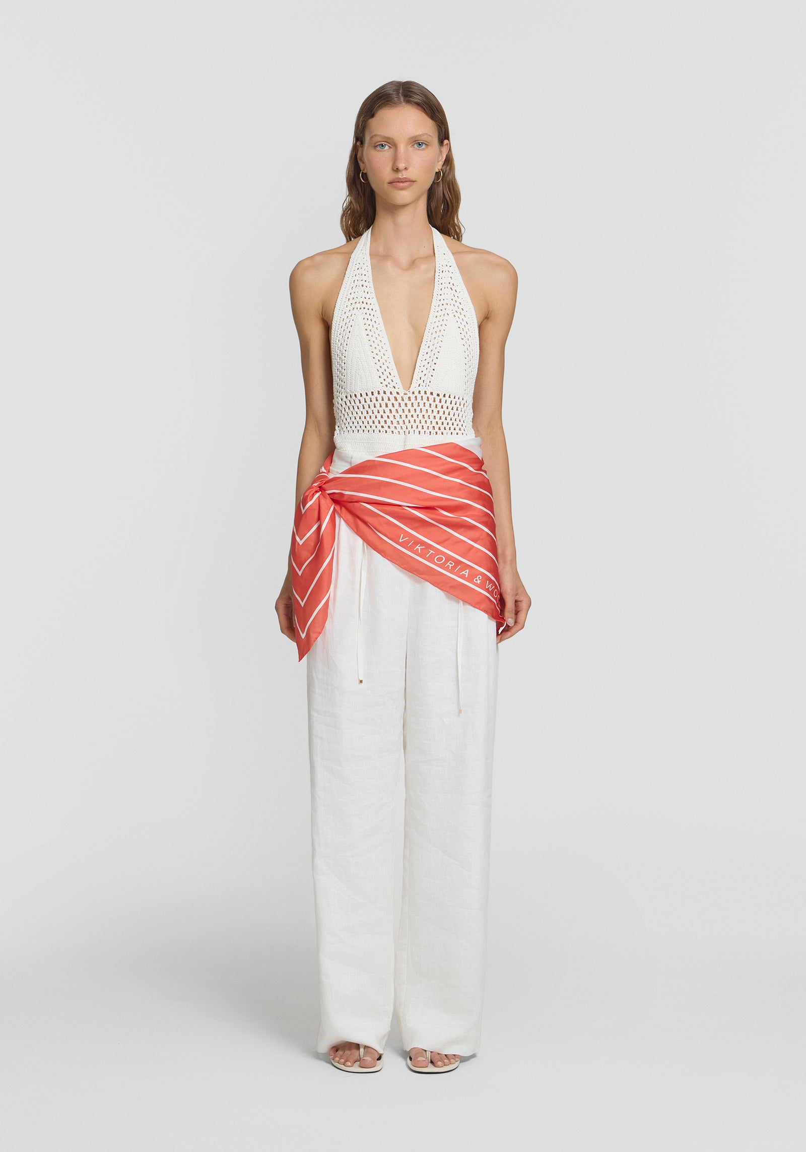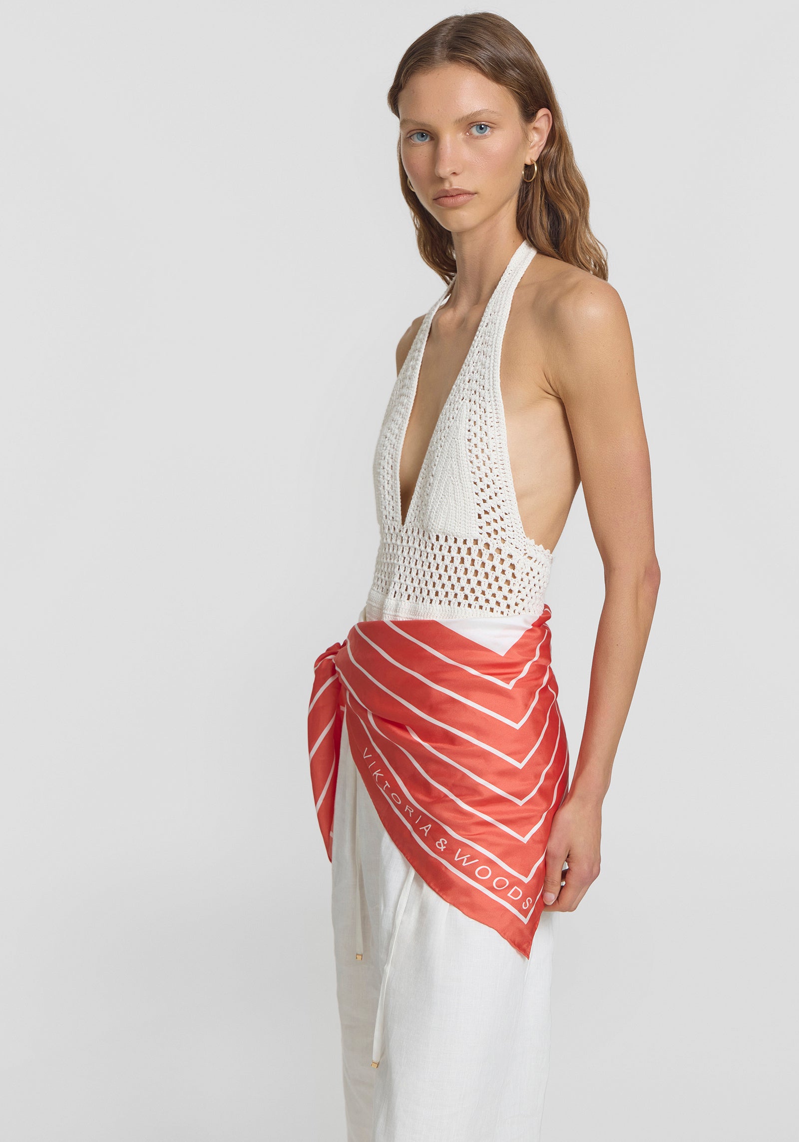 Luxuriously accessorise with the Ace Scarf, expertly crafted in a vibrant coral red silk with contrast ivory detailing and our signature V&W insignia. Wear it your way—whether styled as a top, draped as an accessory, or tied around the neck, this scarf offers versatile options for summer styling and holiday dressing, effortlessly elevating any look.