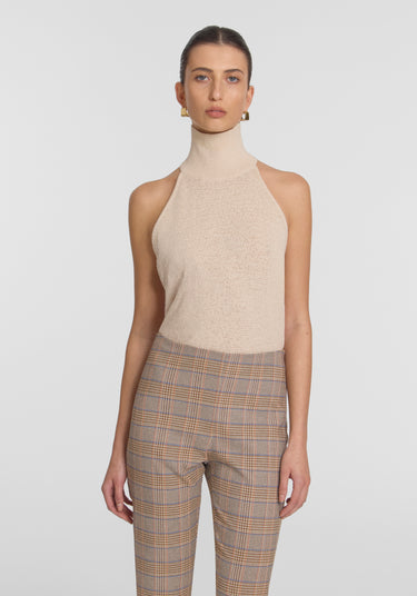 The Alberta Knit Top returns in a sand hue, reimagined in a new fabrication. Designed with an exaggerated turtleneck, low back, and contrast rib hem, it offers a softly structured fit. This modern knit shapes a distinctive silhouette with feminine proportions, making it a must-have for effortless elegance this season.
