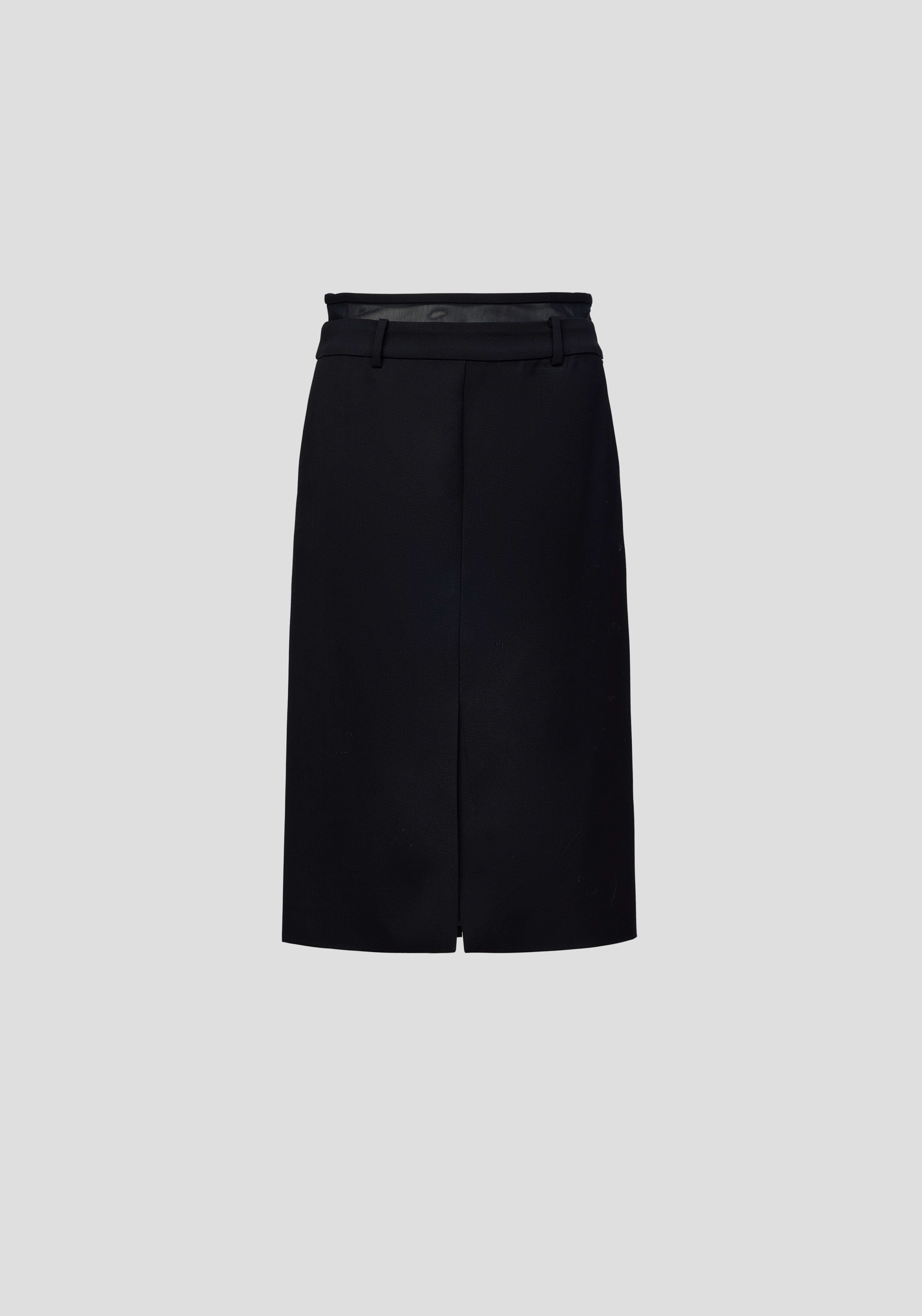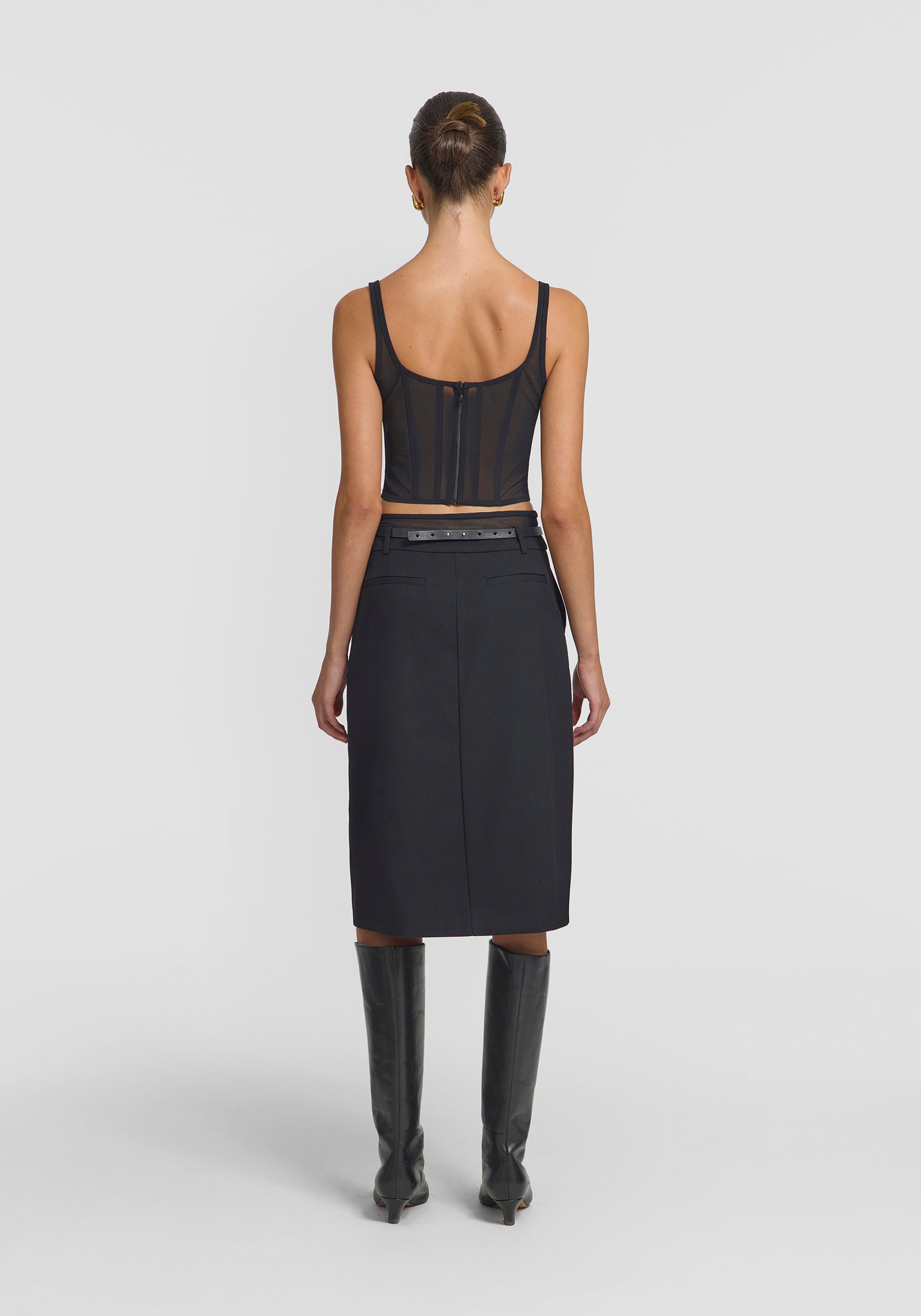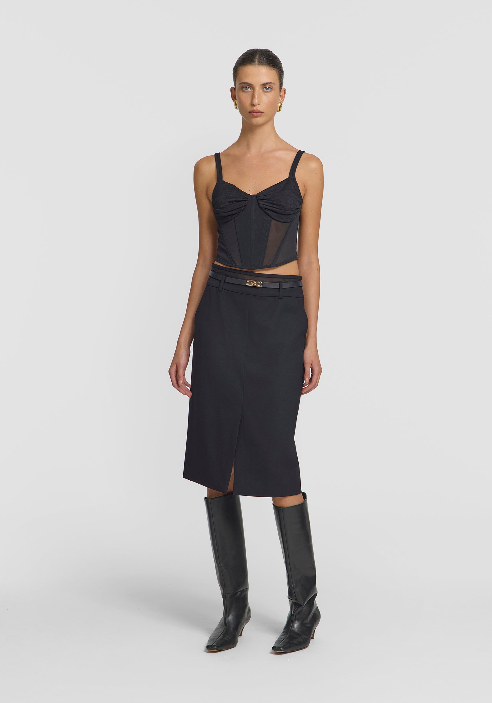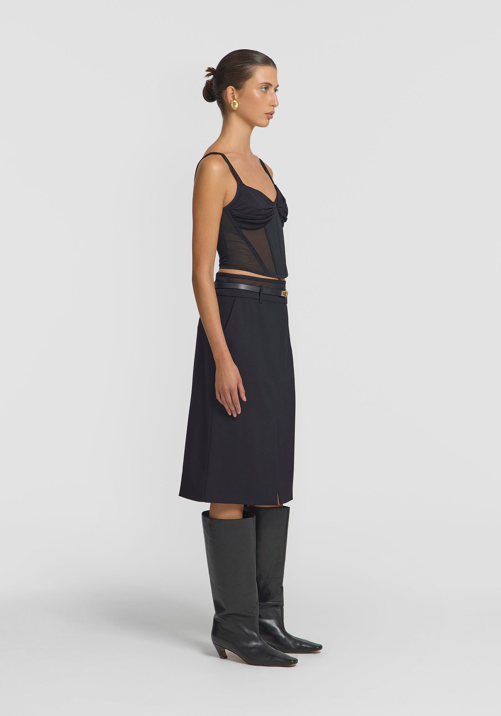 Detailed by form, the Alleycat Skirt is your go-to black skirt, crafted from luxurious black wool. With a high-rise midi silhouette, tailored waistband, and mesh detailing, it combines effortless versatility with refined style. Complete with belt loops, pockets, and a front hem vent, it pairs perfectly with your everyday essentials or the Menagerie Bustier for a sleek all-black evening look.