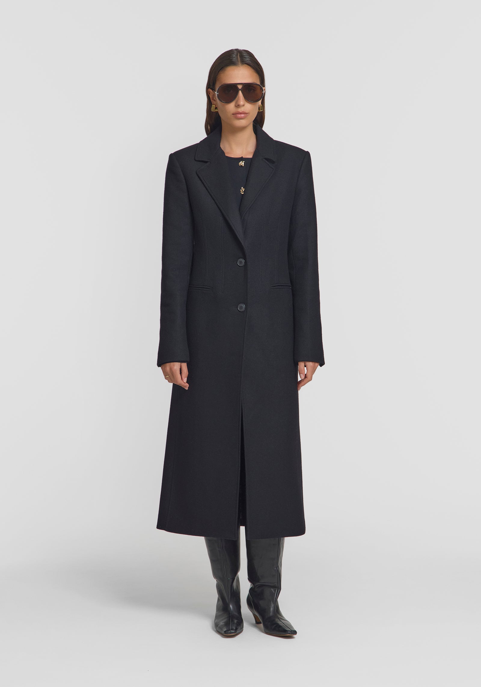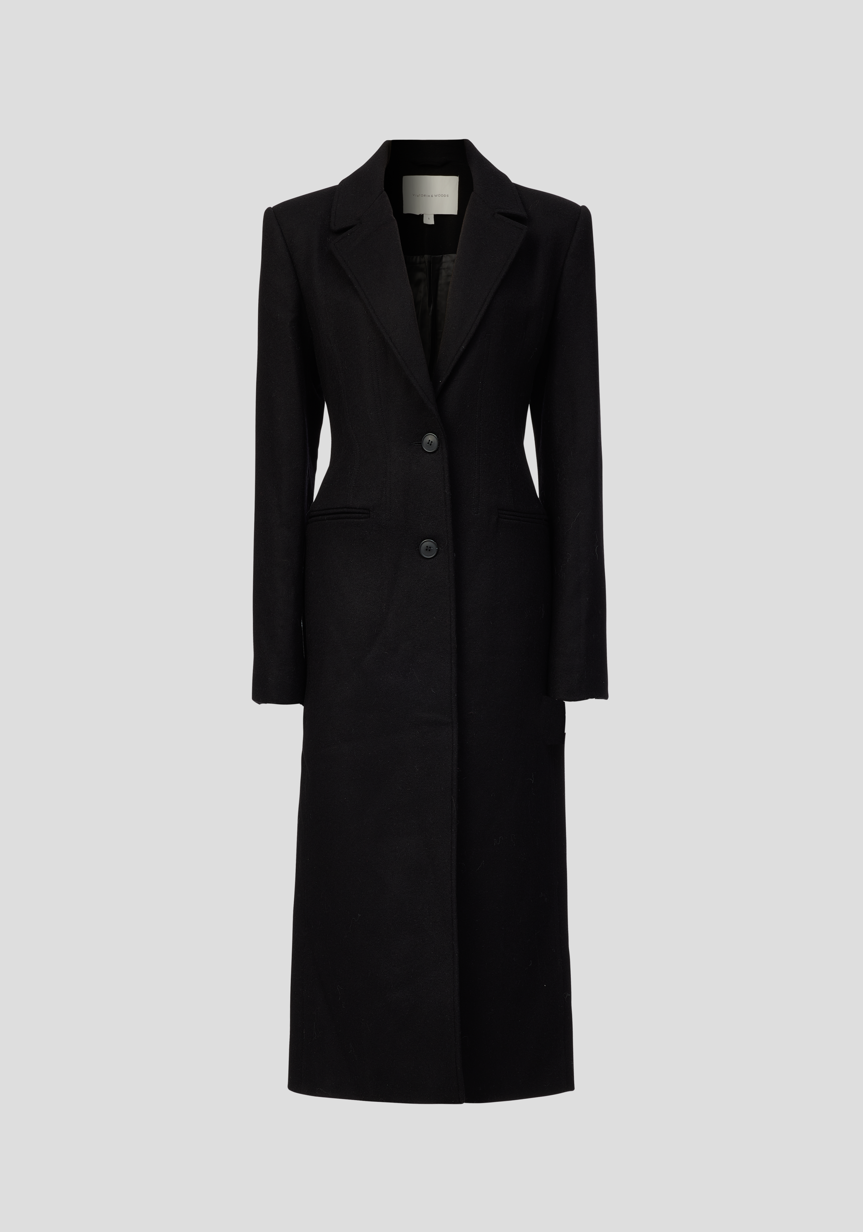 The bestselling Americano Coat returns this year, offering a refined iteration of our classic Valentina Coat, crafted from a luxurious wool blend in timeless black. This single-breasted, classic tailored coat boasts a peaked lapel and corsetry detail through the waistline, creating a more feminine silhouette. With exaggerated shoulders and sleeve vents, it exudes sophistication and elegance.