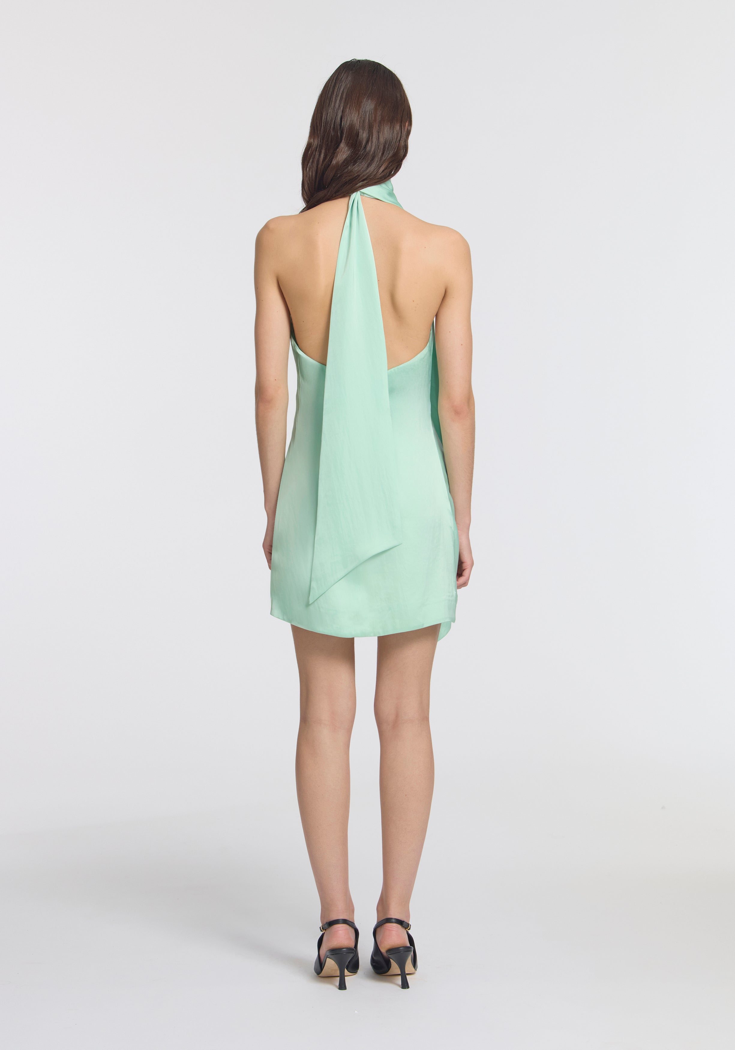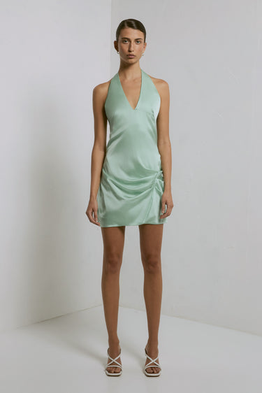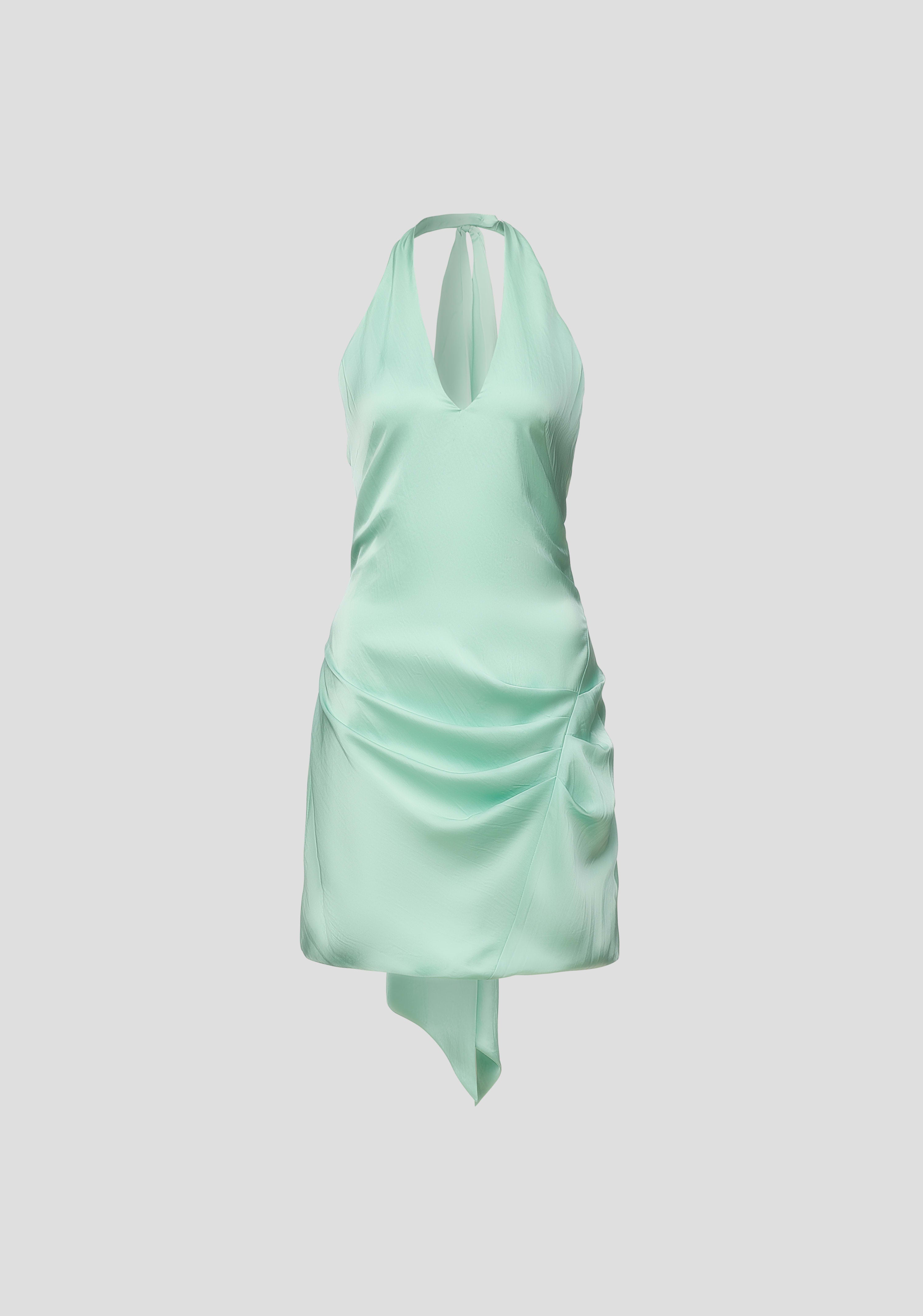 The Basilisk Dress, crafted from our signature cupro blend in a refreshing mint hue, radiates chic vibrancy for sun to starlit eventing. This halter-neck mini features a plunging neckline and cinched waist, with subtle pleating and a detachable neck tie scarf for a complete look. Perfect for a debut this event season, it offers an effortlessly captivating silhouette.