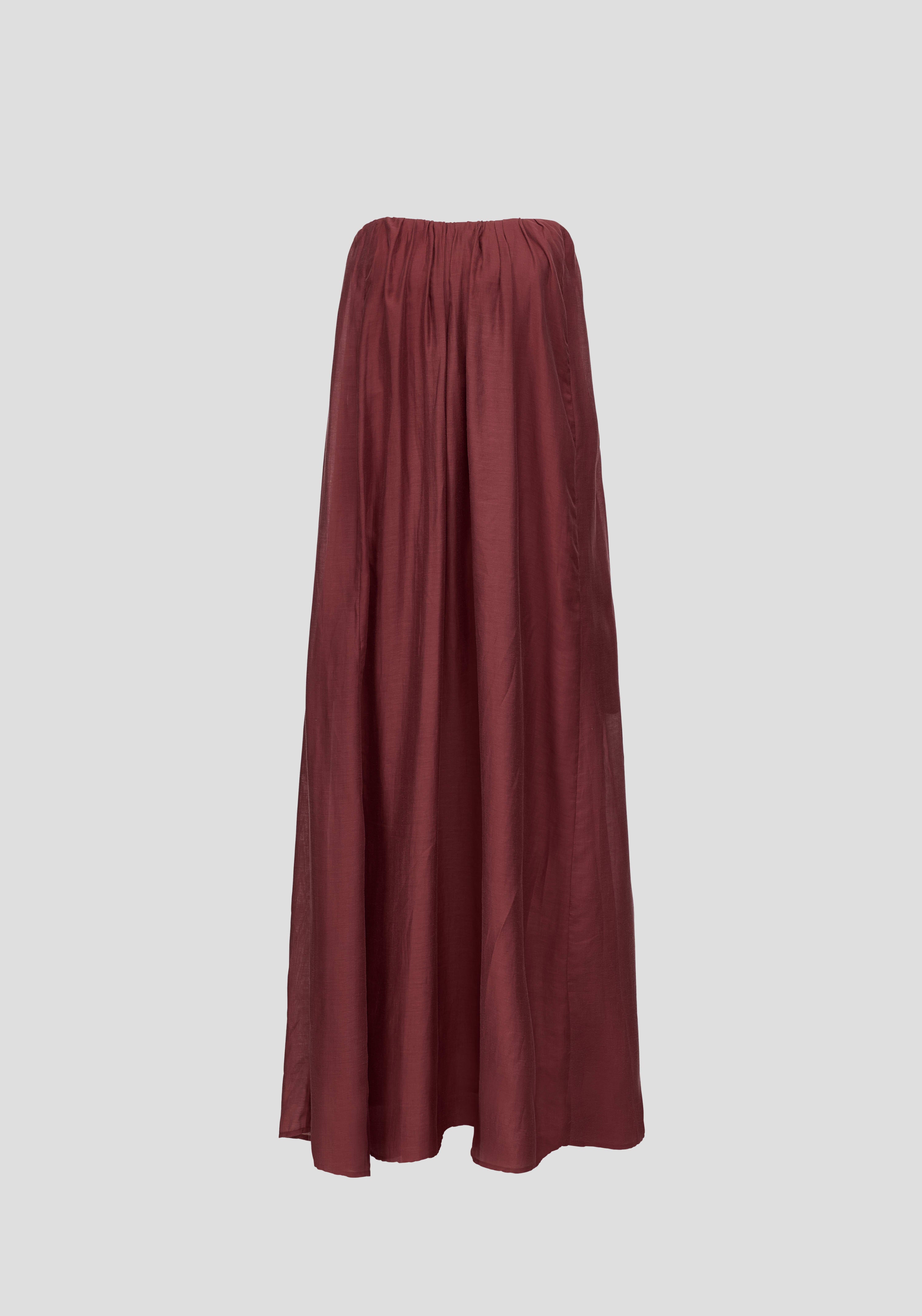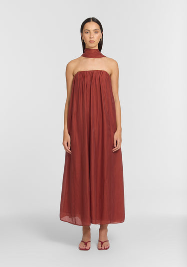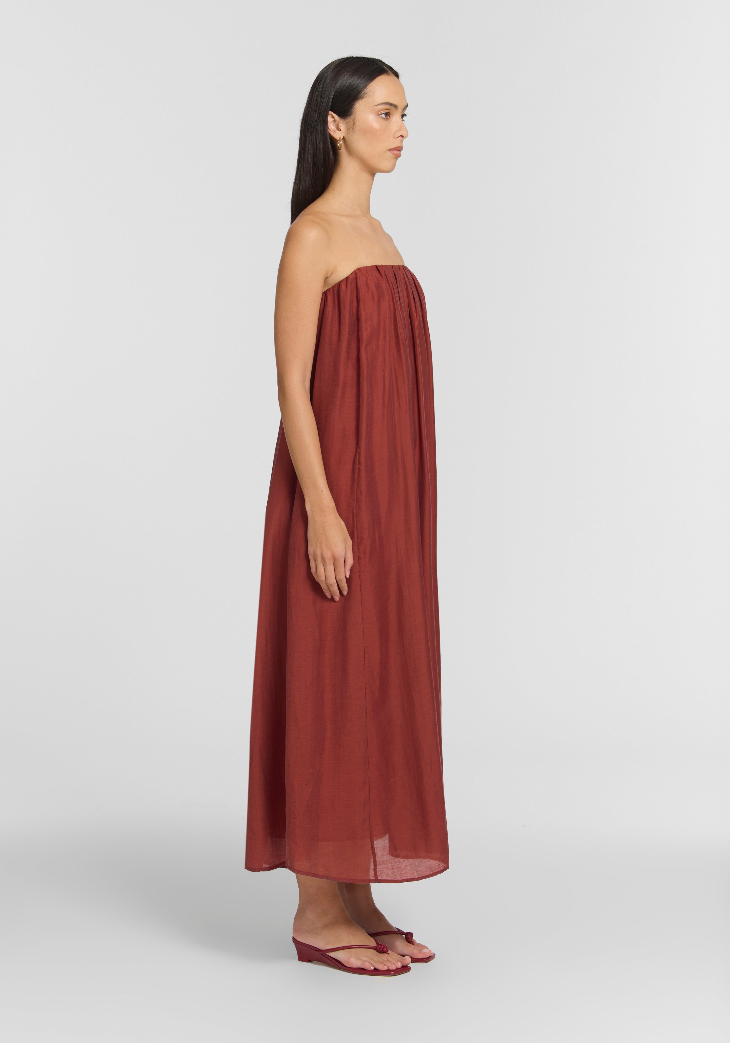 The Beaumont Dress, an expression of sculptural elegance in a deep red hue, is designed for the art of the unforgettable entrance. Showcasing a strapless, subtly gathered sweetheart neckline and a full-length A-line silhouette that sweeps with drama, it has an internal corset for a confident shape. Pair with the Vale Scarf to complete the look, perfect for a wedding guest or summer soirée.