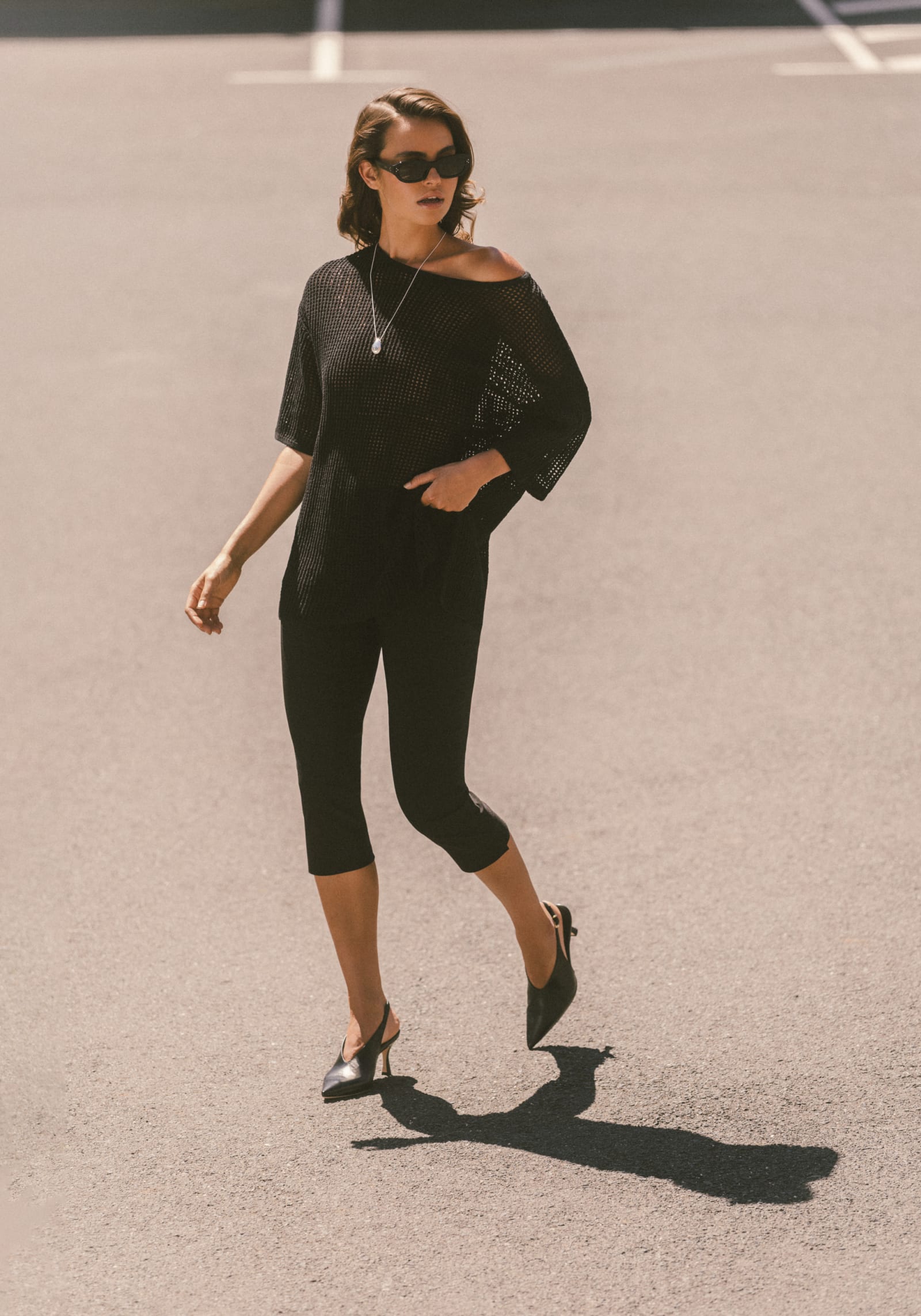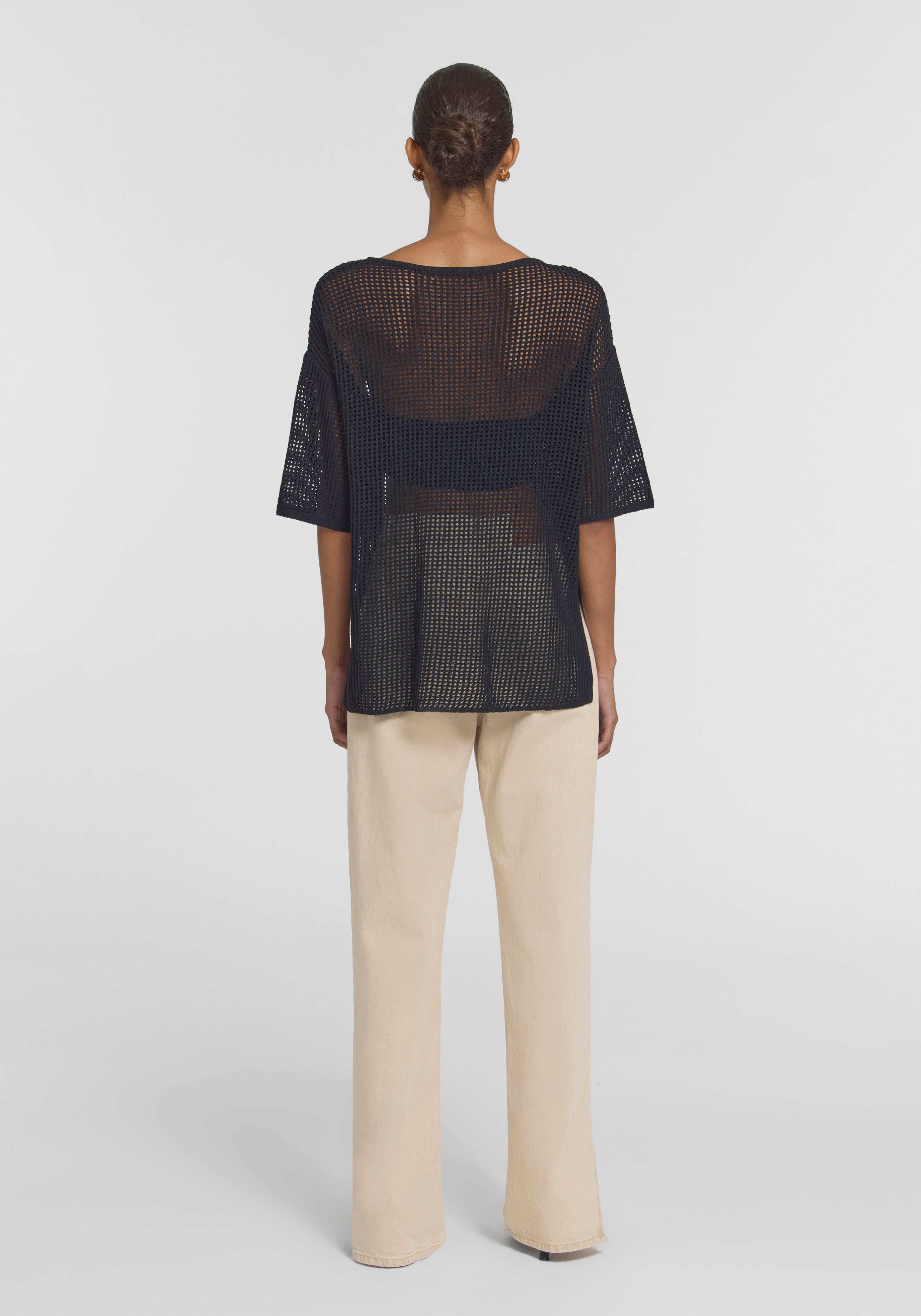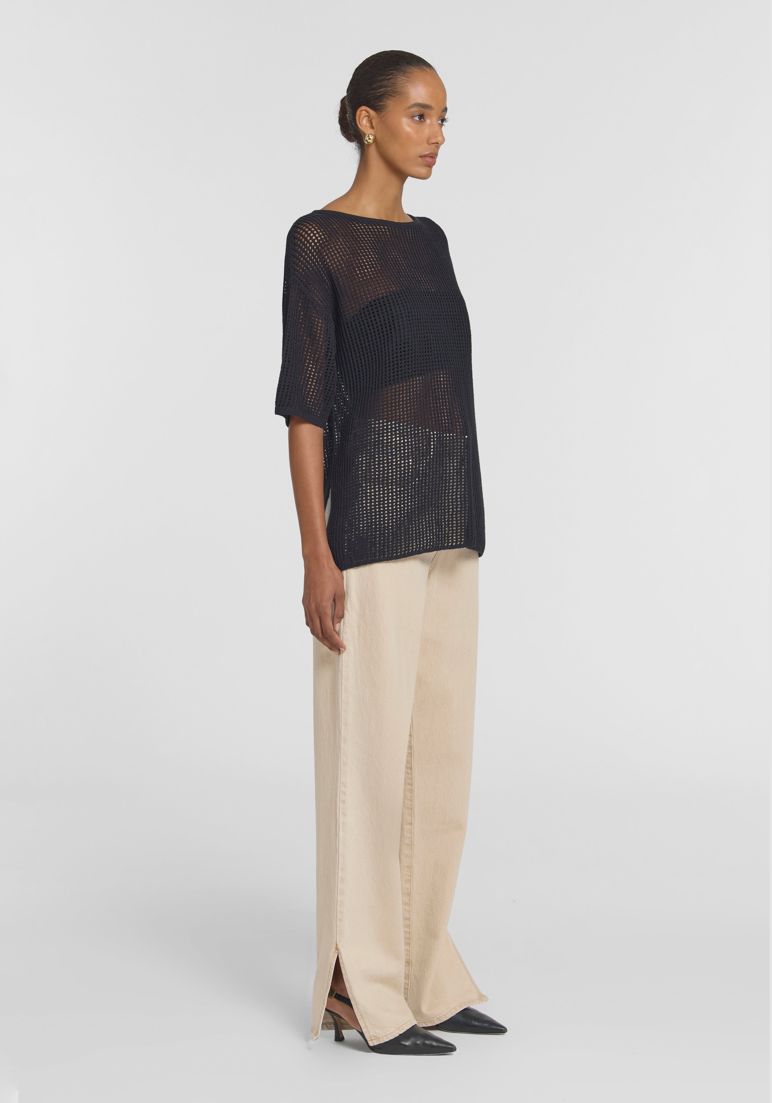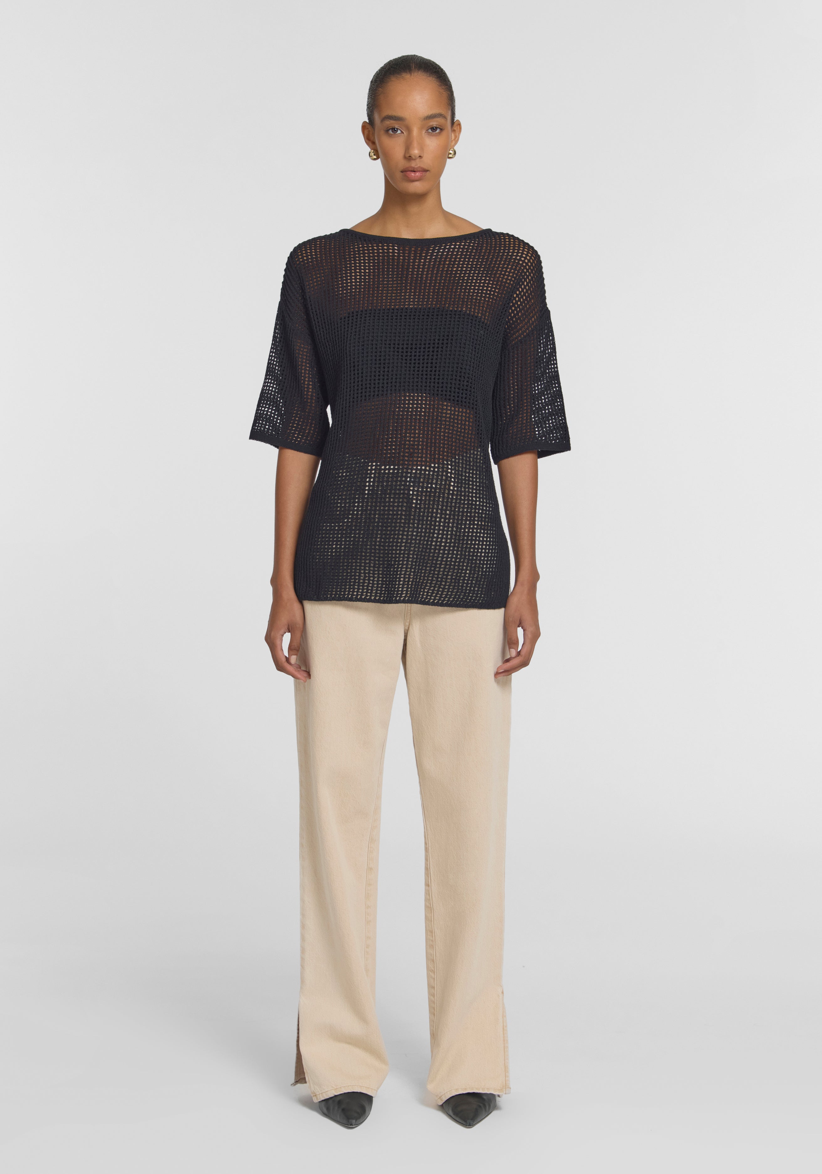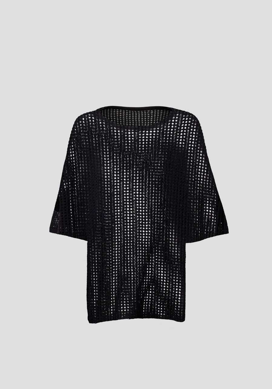 The Bedrock Top, crafted from knitted black mesh, blends sheer lightness with modern minimalism. Featuring a scooped neckline, dropped shoulders, relaxed sleeves, and high side splits, it reveals a subtle texture with fluid, sophisticated ease - capturing a sense of restorative style.