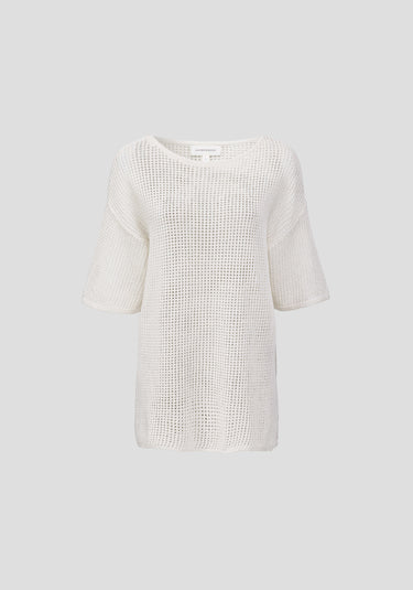 The Bedrock Top, crafted from knitted ivory mesh, blends sheer lightness with modern minimalism. Featuring a scooped neckline, dropped shoulders, relaxed sleeves, and high side splits, it reveals a subtle texture with fluid, sophisticated ease - capturing a sense of restorative style.
