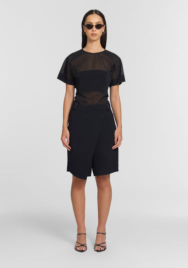 A cornerstone of the season, the Bellatrix Short is crafted from luxurious satin-back crepe in a mid-rise bermuda silhouette. Offering a modern take on minimalism with an artful, understated nuance, it features an asymmetric tailored waistband, wide-leg profile, functional pockets, and double belt loops, finished with an ivory branded pip at the back.