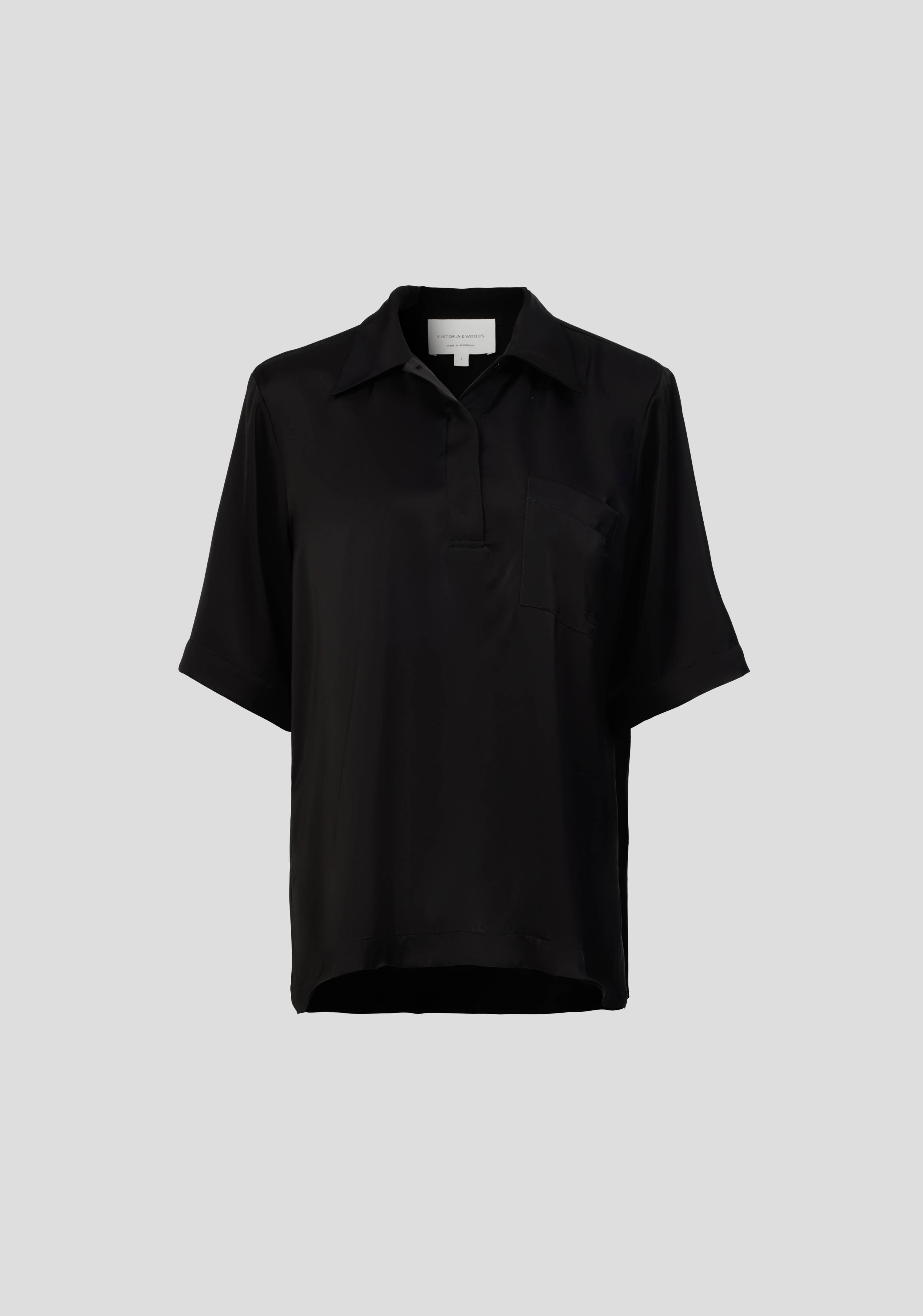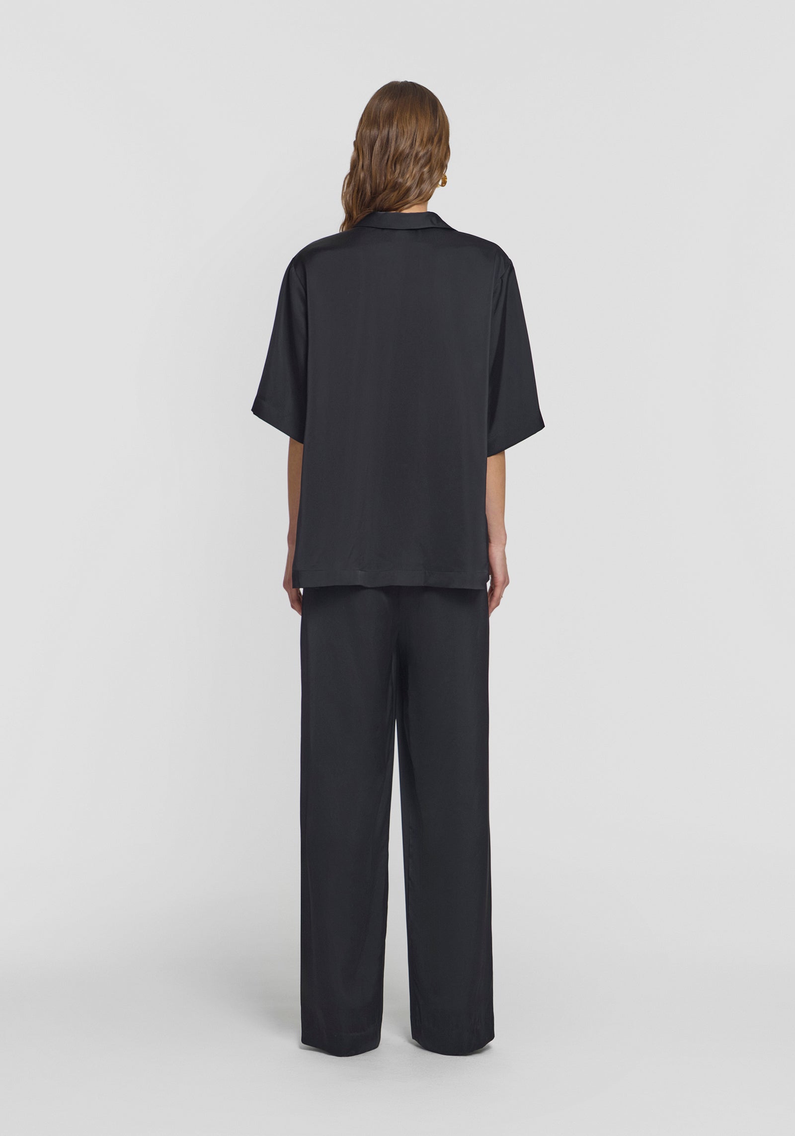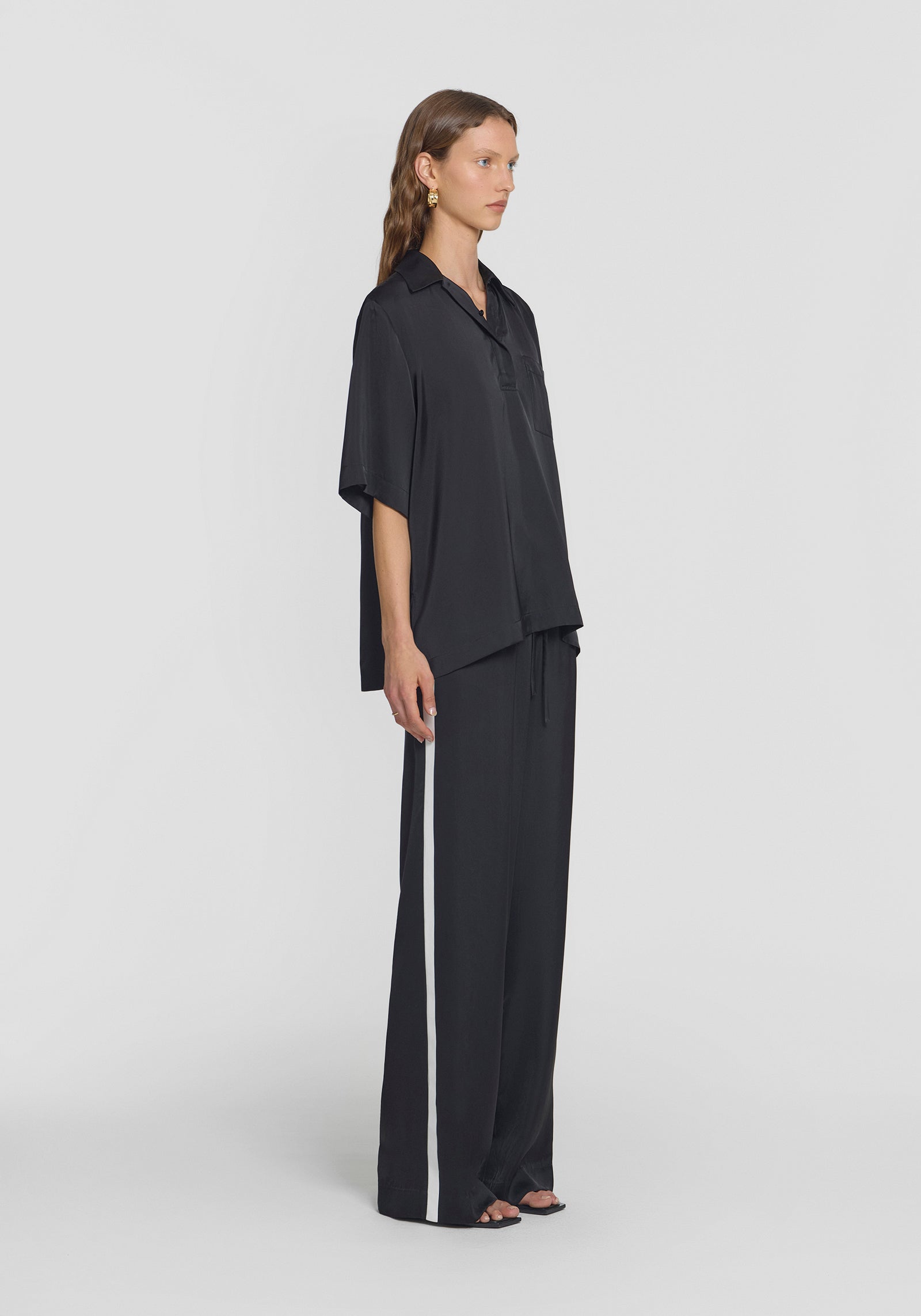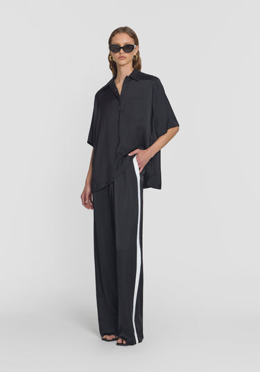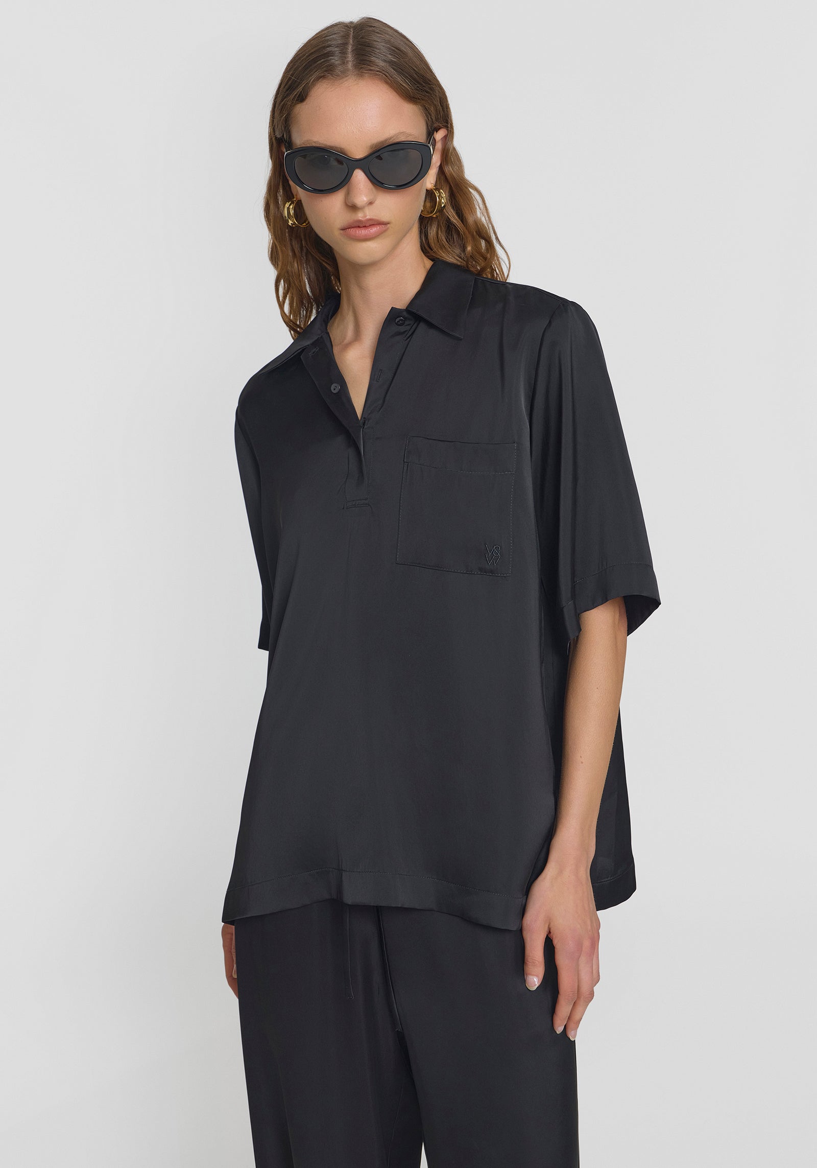 The Billy Top, crafted from lightweight black cupro, features a relaxed oversized silhouette with a patch pocket adorned with V&W embroidery. Designed with a functional button placket, it pairs effortlessly with the Rocky Pant for chic set dressing that seamlessly takes you from day to night.