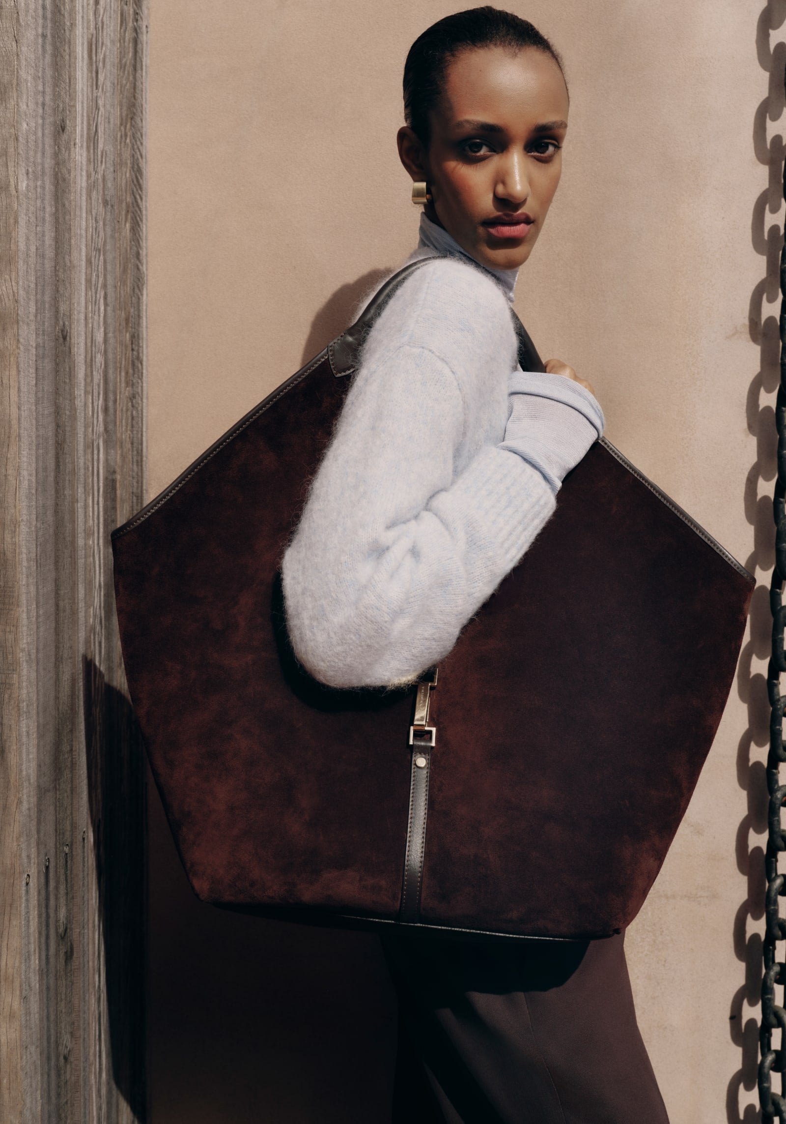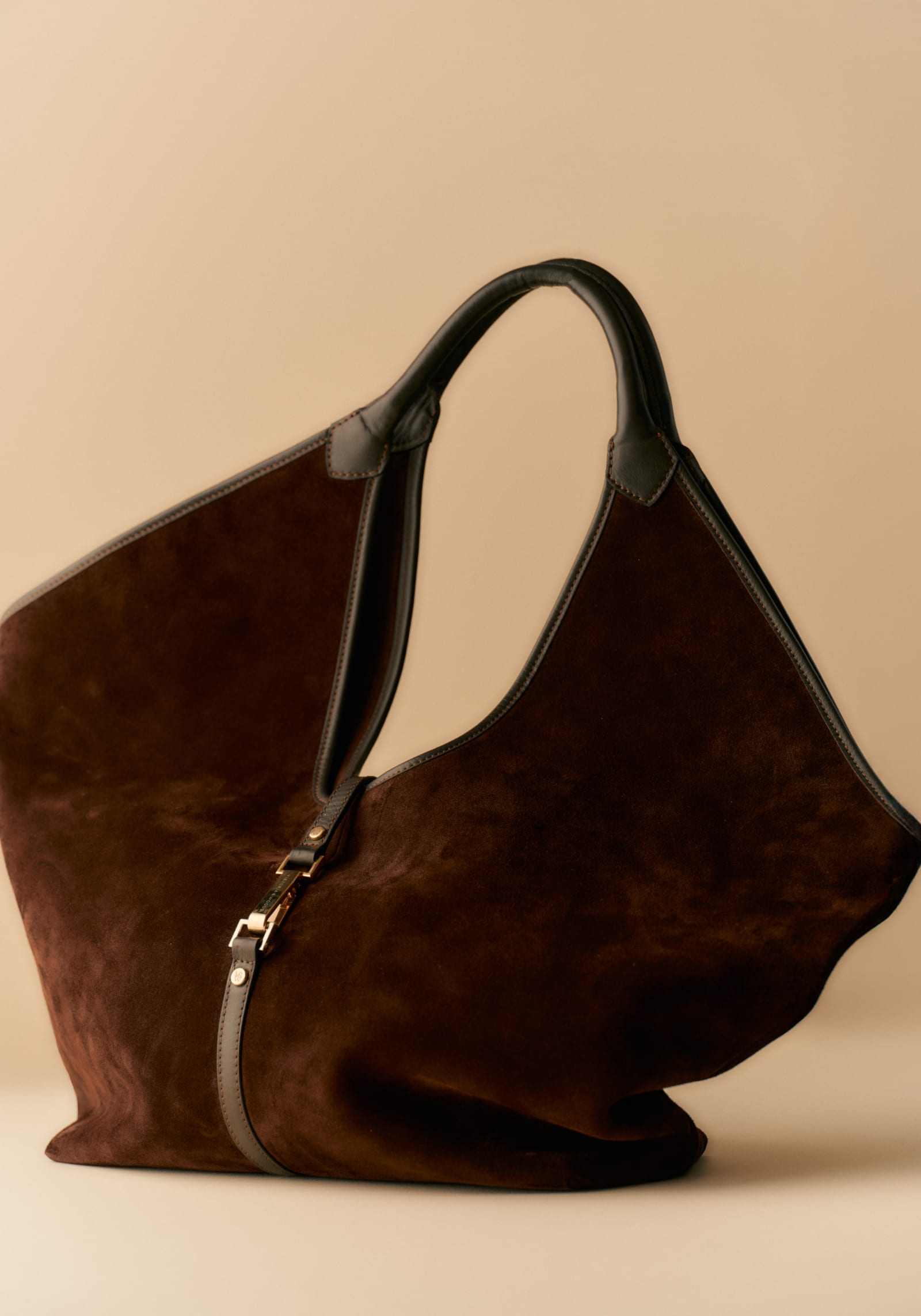 Complete your look with the Blake Bag, crafted from elevated brown suede and trimmed with dark brown details. Made from nappa leather, this large, trapezium-shaped bag features a branded strap clip and tubular shoulder straps. The must-have accessory of the season, perfect for both work and weekend wear.