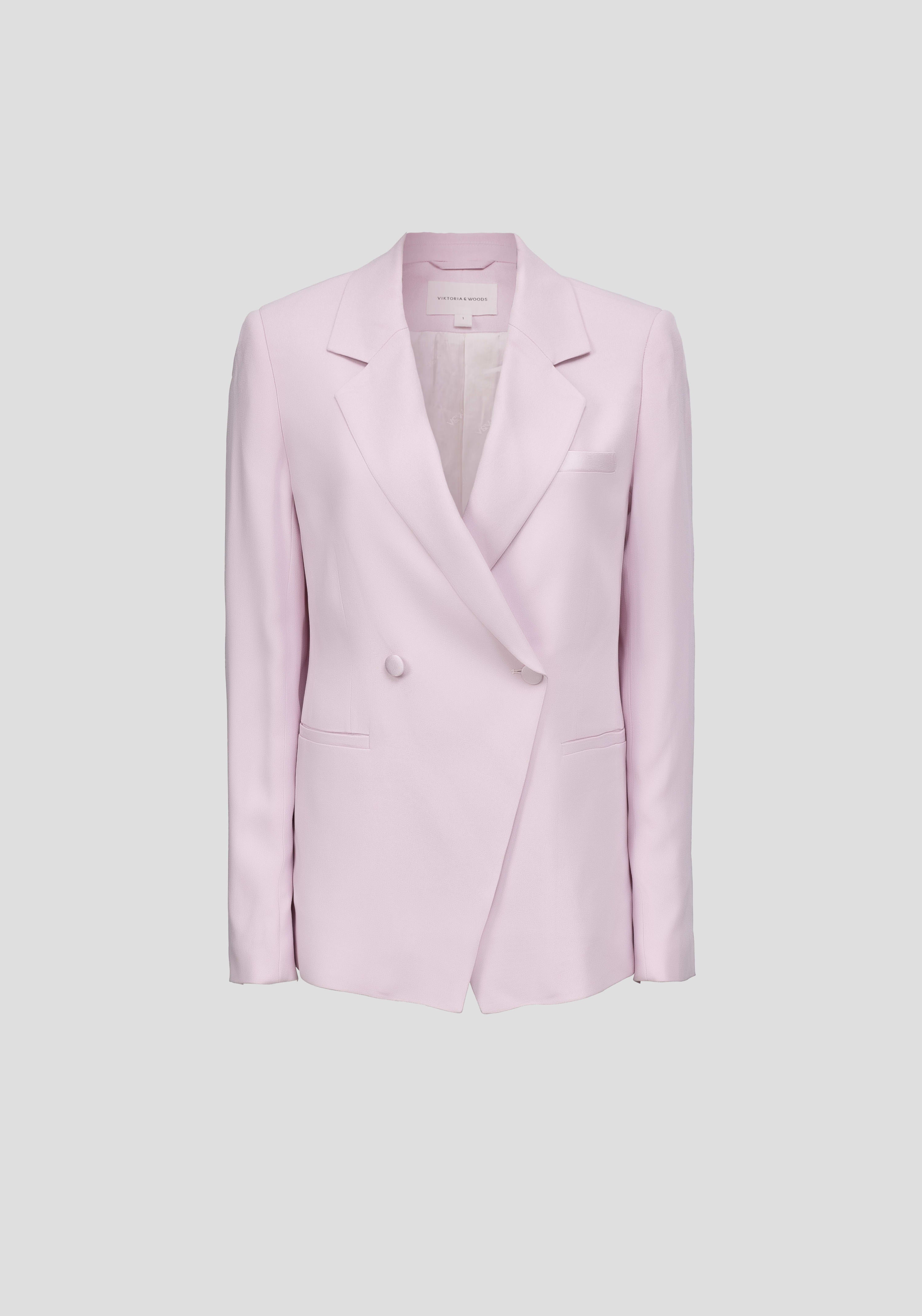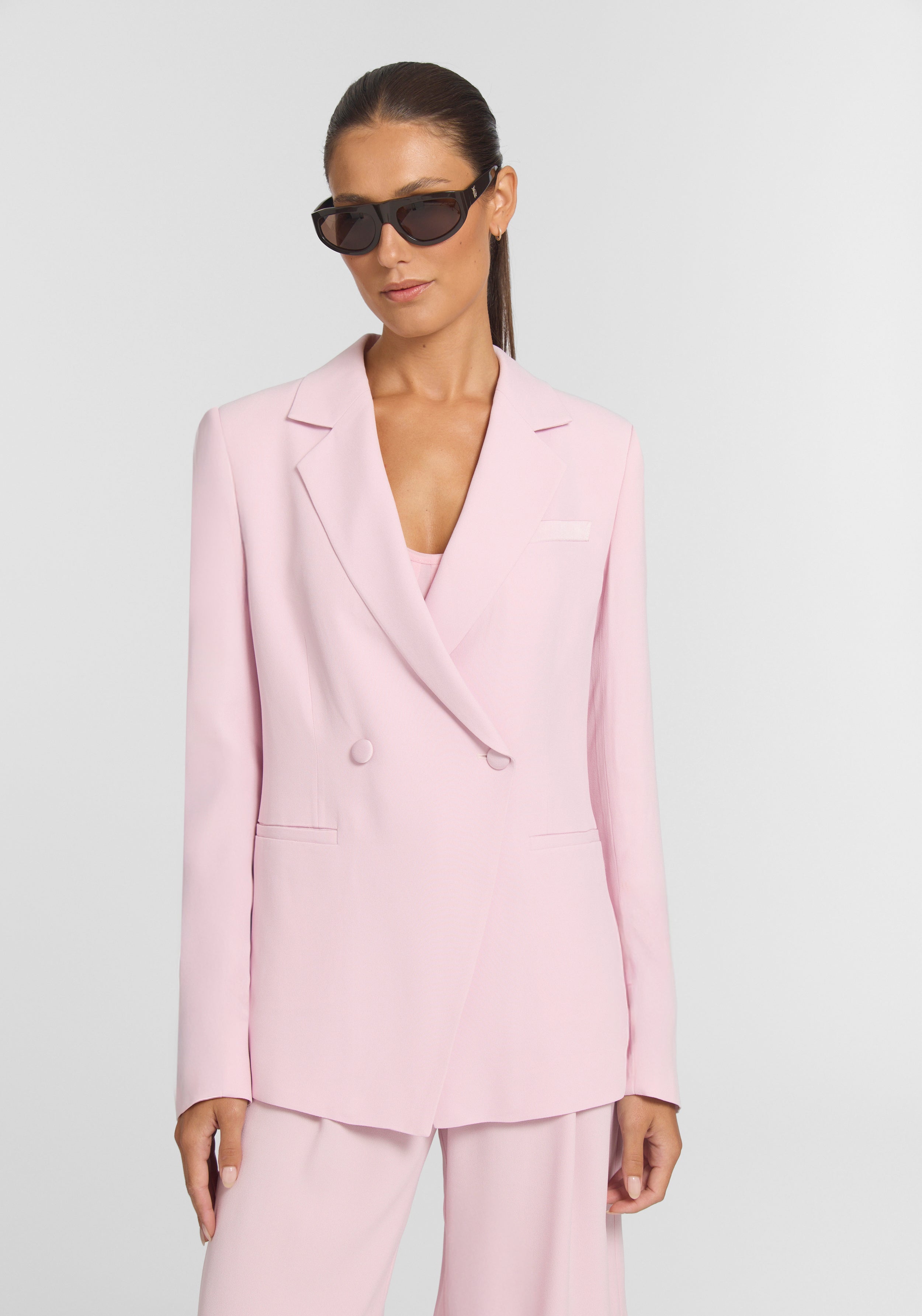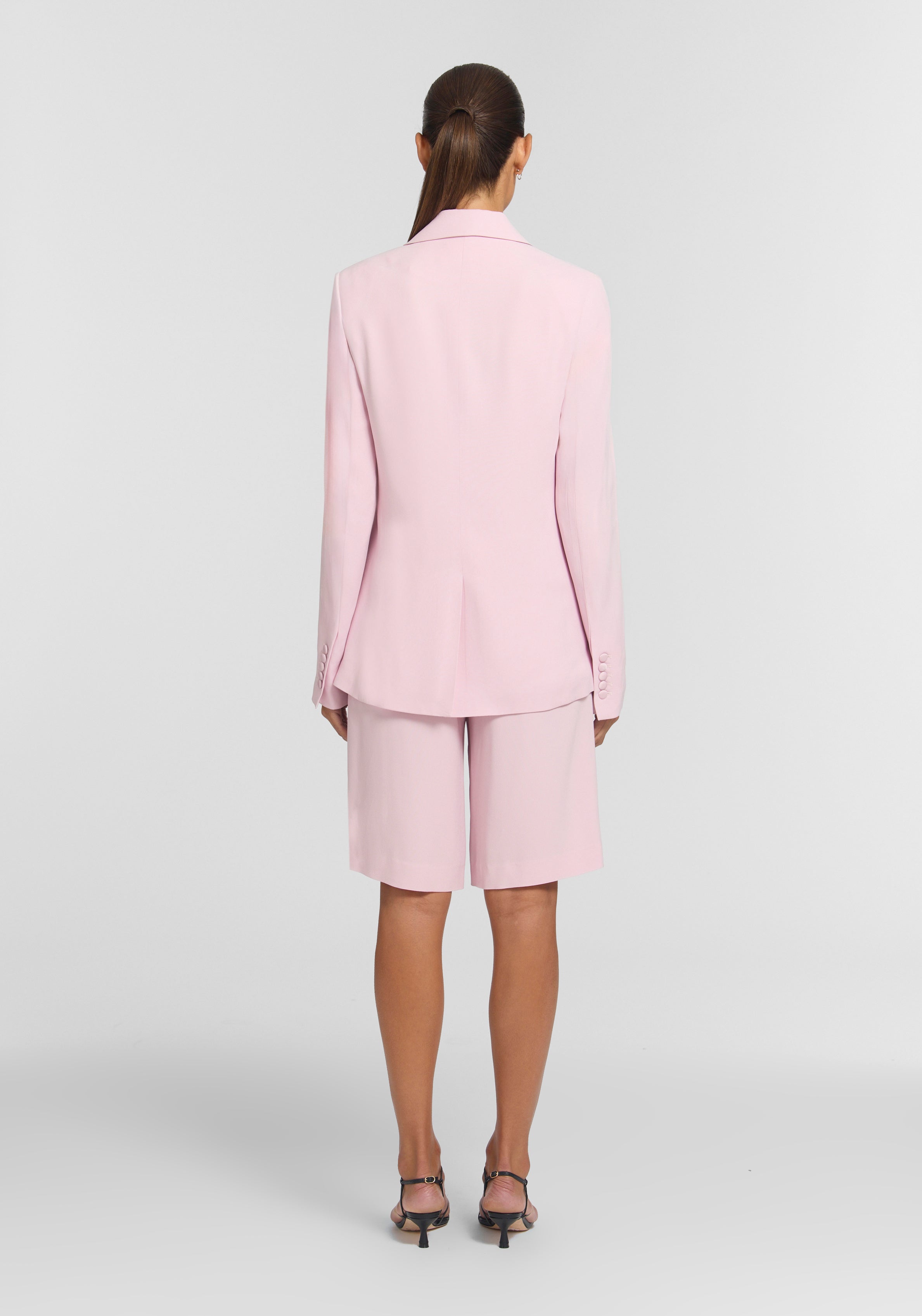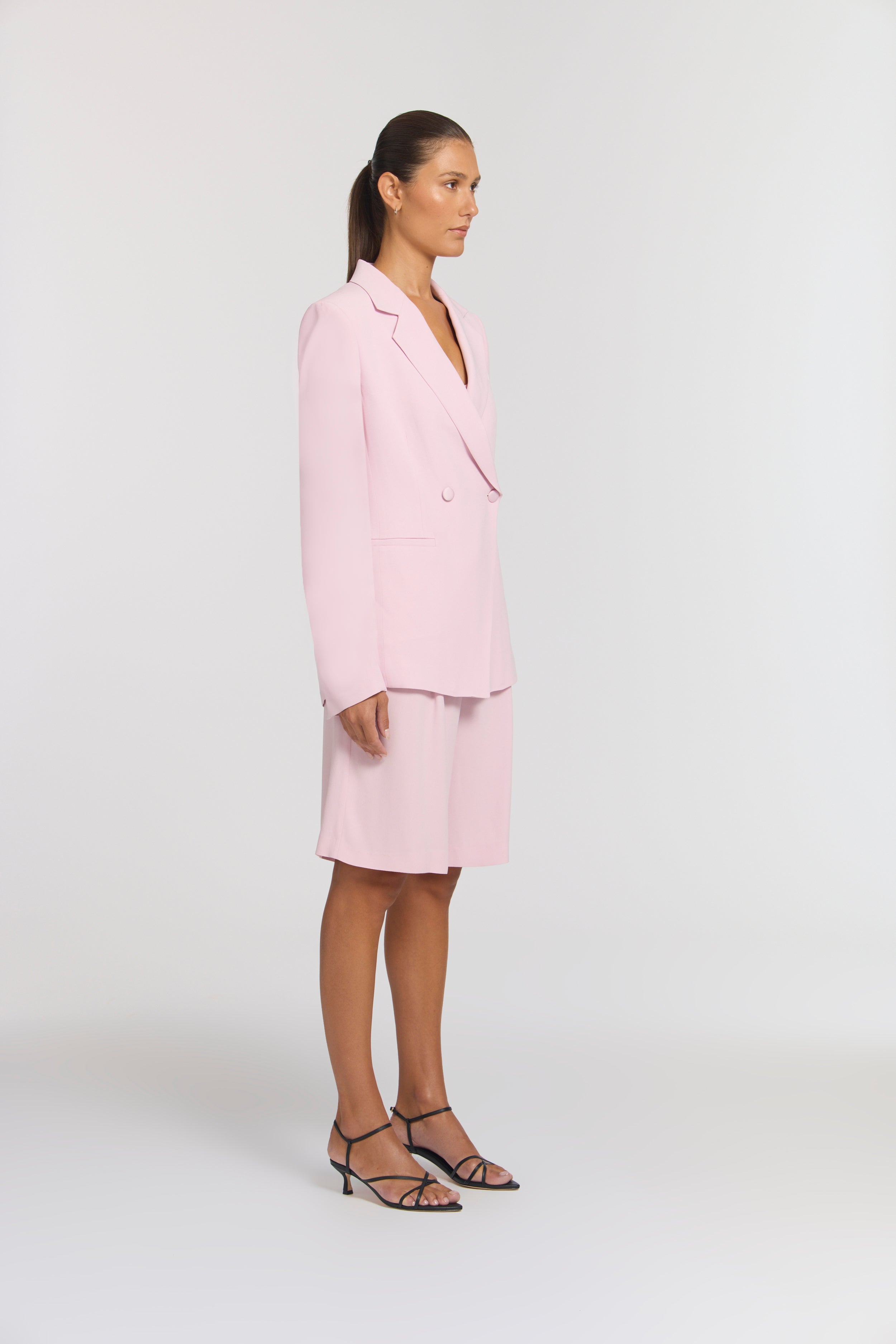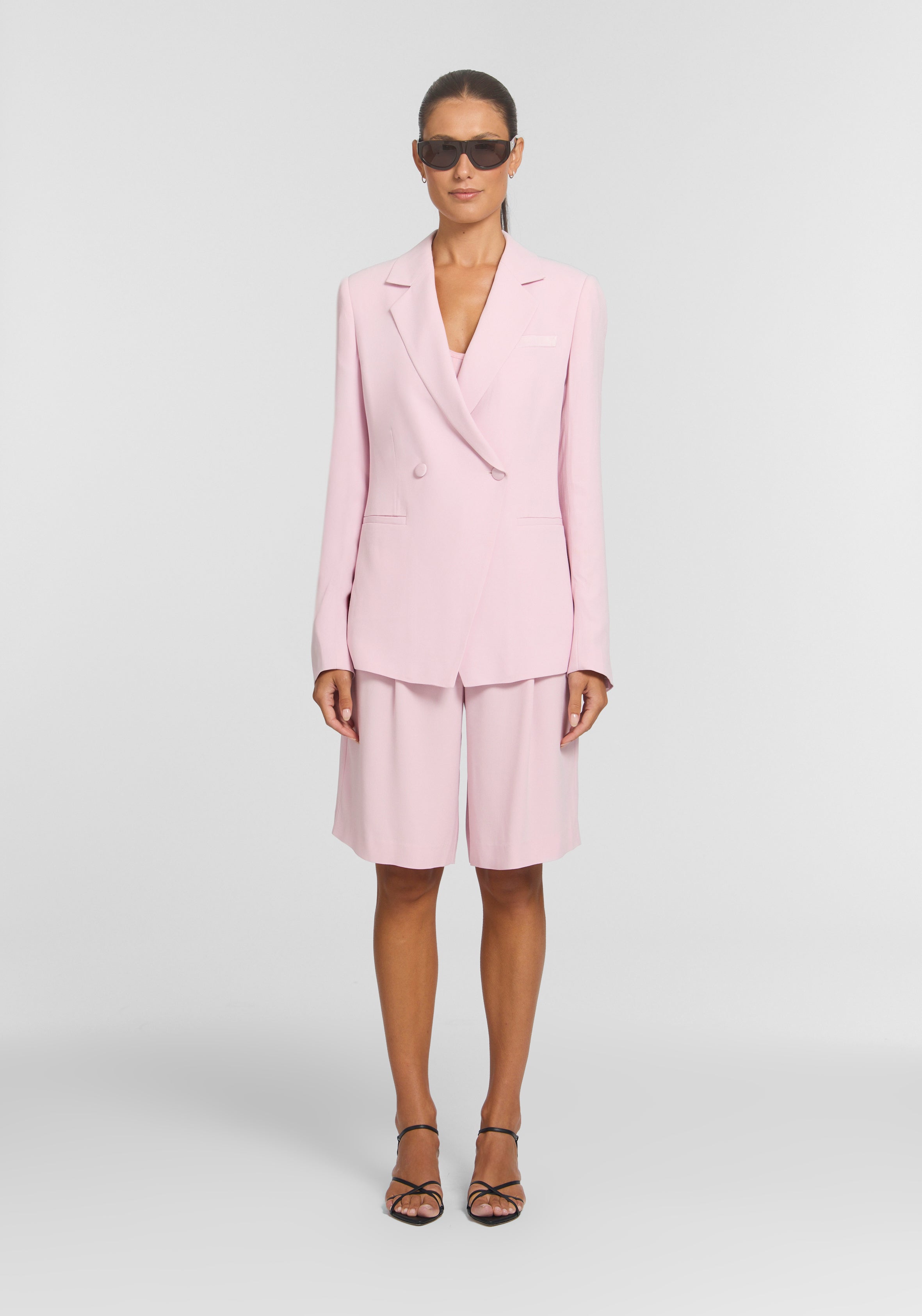 Transform your tailoring with the Bombshell Blazer, crafted in rosewater pink from luxurious satin-back crepe. Its clean, sharp silhouette features a double-breasted front, notched collar, chest and welt pockets, and a centre-back vent. Pair with the Monologue Short and Wanderlust Bustier in the matching hue for a look that embodies signature tailoring - perfect for elegant occasion dressing or a refined resort wardrobe.