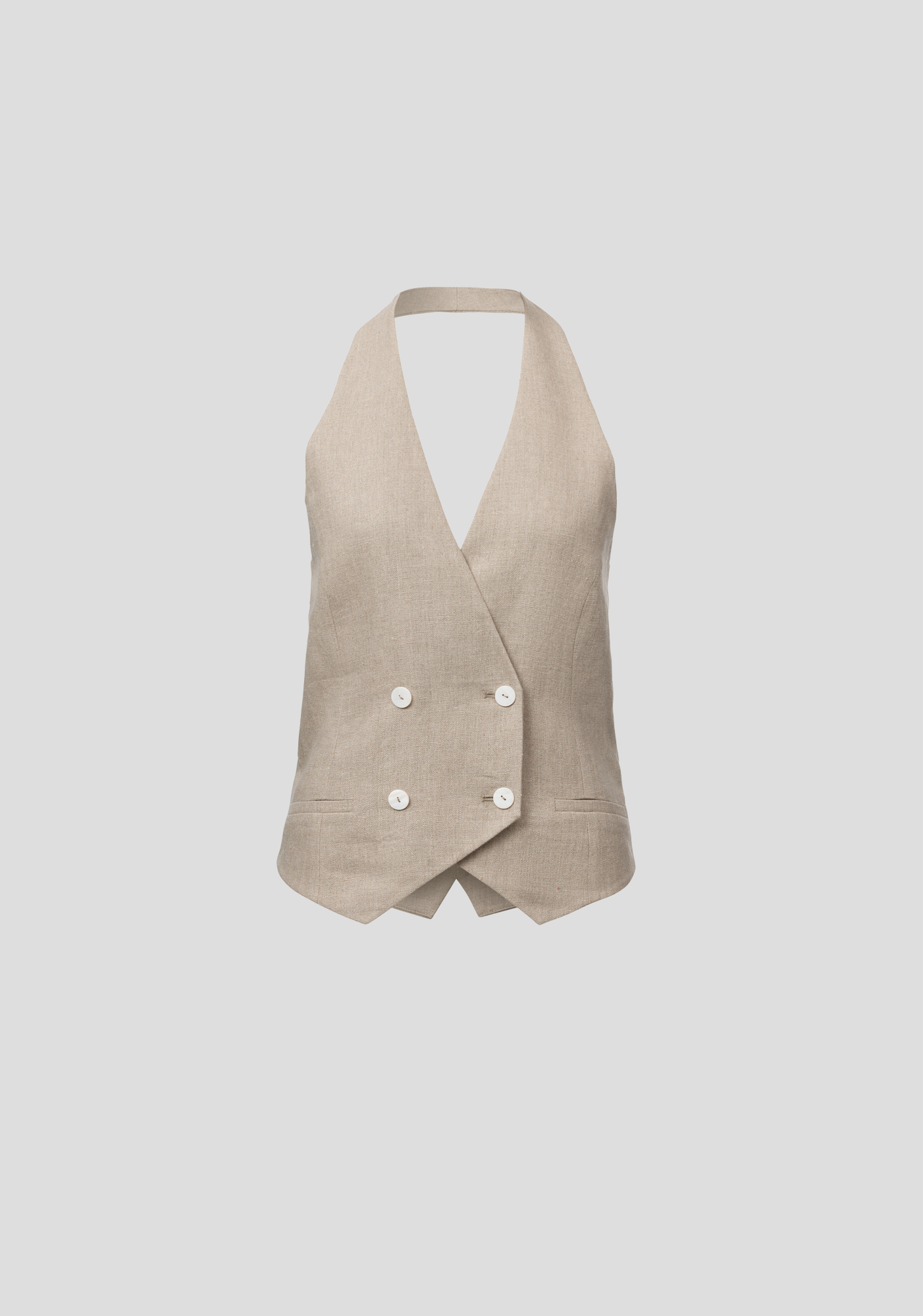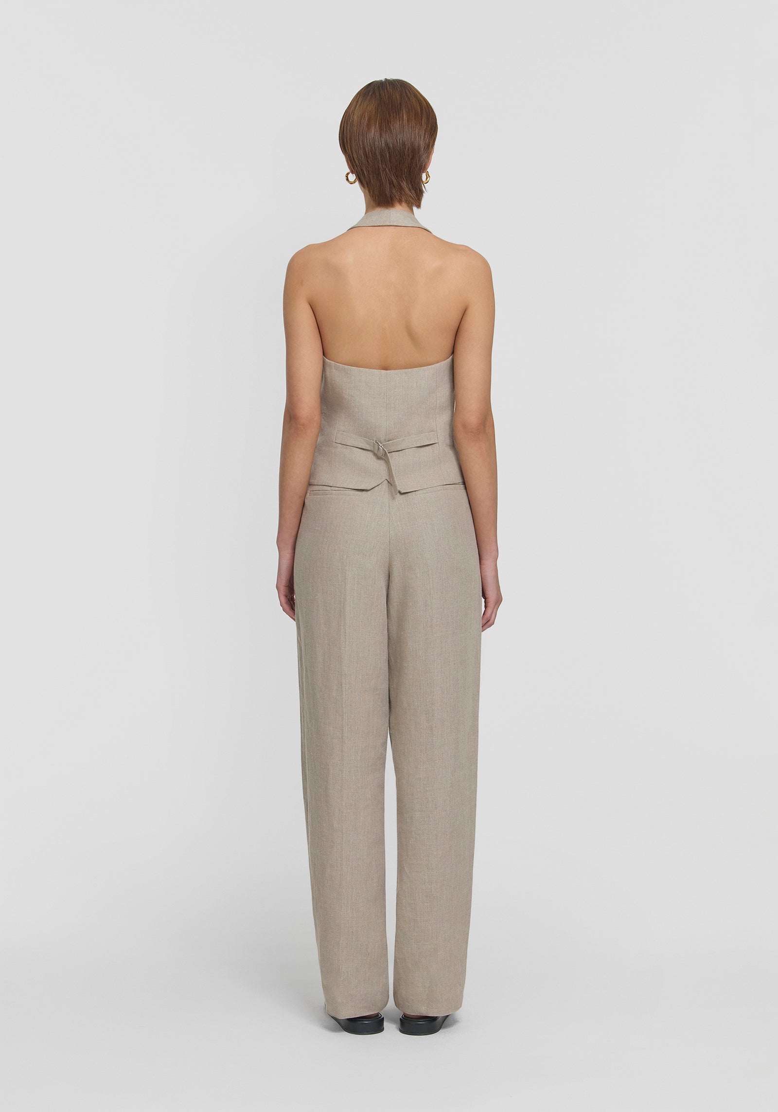 Elevate your wardrobe with the Cadence Vest, a halter-style design featuring a double-breasted front and ivory shell buttons. Crafted from luxurious natural oatmeal linen, it includes an adjustable back waist tab and refined front welt pockets. Pair it with this season’s oatmeal-hued pieces for a chic, effortless take on tonal set dressing.