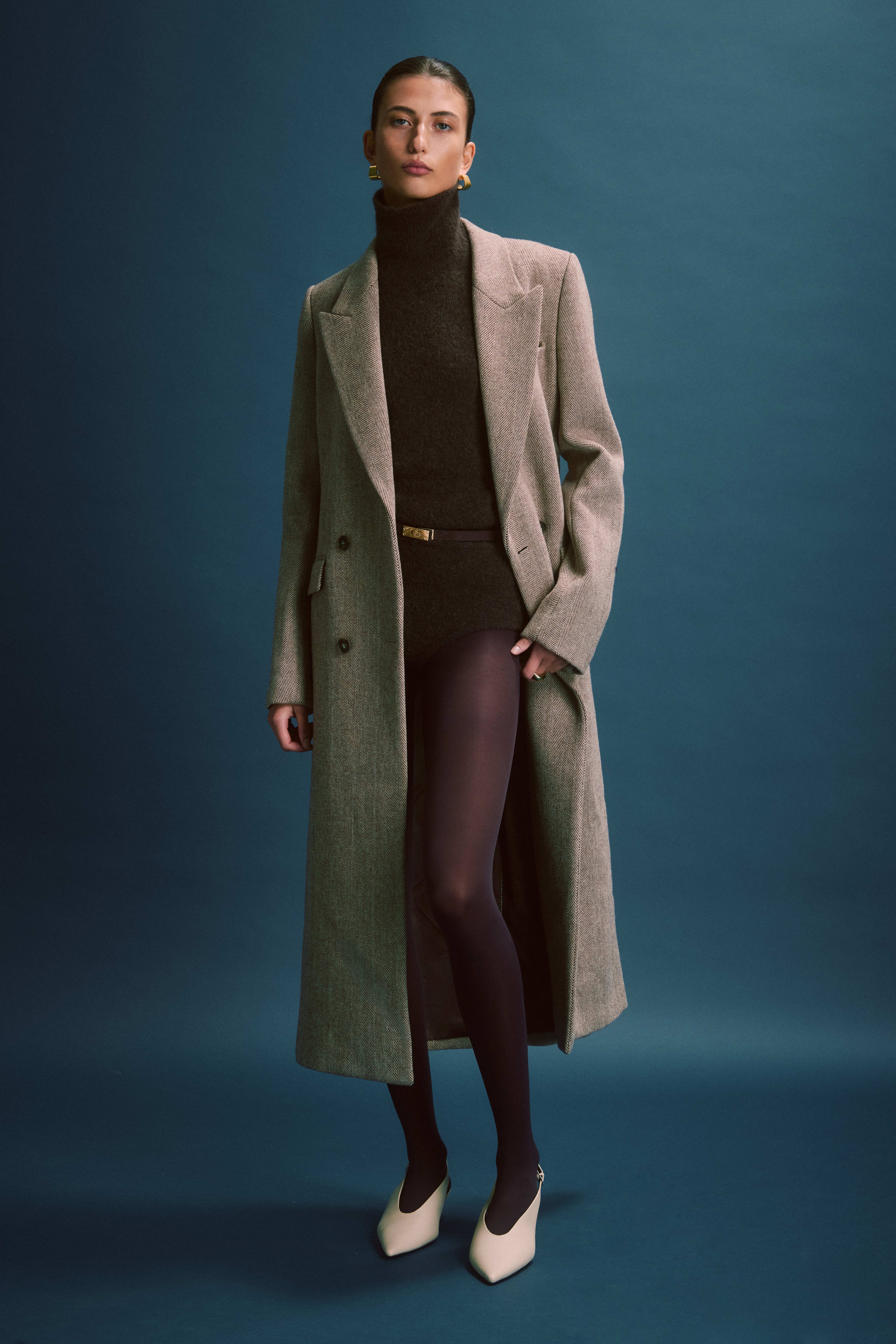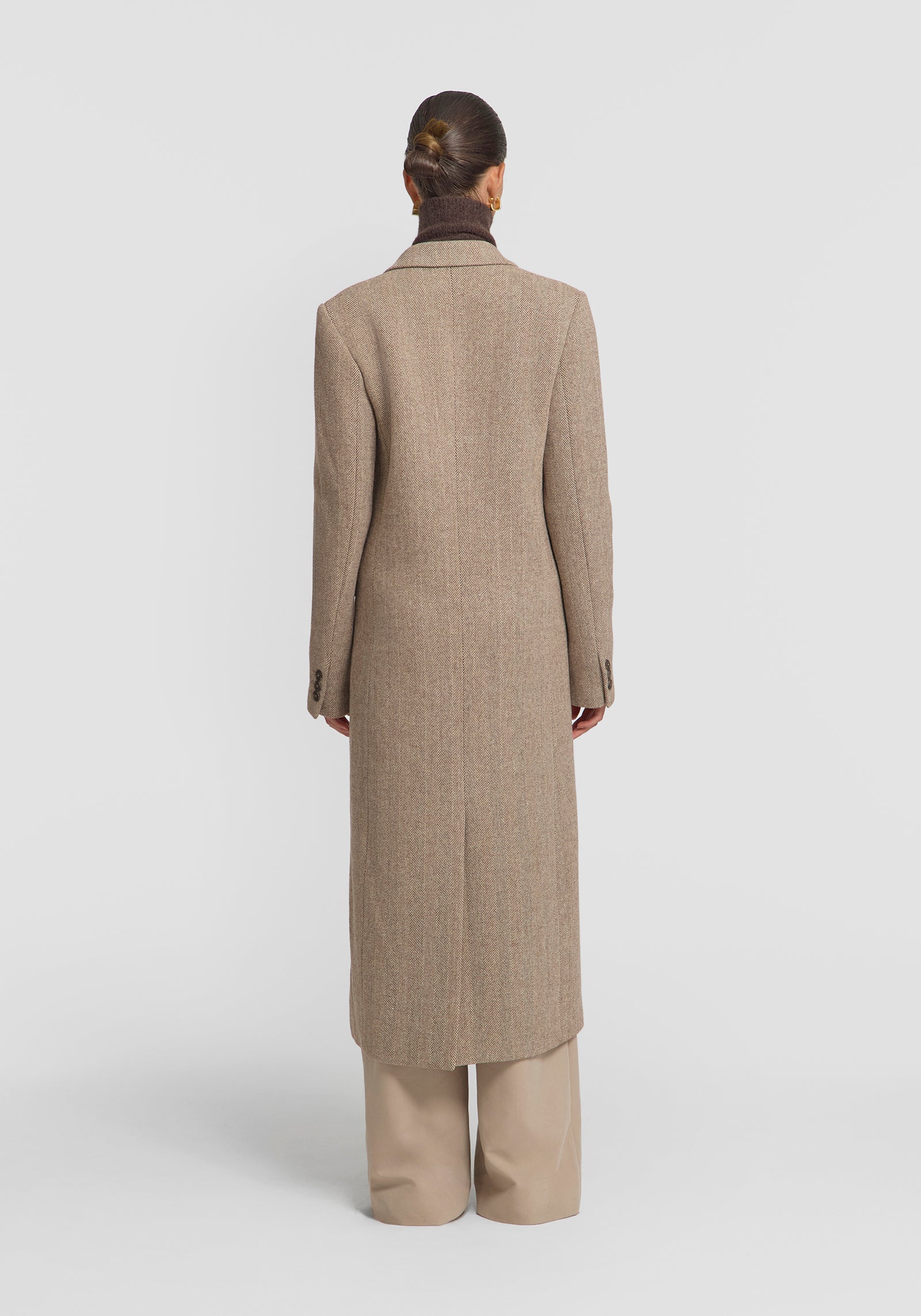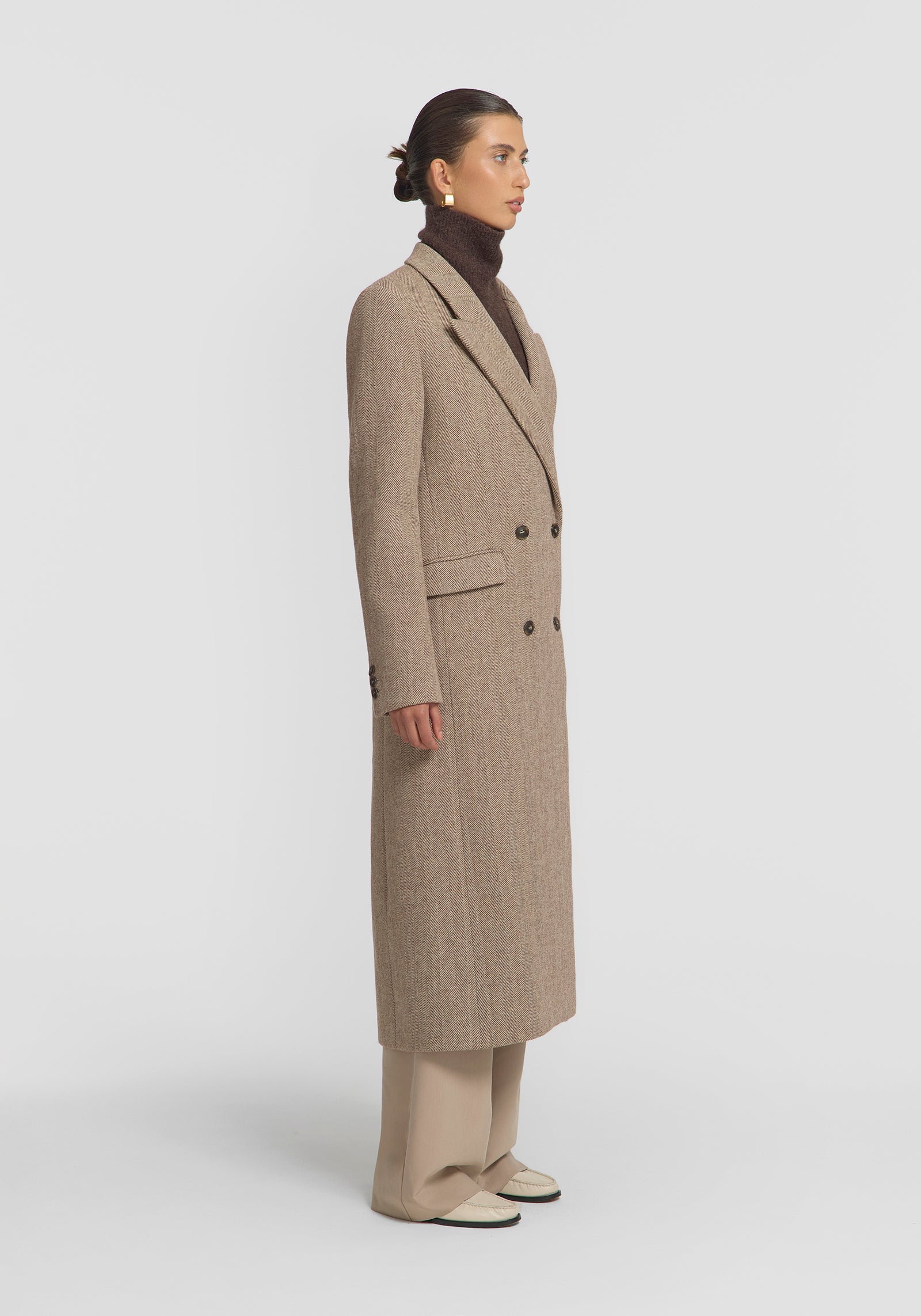 A hero for your winter capsule wardrobe, the Cigarillo Coat is crafted from a luxurious Italian wool blend herringbone fabrication. Inspired by classic menswear tailoring, it features a double-breasted design, straight waistline, peak collar, shoulder pads, and logo buttons. Crafted for life, this standout outerwear piece effortlessly elevates your everyday essentials.