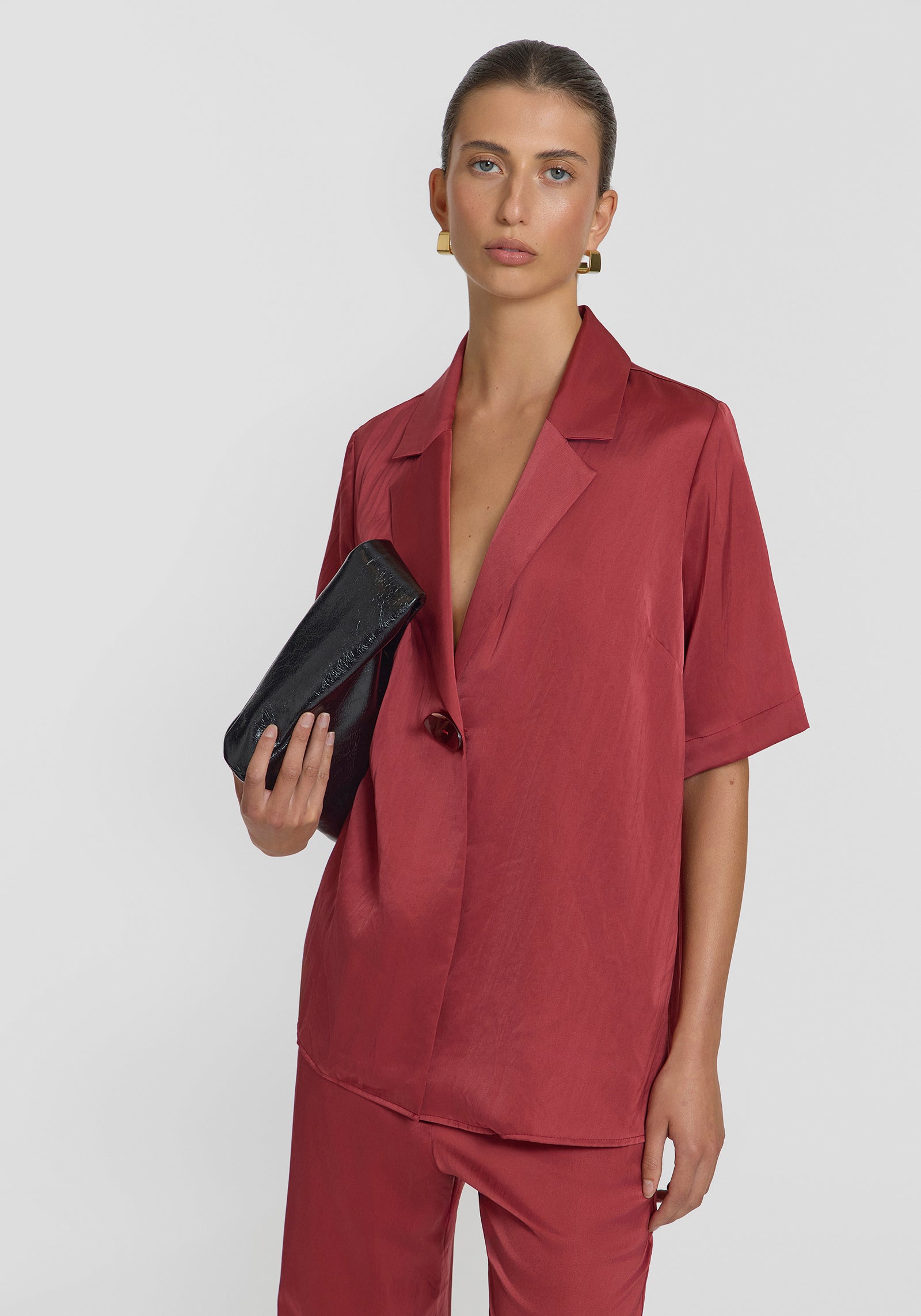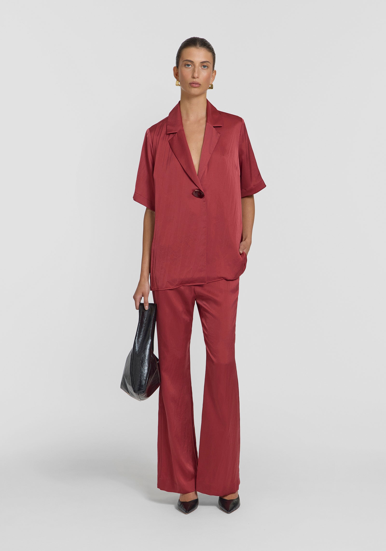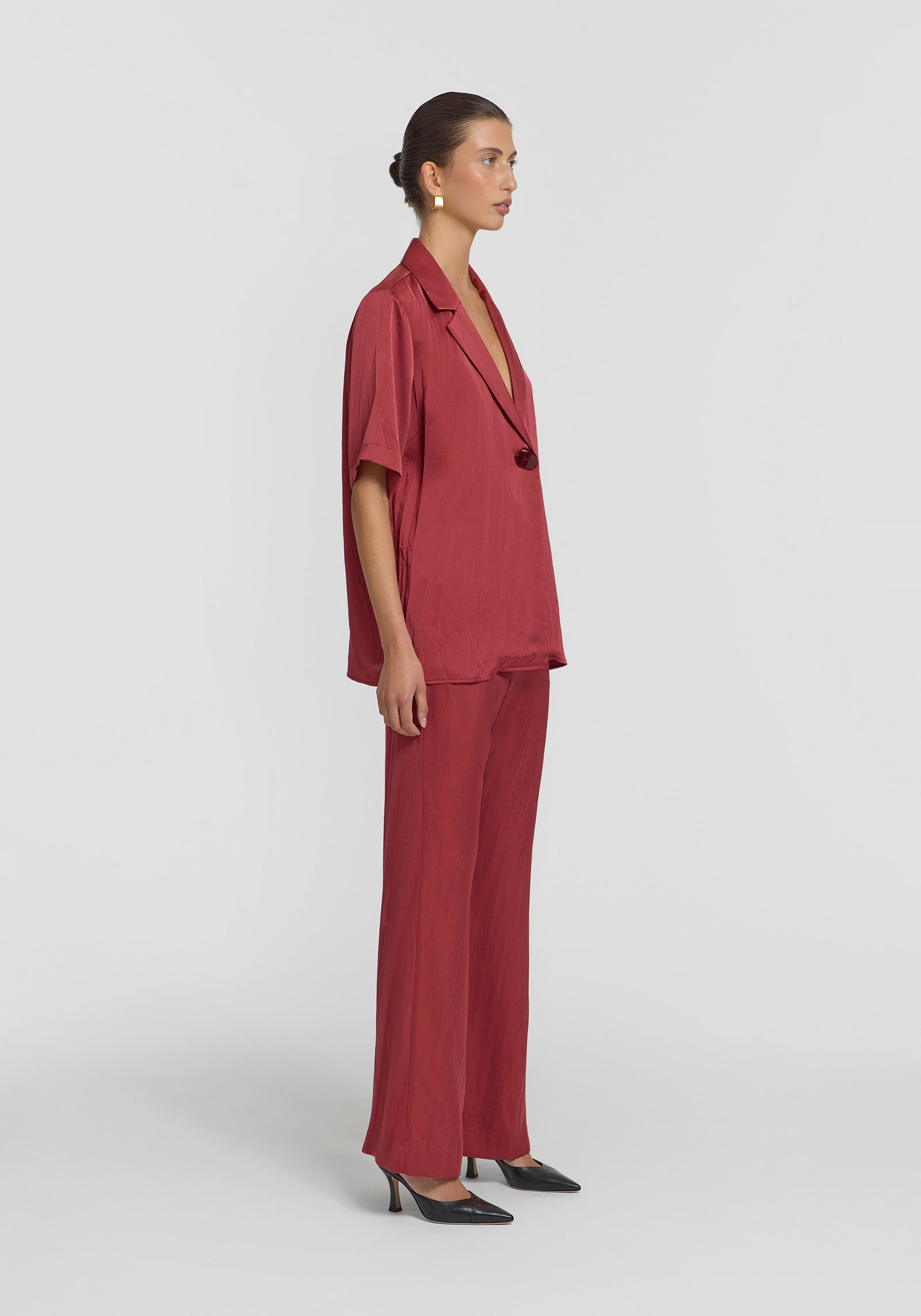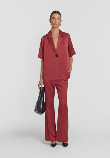 Introducing the Concert Shirt, a reimagined take on our iconic Chorus Shirt tailored in luxurious deep red lightweight cupro. This iteration is elevated with a refined matching resin button and subtly sharper collar and lapel points, perfectly complementing its relaxed silhouette. Pair it with tailored separates for a balanced look, or complete the ensemble with the Deluxe Pant in the matching hue for an air of quiet luxury.
