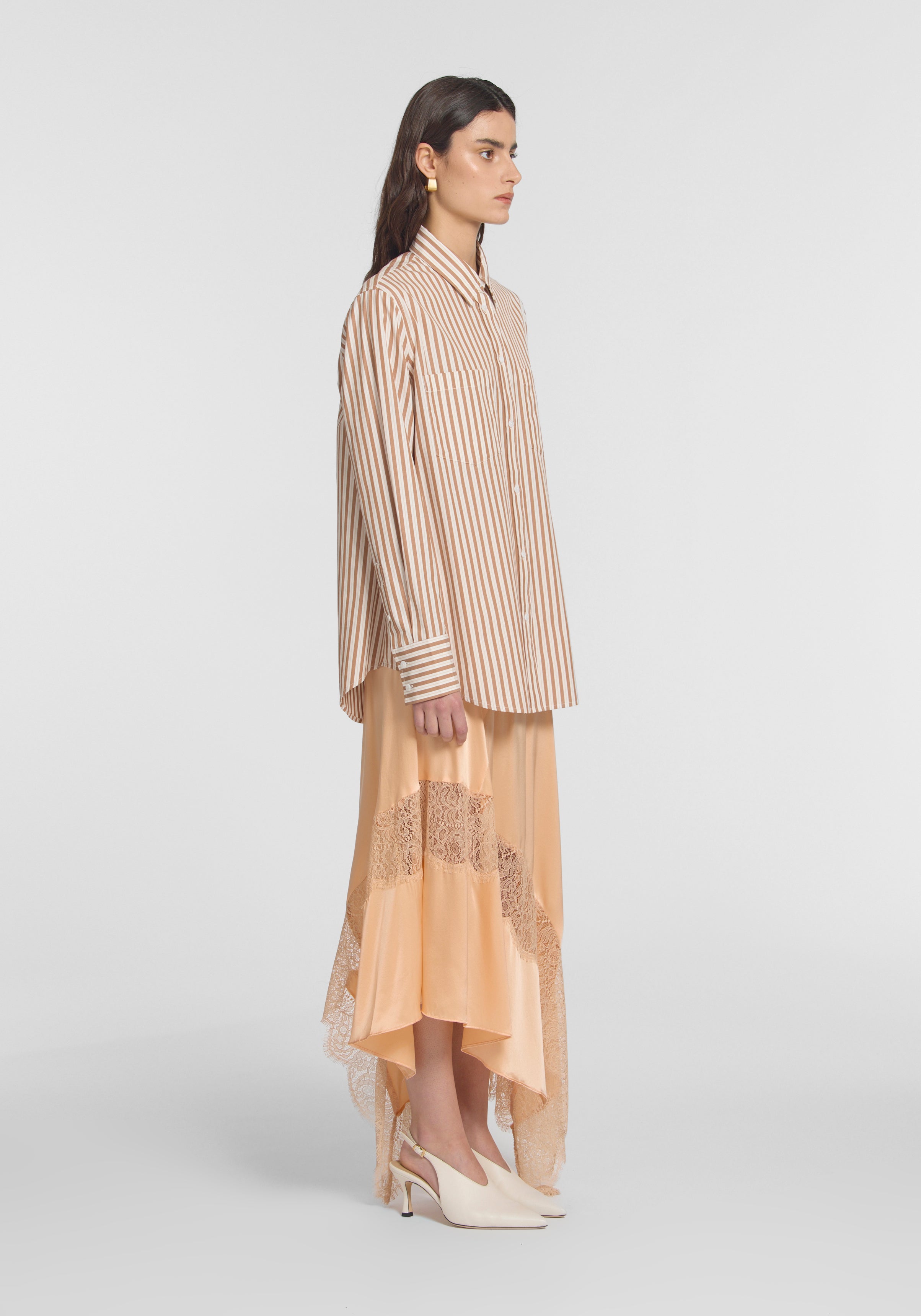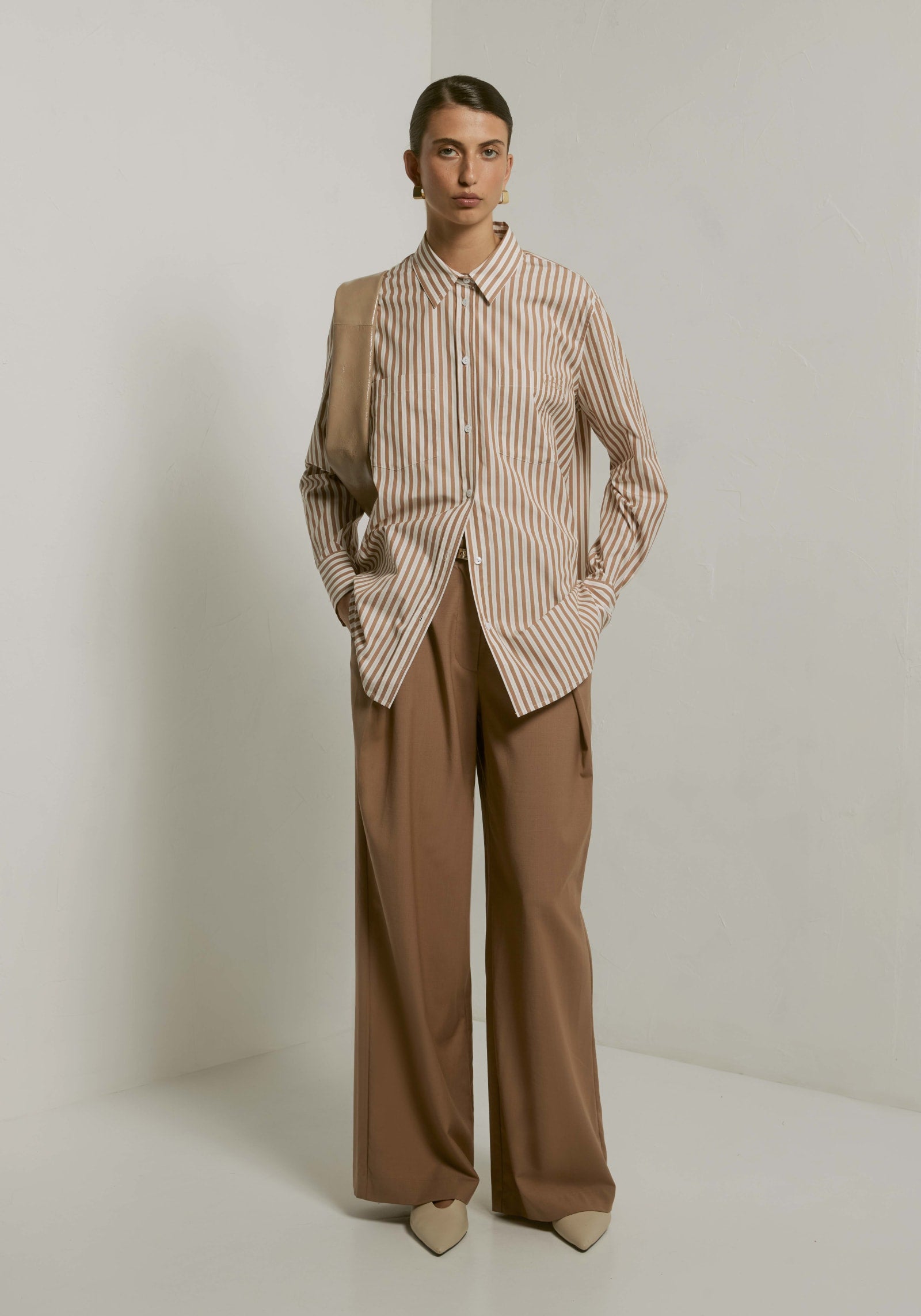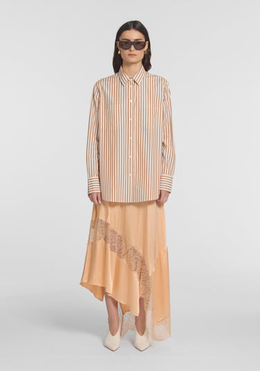 The Convent Shirt, crafted from cotton in a light brown stripe, is your new staple stripe shirt. With a traditional placket, collar, and relaxed fit, it features signature details - logo buttons, WOODS embroidery, and an optional wrap secured with a side seam button. Pair back with this season’s light brown or apricot hues for a striking fusion of feminine and edgy silhouettes.