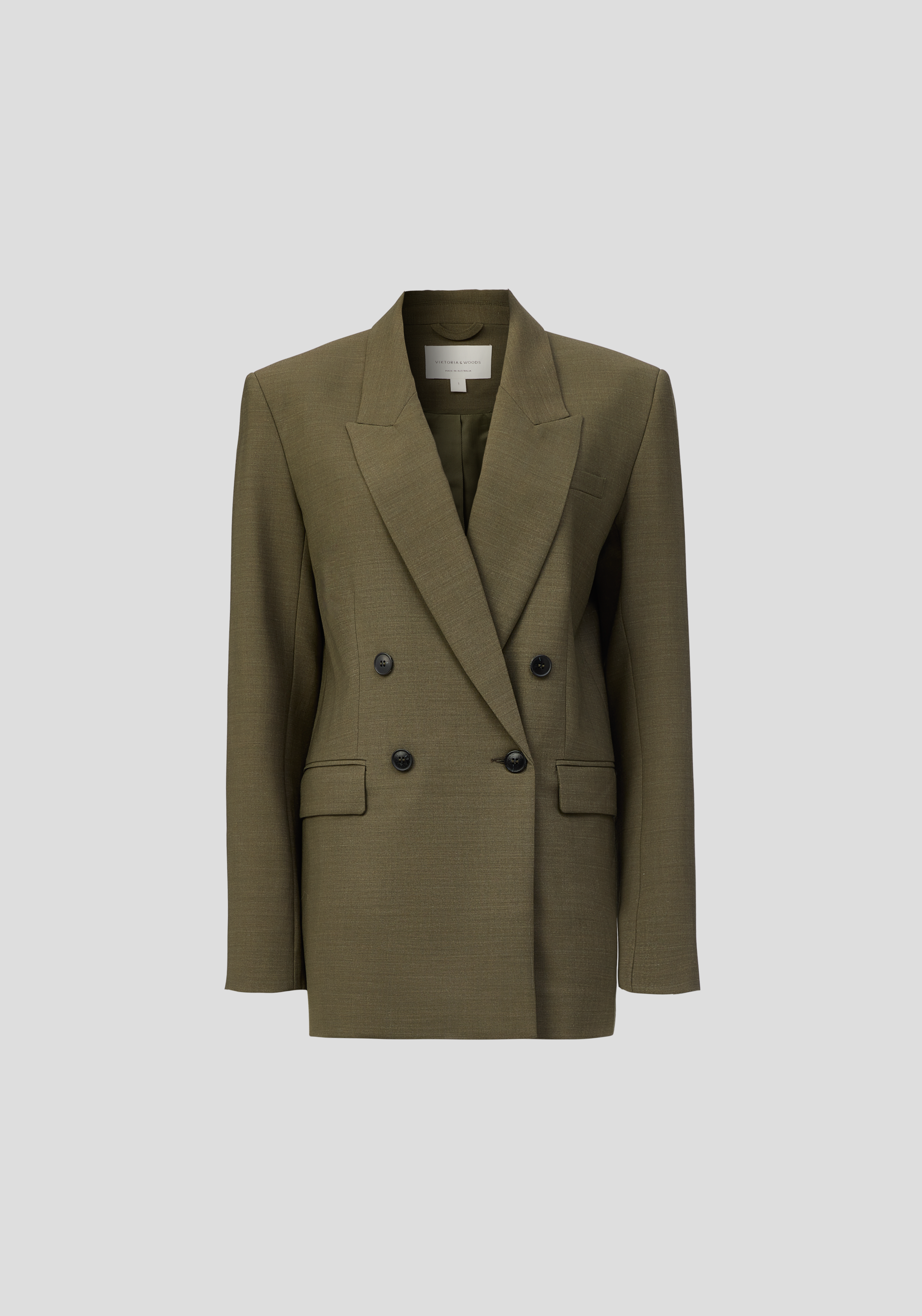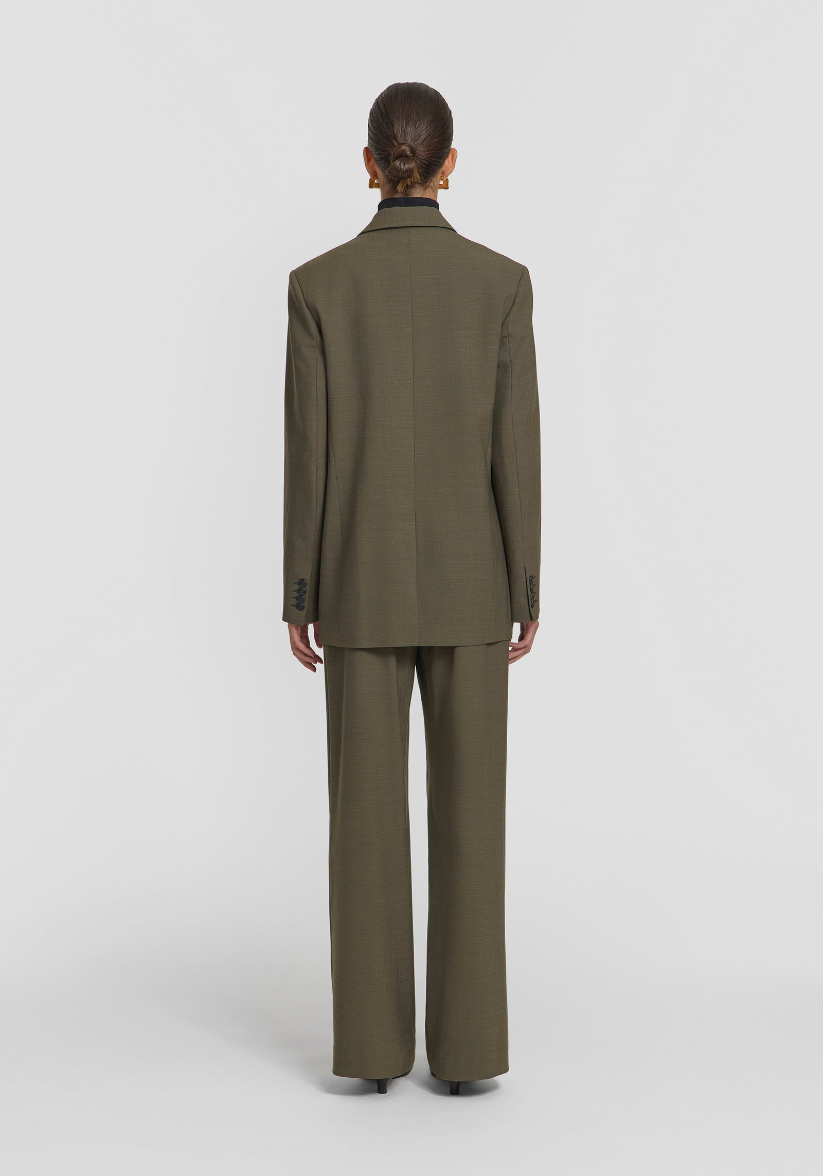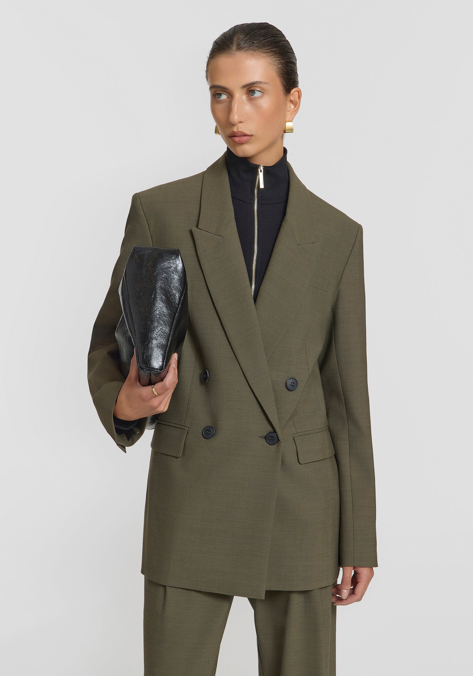 A modern addition to your workwear rotation, the Crossroads Blazer is crafted in khaki green, merging classic tailoring with a fresh perspective. This double-breasted silhouette features a peak lapel, front welt pockets, and a centre back vent, finished with contrast black buttons. Pair with the Brooklyn Trouser or Townes Skirt for a statement suiting moment.