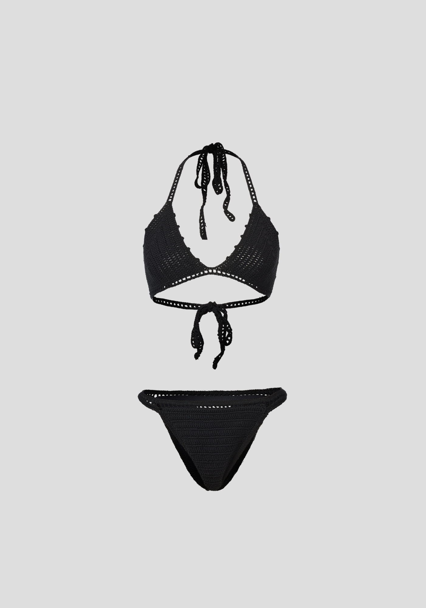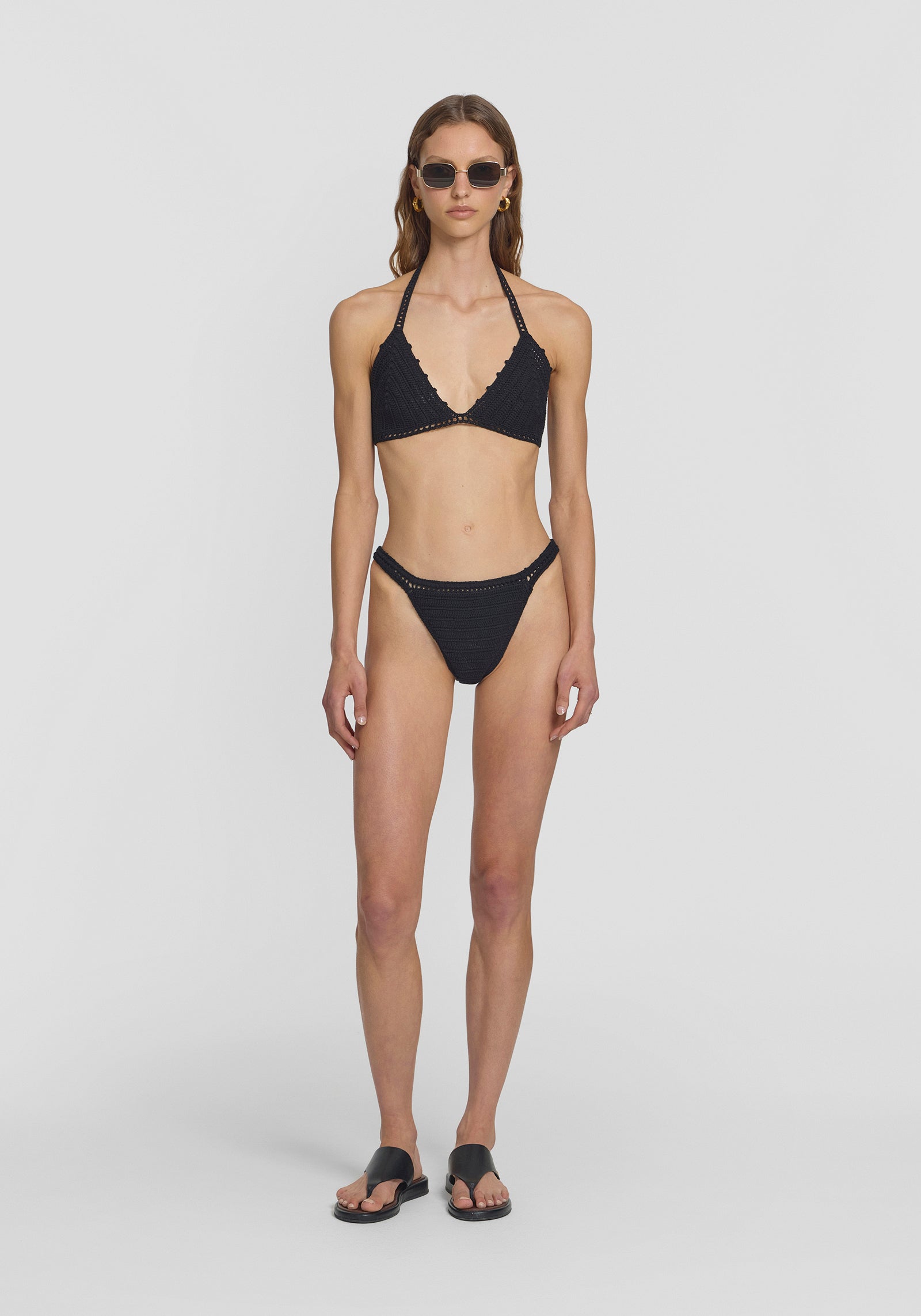 Exude effortless resort style with the Cuban Bikini Top, a hand-crafted crochet design in timeless black. Featuring a classic triangle bikini top with adjustable ties, it pairs perfectly with the low-rise, cheeky-cut briefs - an essential for any sun-soaked escape. Perfect for versatile summer layering or making a fun statement.