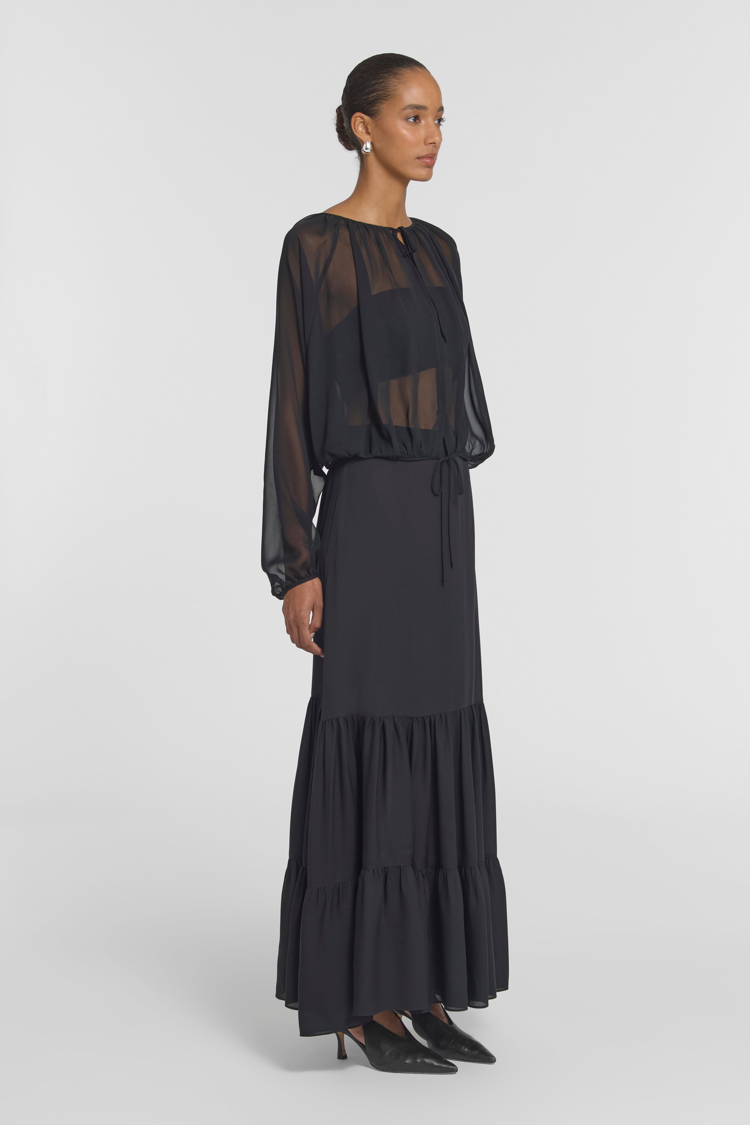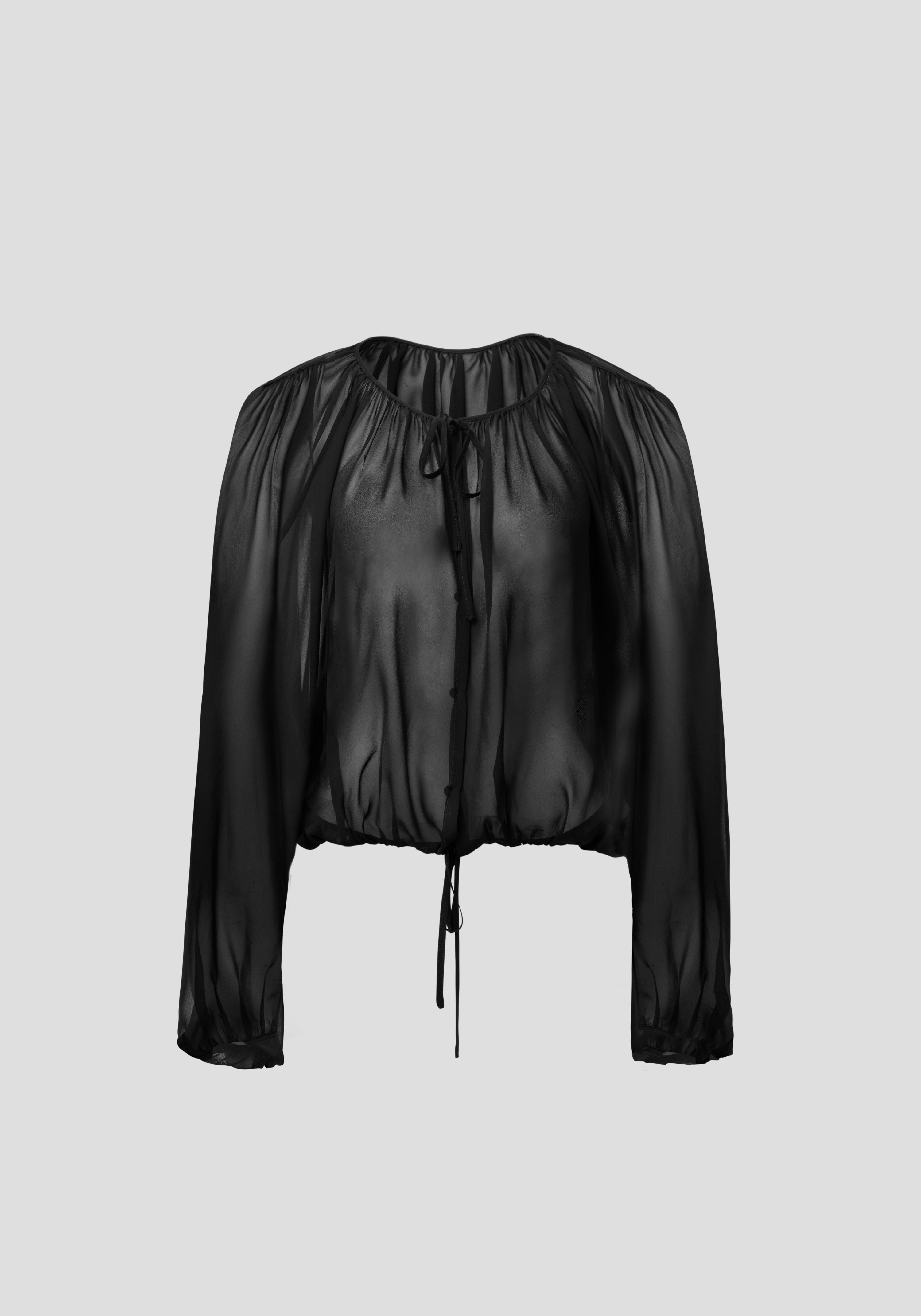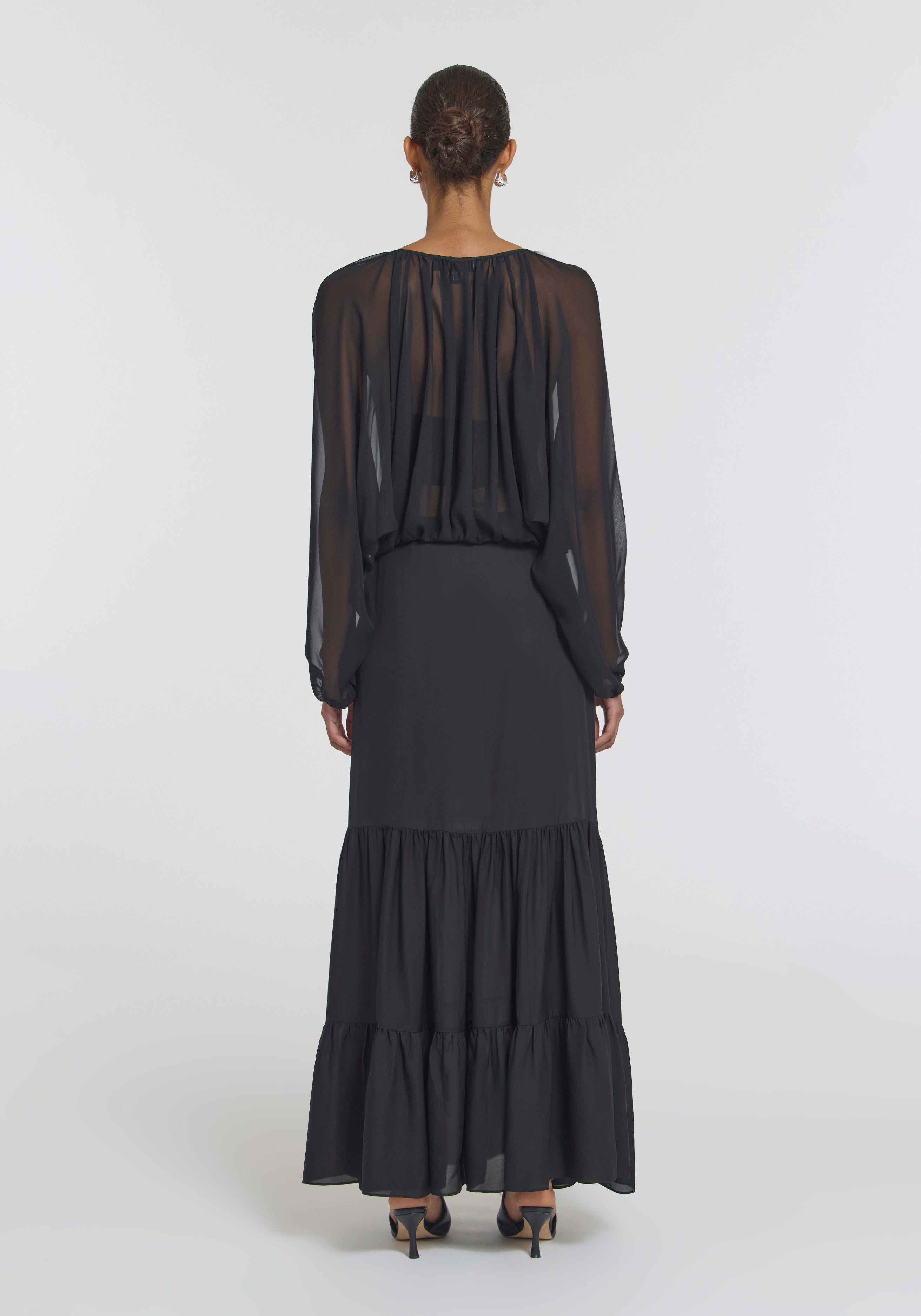The Curator Top, a remastered icon crafted from sheer black silk georgette, offers a signature expression of modern confidence. Defined by a draped silhouette with voluminous batwing sleeves, extended neckline, and adjustable waist ties, it presents a study in personalised styling - worn open, wrapped, layered or reversed. Pair with the Breakwater Skirt to create a timeless expression of elegance inspired by bohemian fluidity.