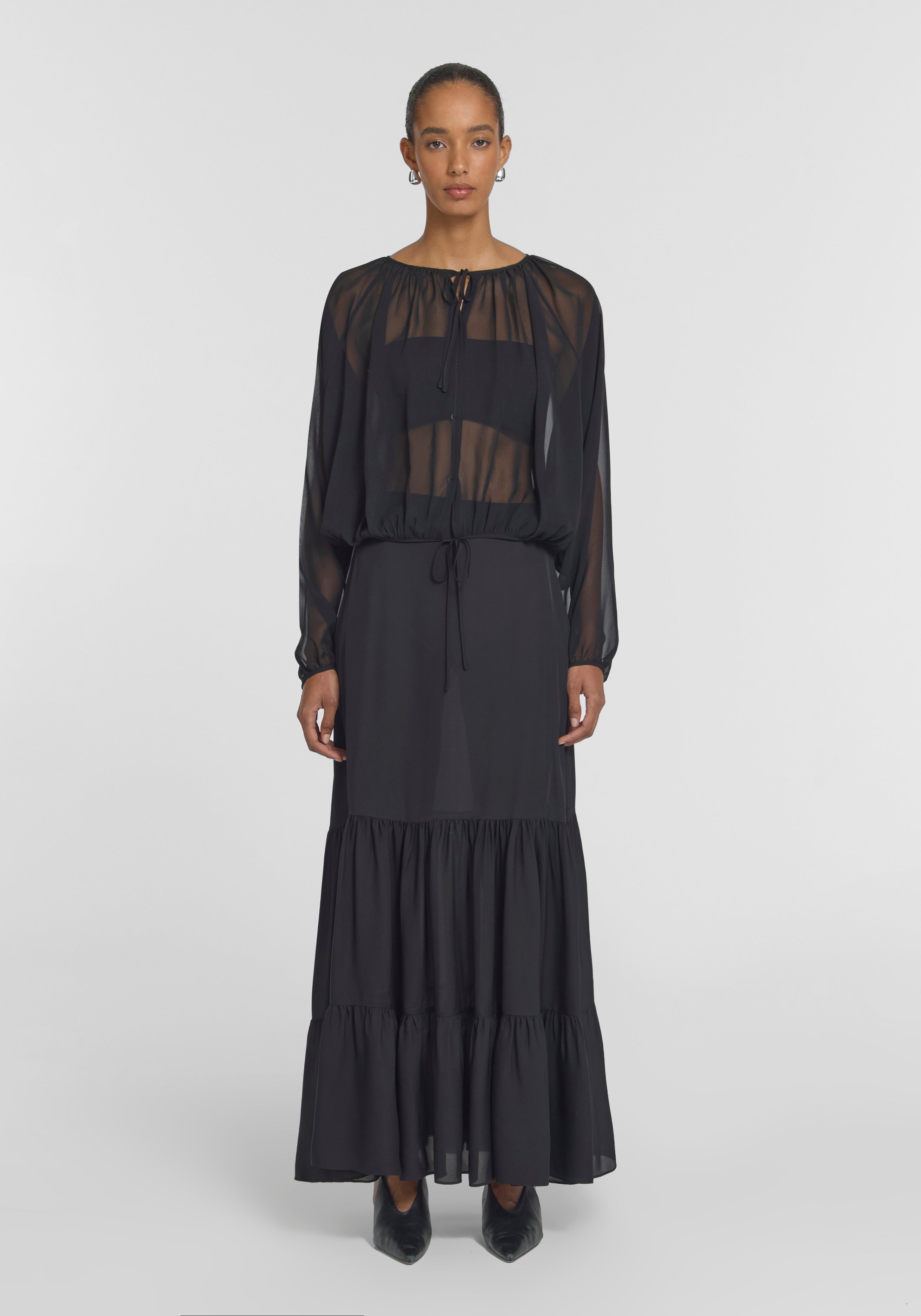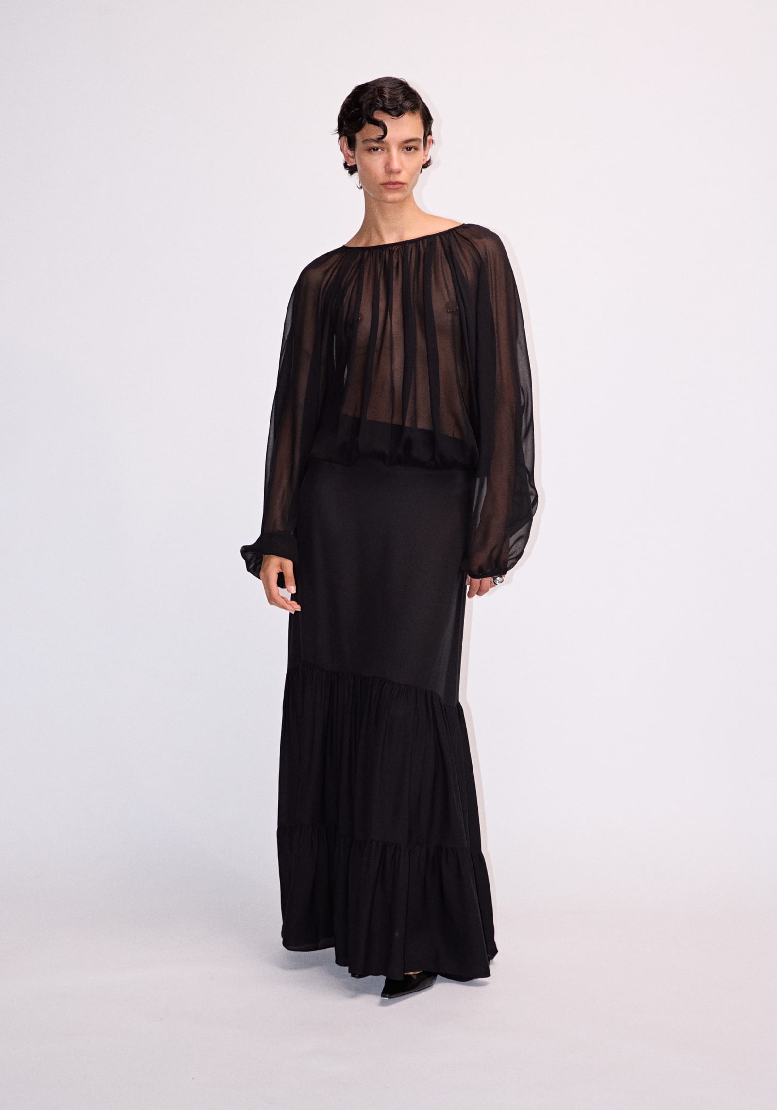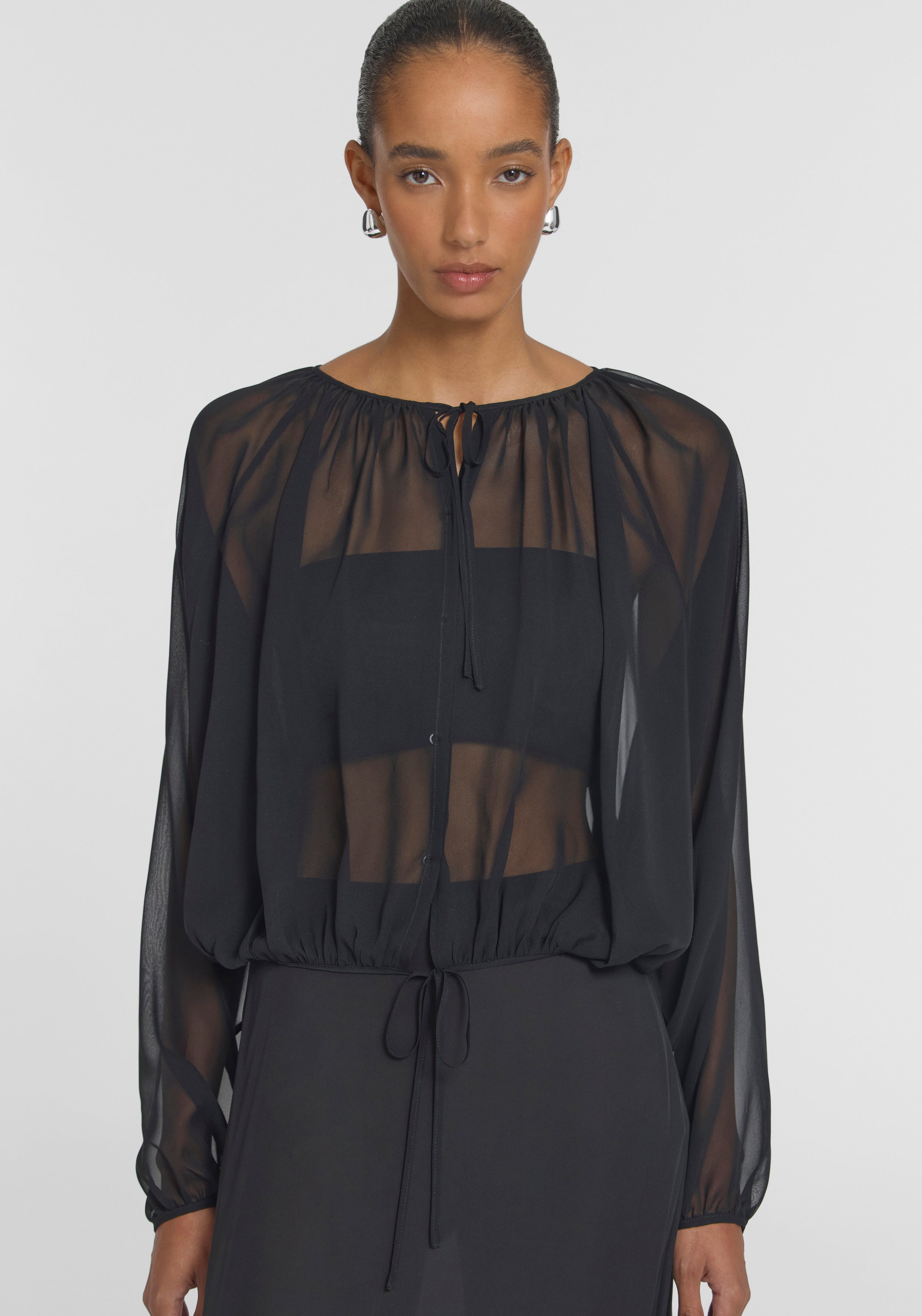 The Curator Top, a remastered icon crafted from sheer black silk georgette, offers a signature expression of modern confidence. Defined by a draped silhouette with voluminous batwing sleeves, extended neckline, and adjustable waist ties, it presents a study in personalised styling - worn open, wrapped, layered or reversed. Pair with the Breakwater Skirt to create a timeless expression of elegance inspired by bohemian fluidity.