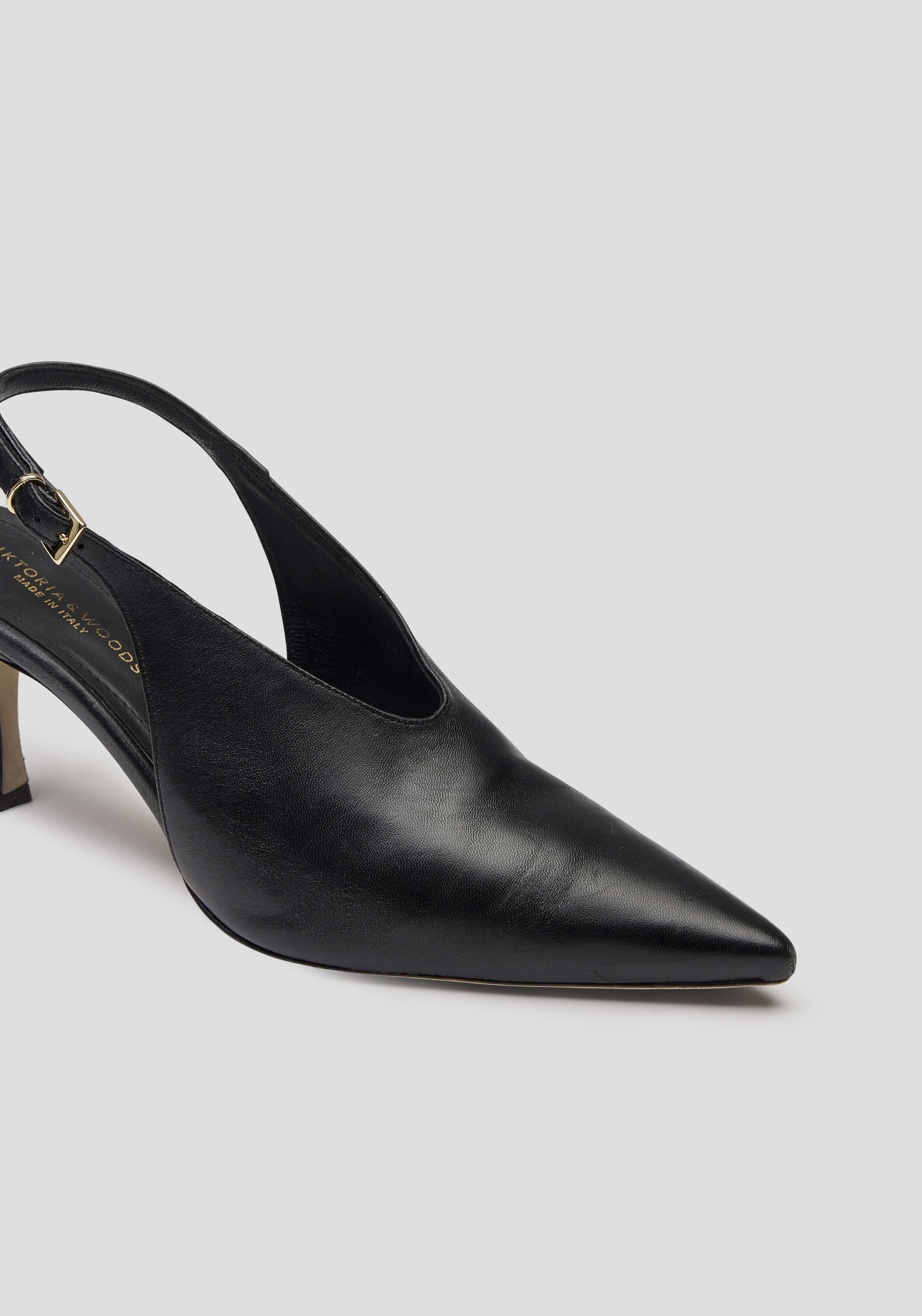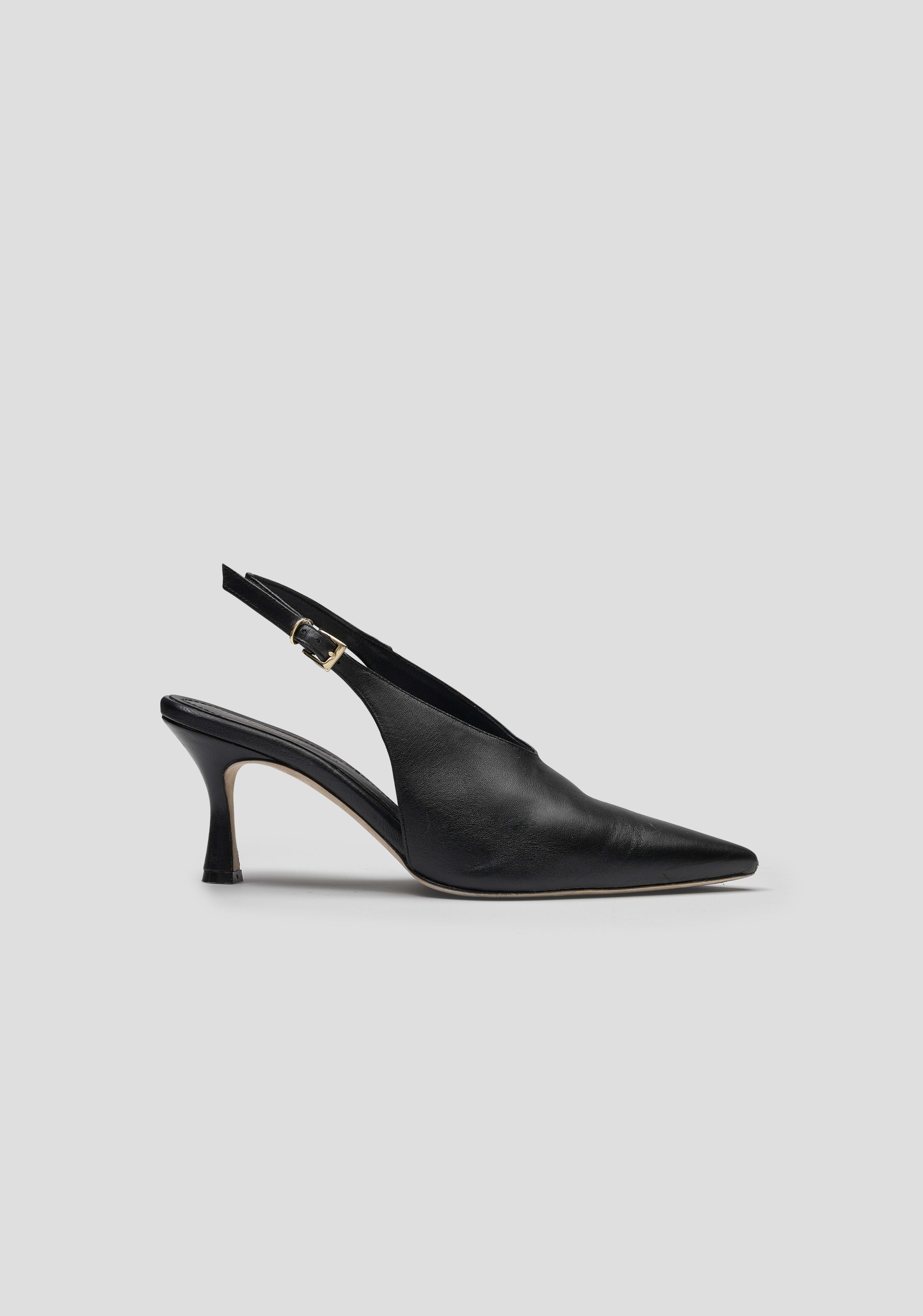Defined by timeless design and sophisticated form, the Damascus Heel is crafted in matte black nappa leather. Featuring a chic pointed toe, slingback strap, and 7cm heel, it’s elegantly adorned with a gold buckle, making it an effortlessly enduring accessory.