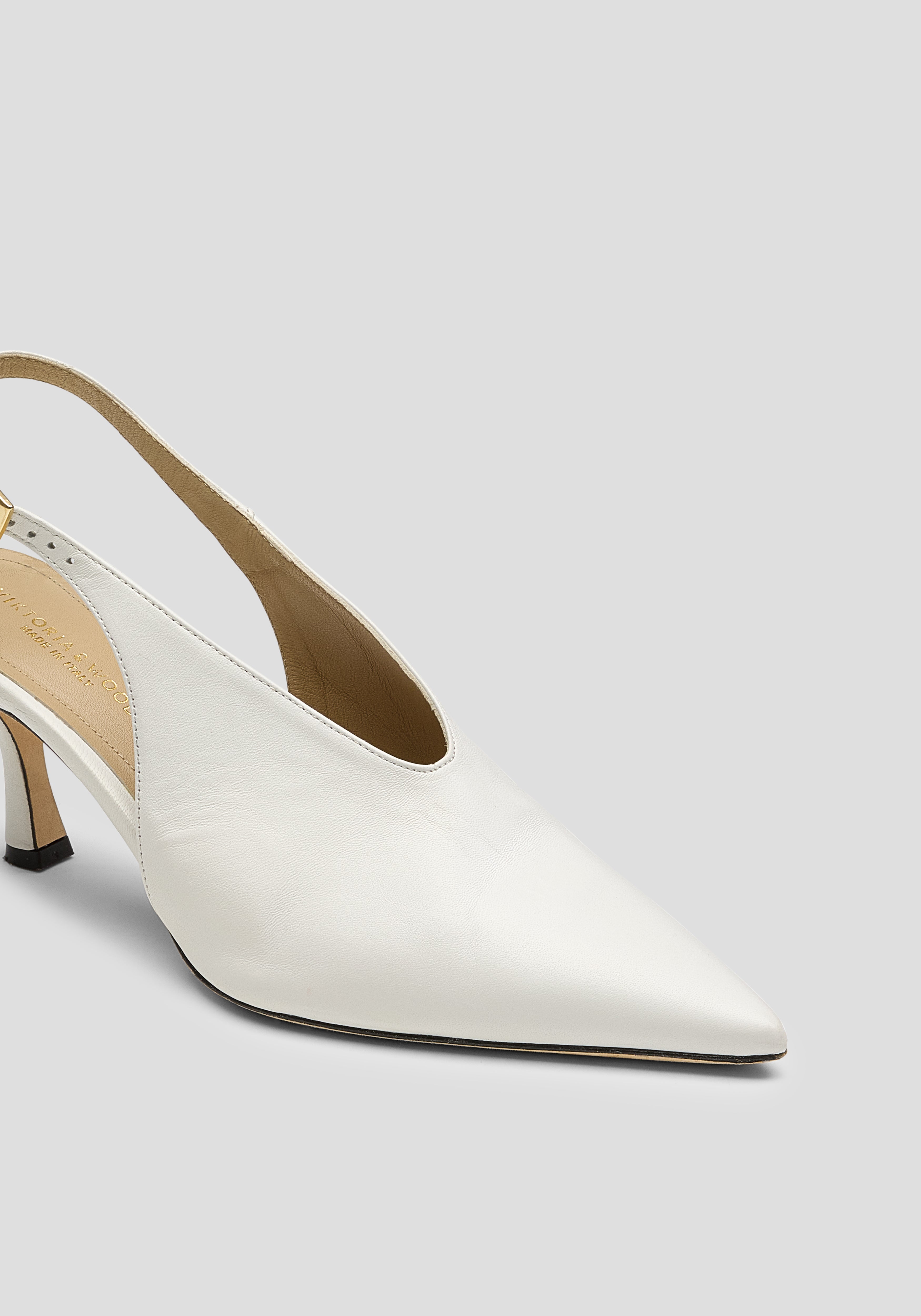 Defined by timeless design and sophisticated form, the Damascus Heel is crafted in matte ivory nappa leather. Featuring a chic pointed toe, slingback strap, and 7cm heel, it’s elegantly adorned with a gold buckle, making it an effortlessly enduring accessory.