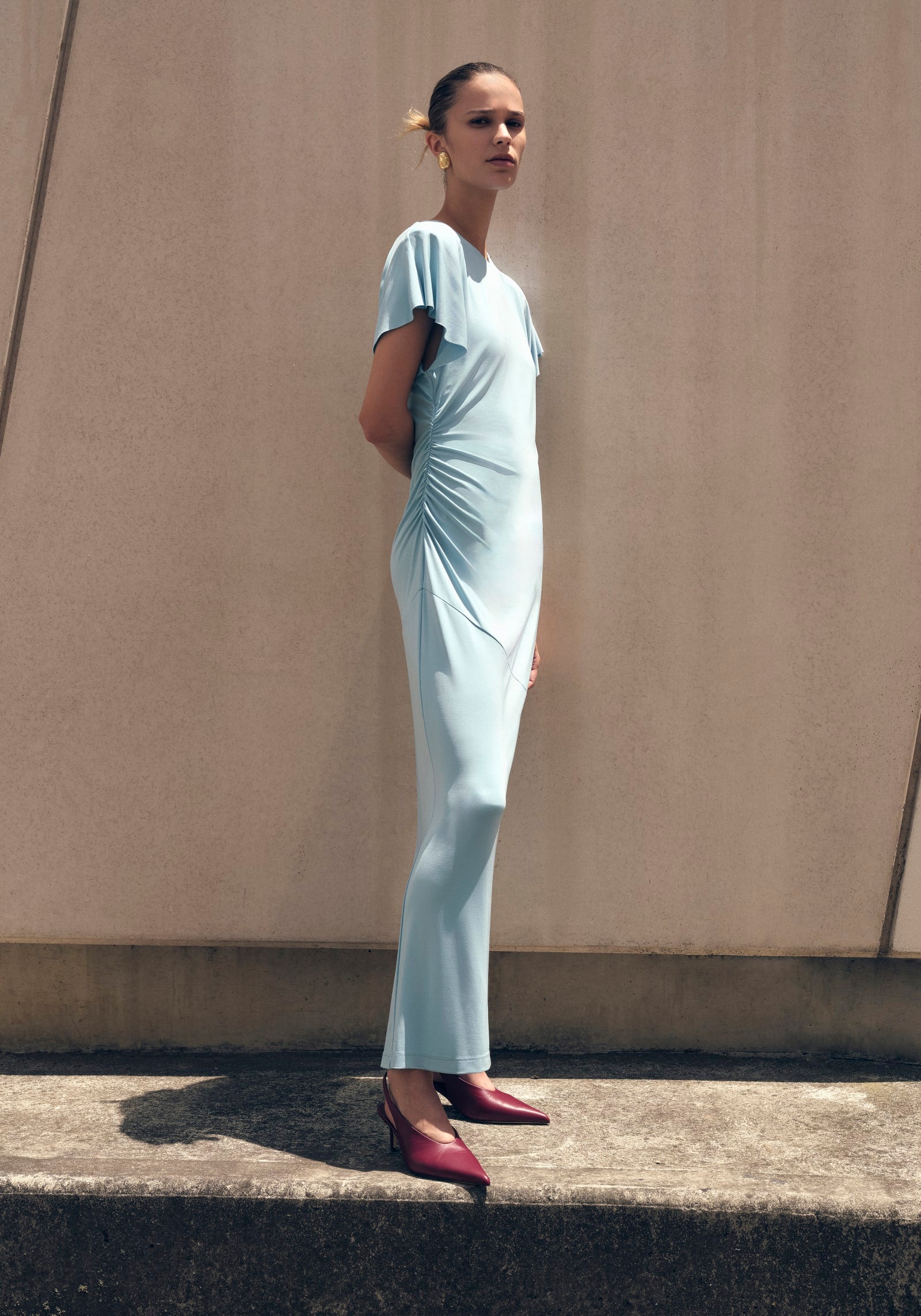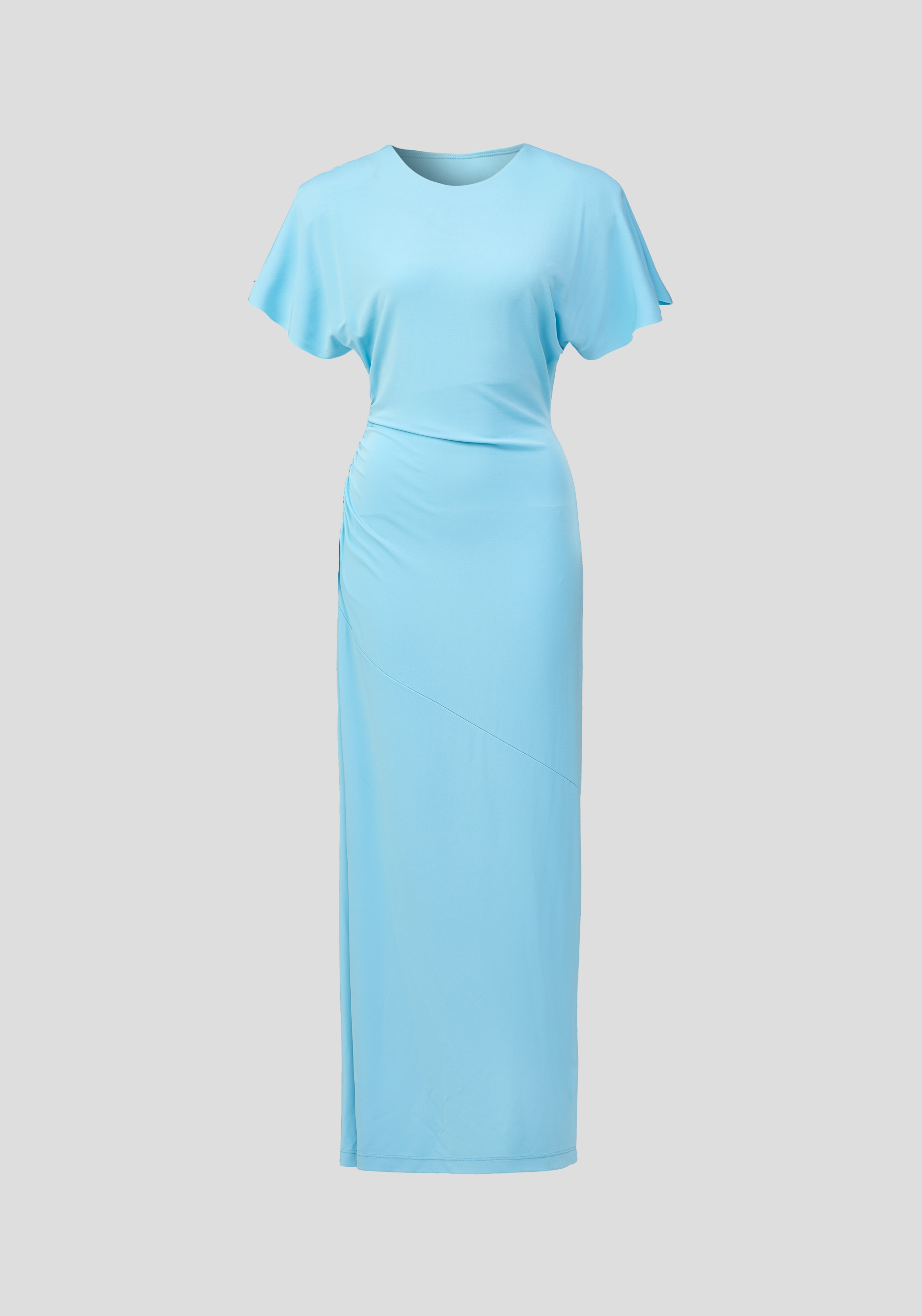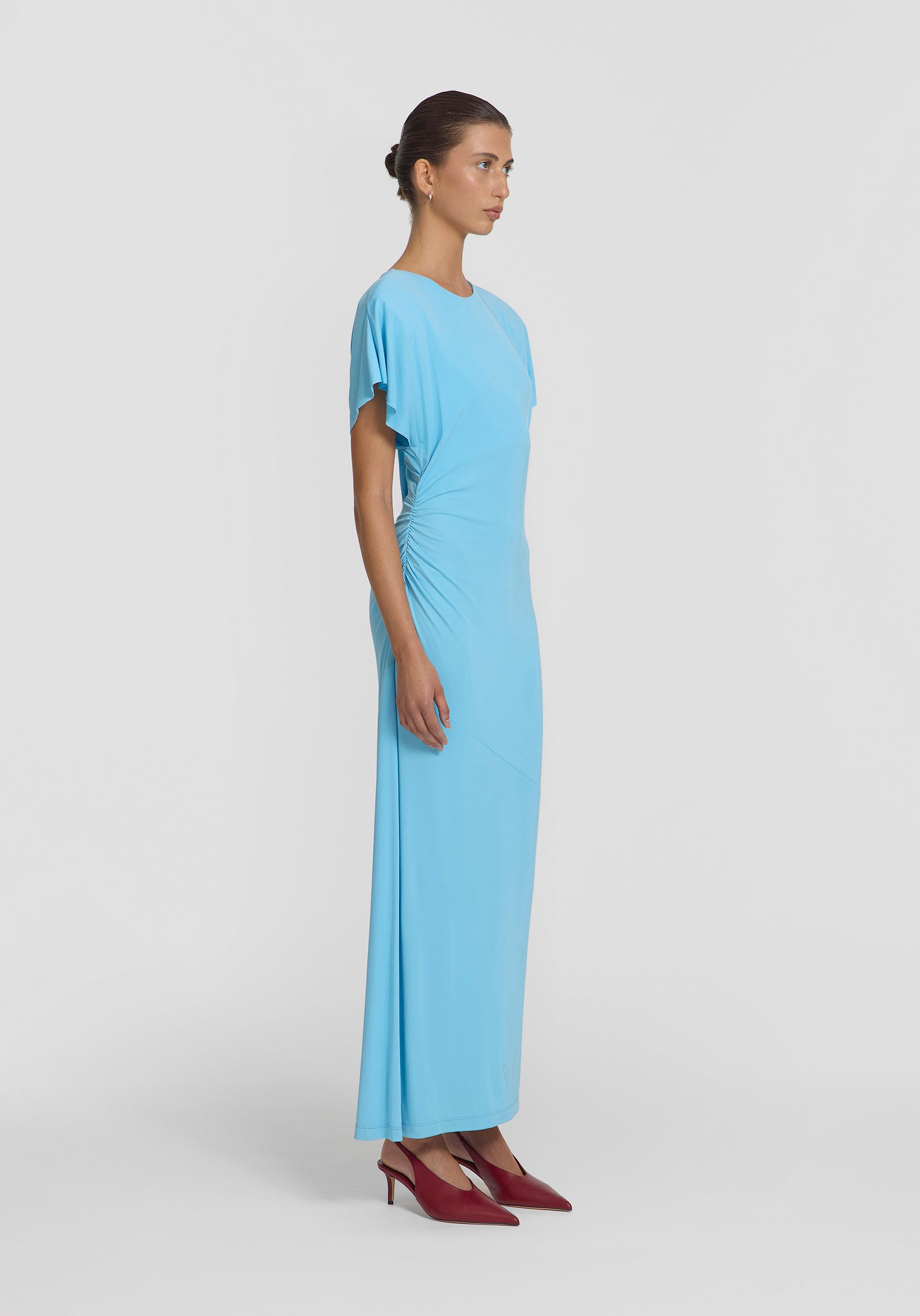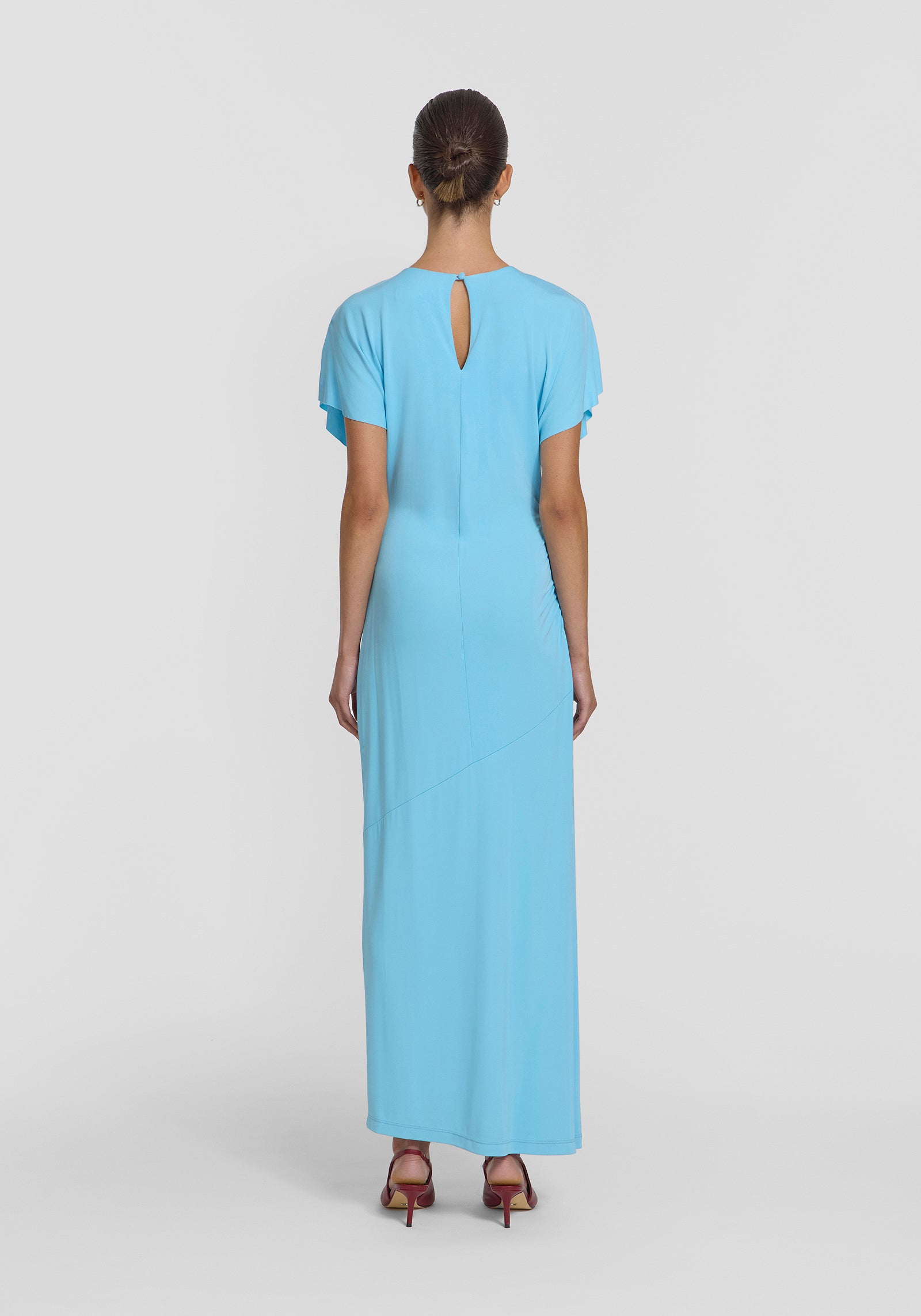 Embody serene elegance with the Daytona Dress, an event-worthy silhouette in a bold turquoise hue. Subtle shoulder pads and softly draped sleeves complement its gentle side gathering for a flattering, body-skimming fit. A raw sleeve hem and keyhole opening at the back lend a sophisticated finish, making this dress a standout choice for your next occasion.