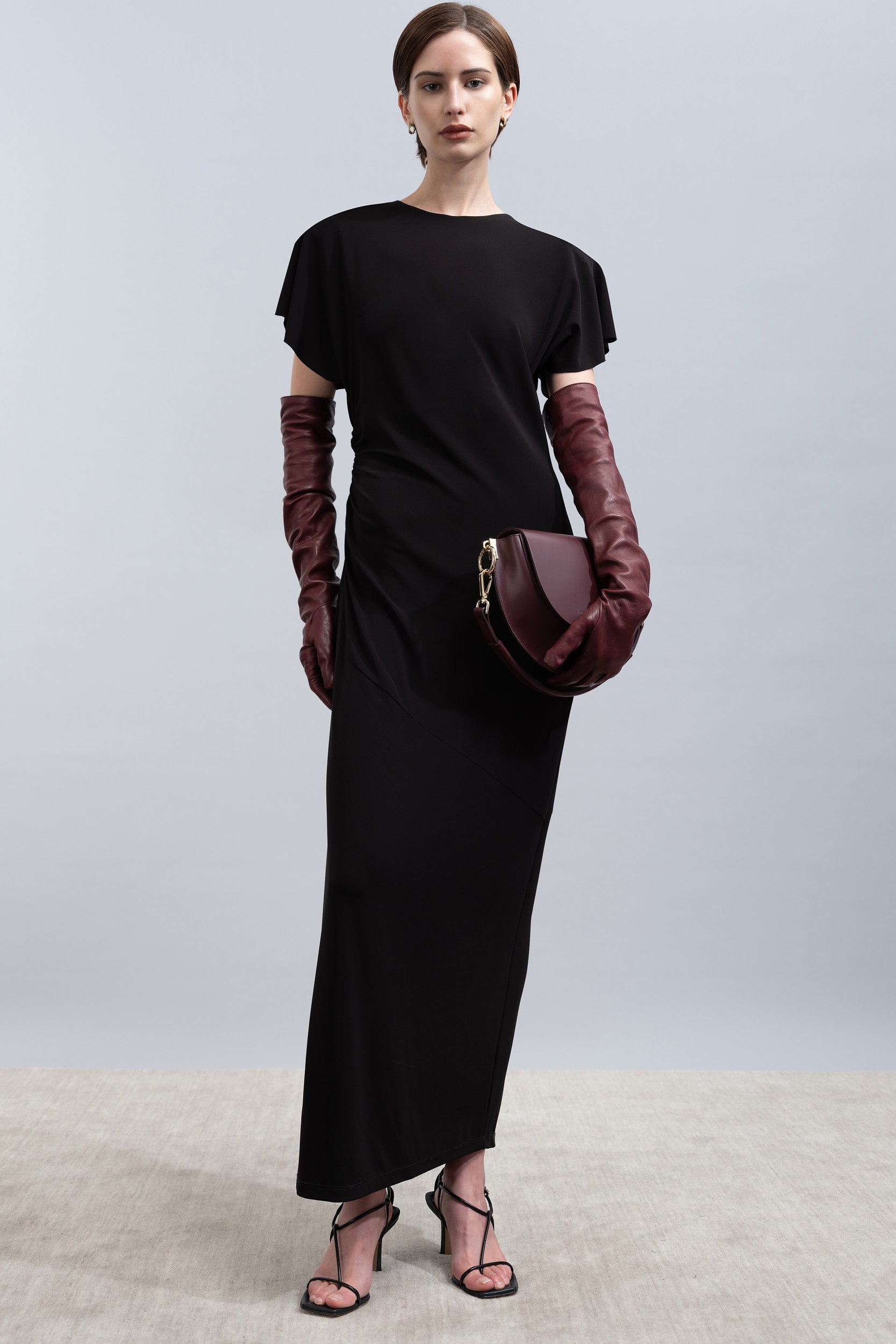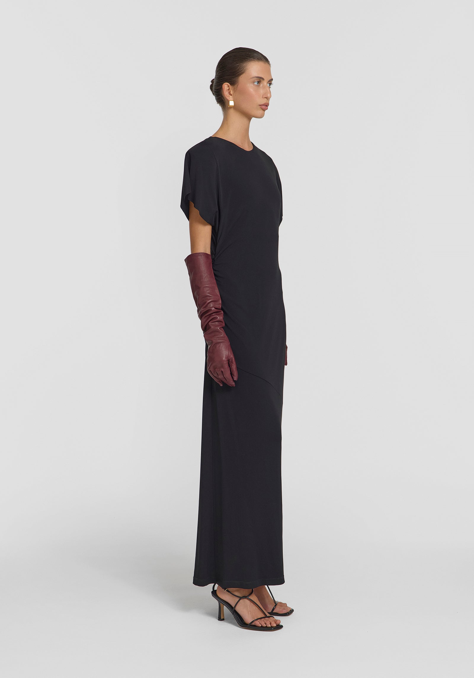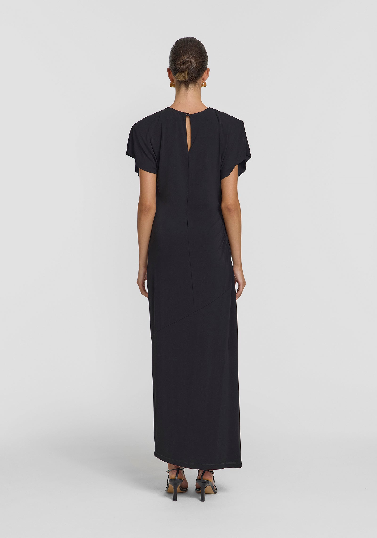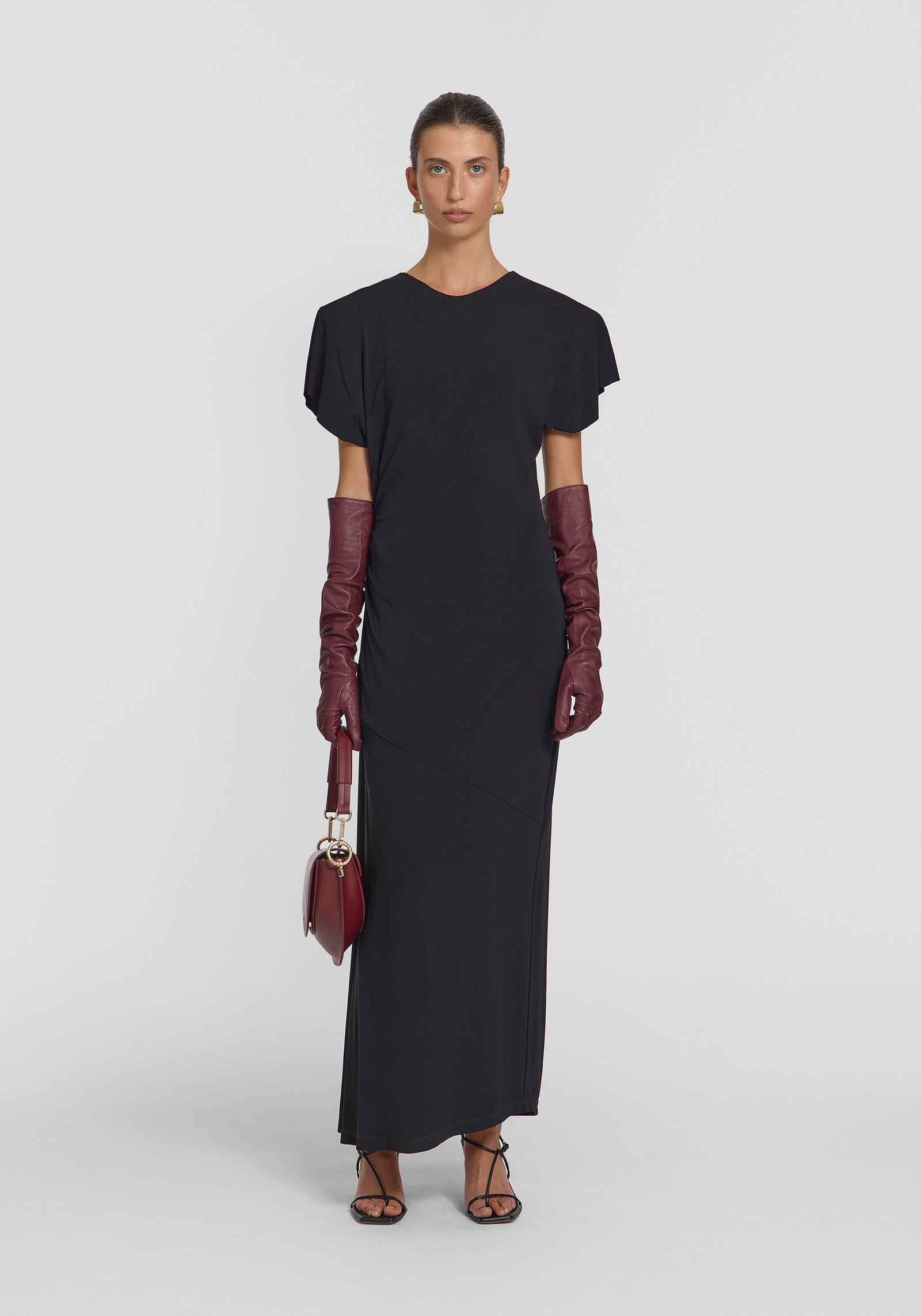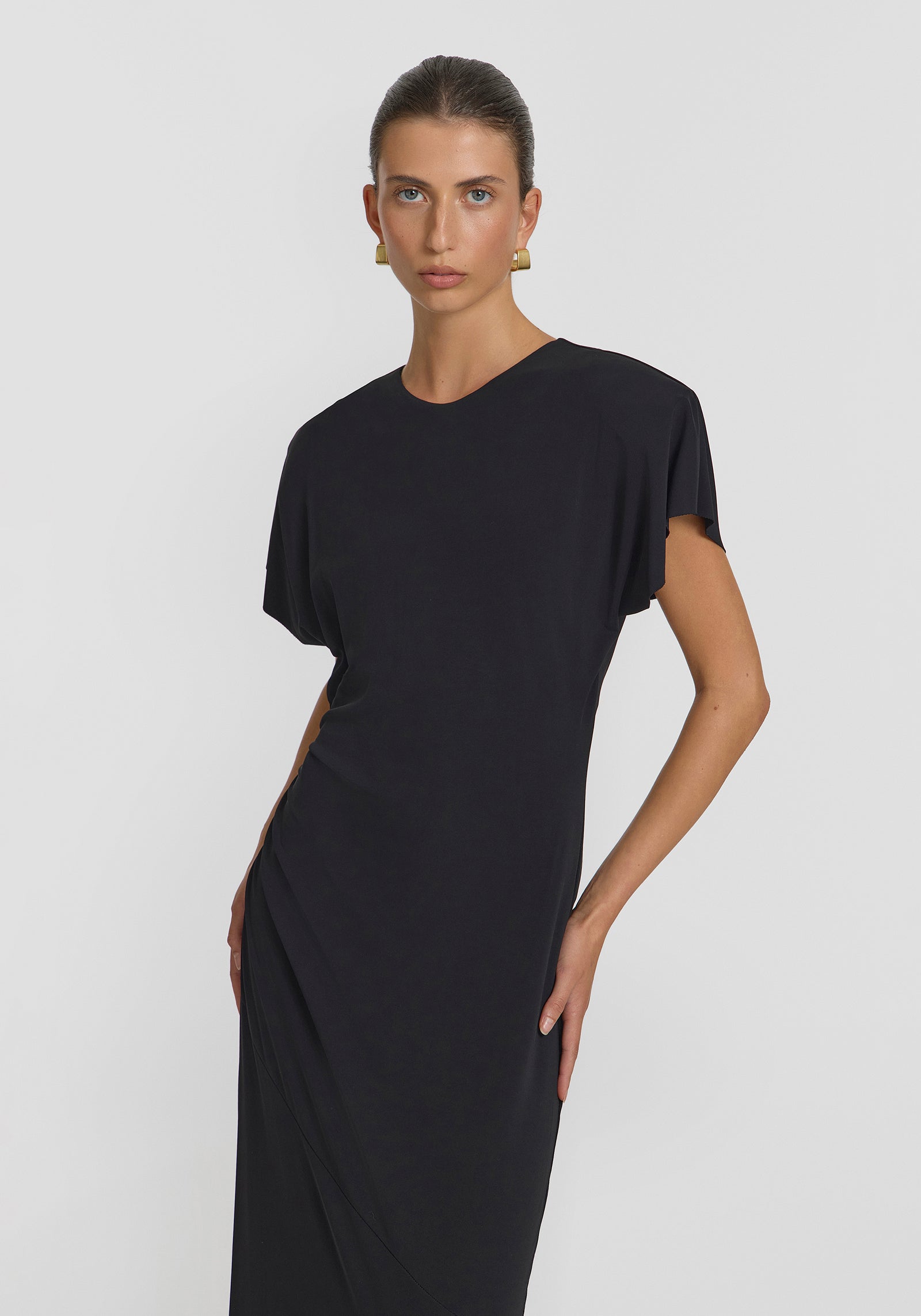 Embody serene elegance with the Daytona Dress, an event-worthy silhouette in classic black. Subtle shoulder pads and softly draped sleeves complement its gentle side gathering for a flattering, body-skimming fit. A raw sleeve hem and keyhole opening at the back lend a sophisticated finish, making this dress a standout choice for your next occasion.