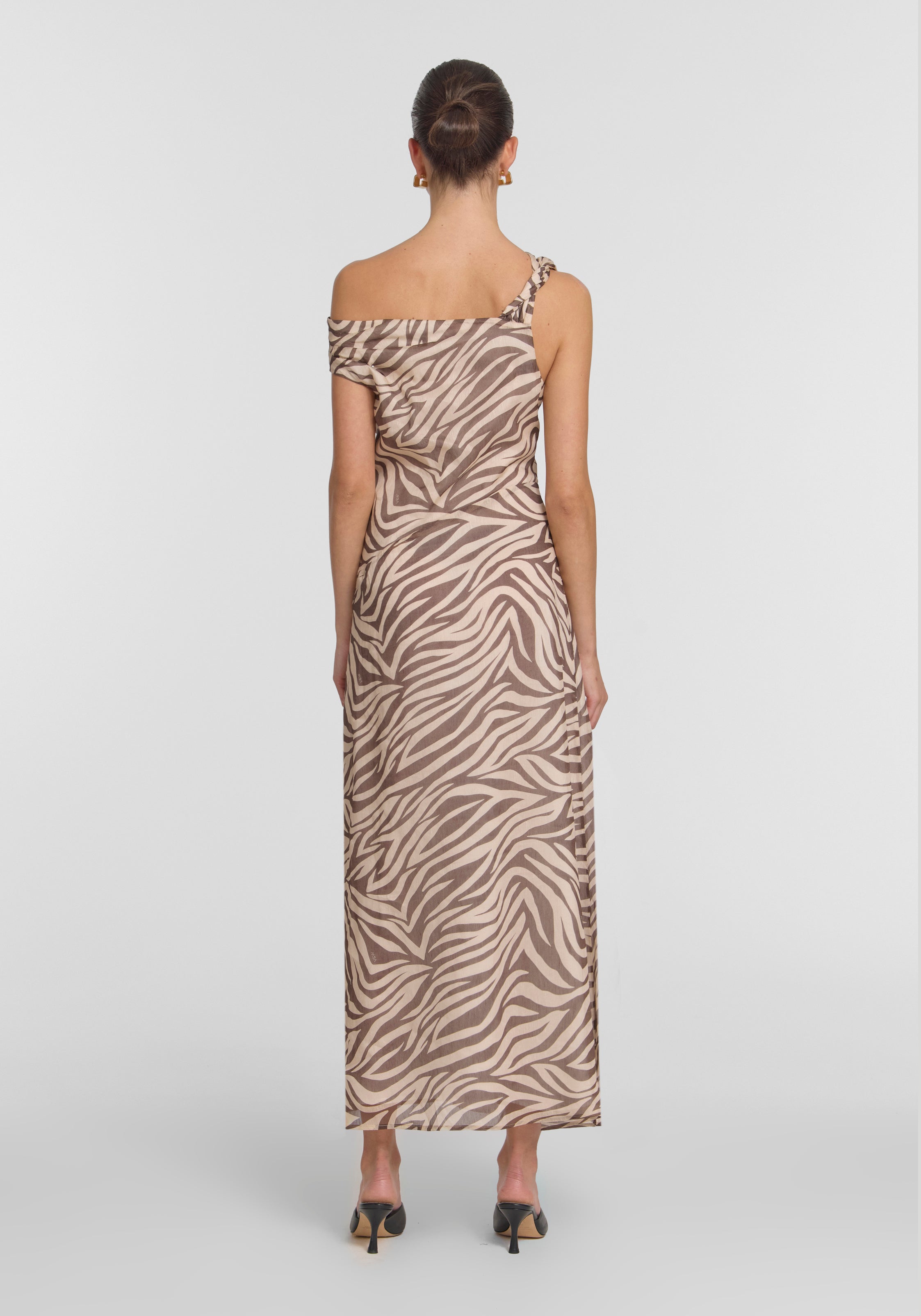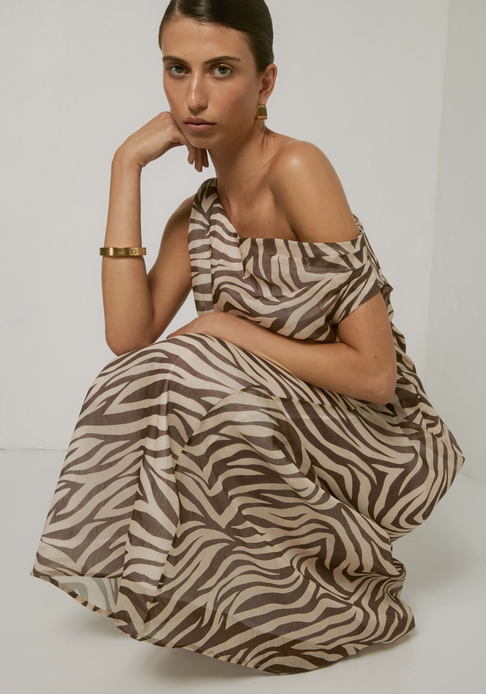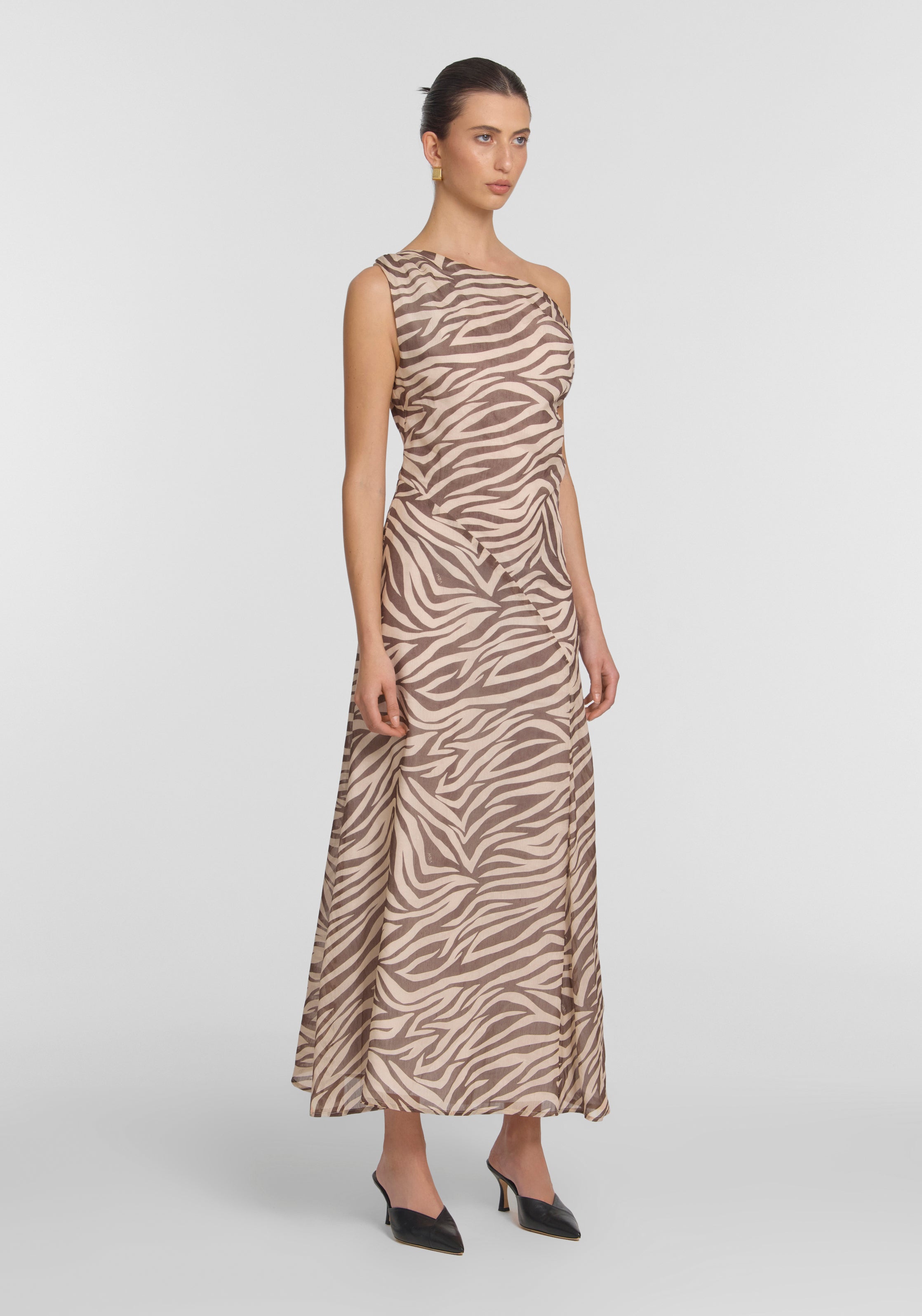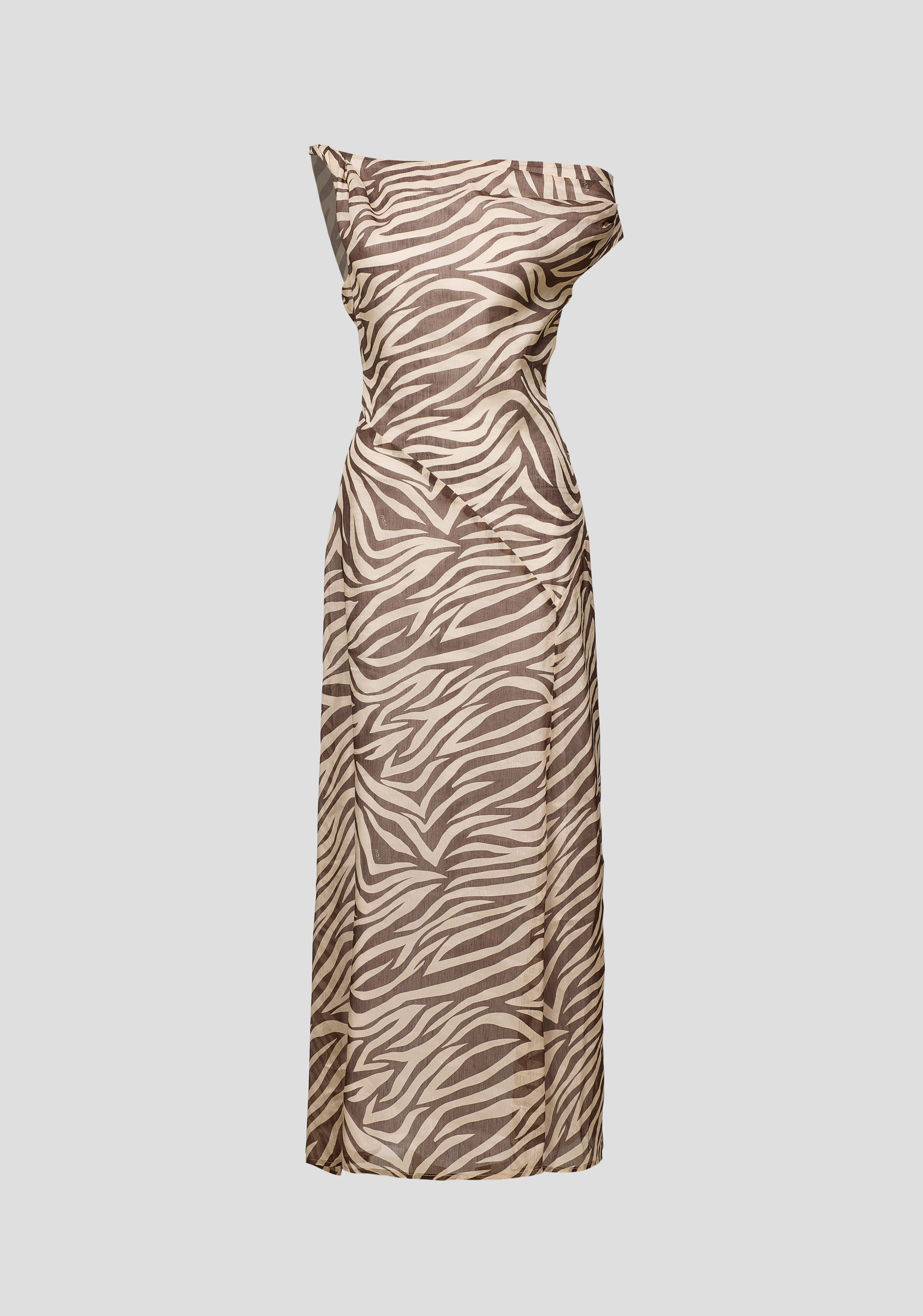 The Debutante Dress, crafted from a luxurious linen-silk blend in a striking zebra print, embodies effortless elegance for event dressing. Showcasing an asymmetrical neckline with a twisted strap and soft draping, designed to be worn on or off the shoulder. A bias-cut skirt with seam detailing and an asymmetrical hem completes the look - an alluring choice for spring and summer soirées.