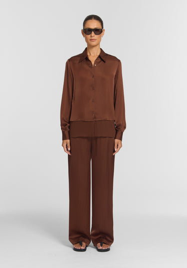 The Demigod Shirt, crafted in our signature cupro blend in chestnut brown, is an essential elevated with considered detailing. With a traditional placket, collar, buttoned cuffs and relaxed fit, it’s complete with a gold metal V&W pip at the back neck. Offering inherent lightness and a beautiful drape, it’s refined by contrast silk side panels that introduce a private sense of luxury. Pair with the Rocky Pant in the matching hue for an effortlessly versatile set.