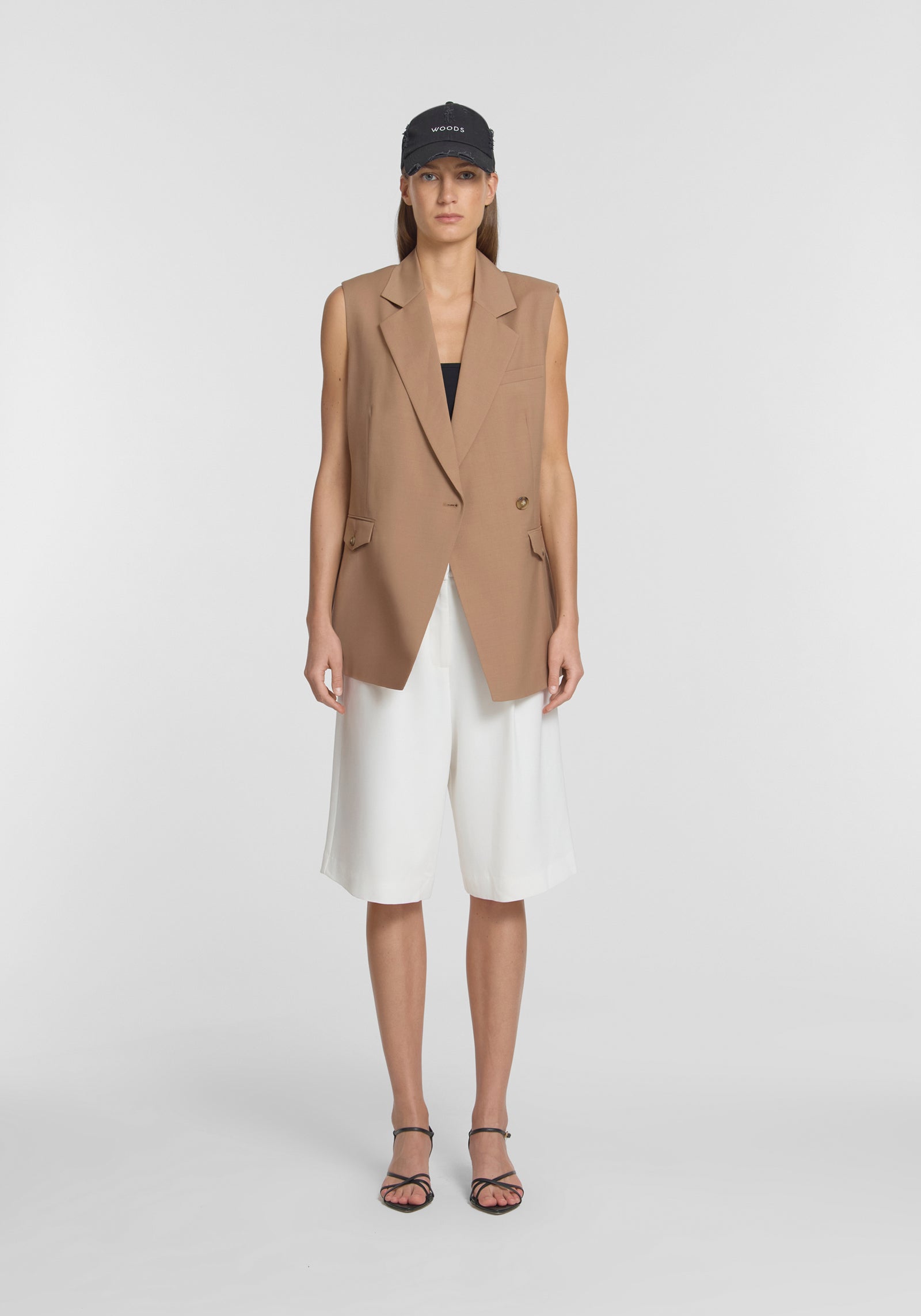 The Destination Sleeveless Blazer is an office essential, luxuriously crafted from a lightweight wool blend in a neutral light brown hue. Its double-breasted wrap silhouette features a notched collar, a logo button, utilitarian pocket detailing, and a centre back vent. Sophisticated and sculpted, it brings timeless modernity to workwear - pair with the Preston Trouser or style back with denim for more relaxed wear.