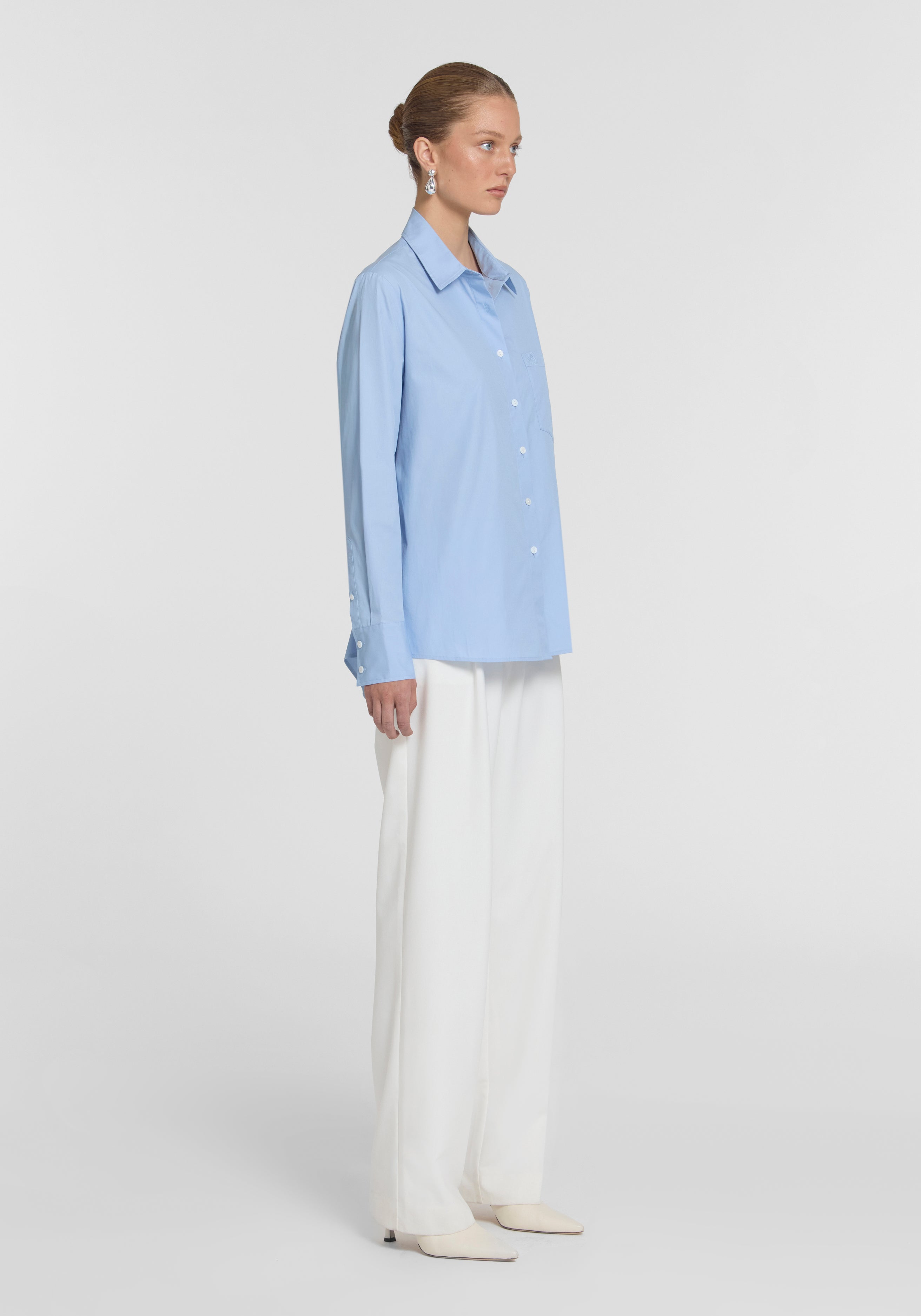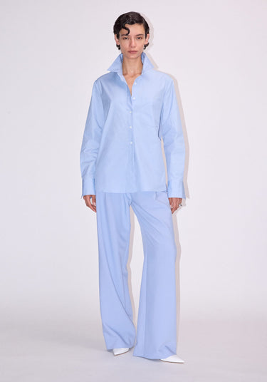 An essential investment for the modern wardrobe, the Divinity Shirt is crafted from crisp organic cotton in a summer blue hue. Designed with a classic collar and placket, relaxed shoulders, and a longline silhouette, it offers details that matter, a storm-flap back with cut-out and drawstring, logo buttons, and V&W embroidery. Style with the Idol Pant or Fenton Short in the matching hue for relaxed executive presence.