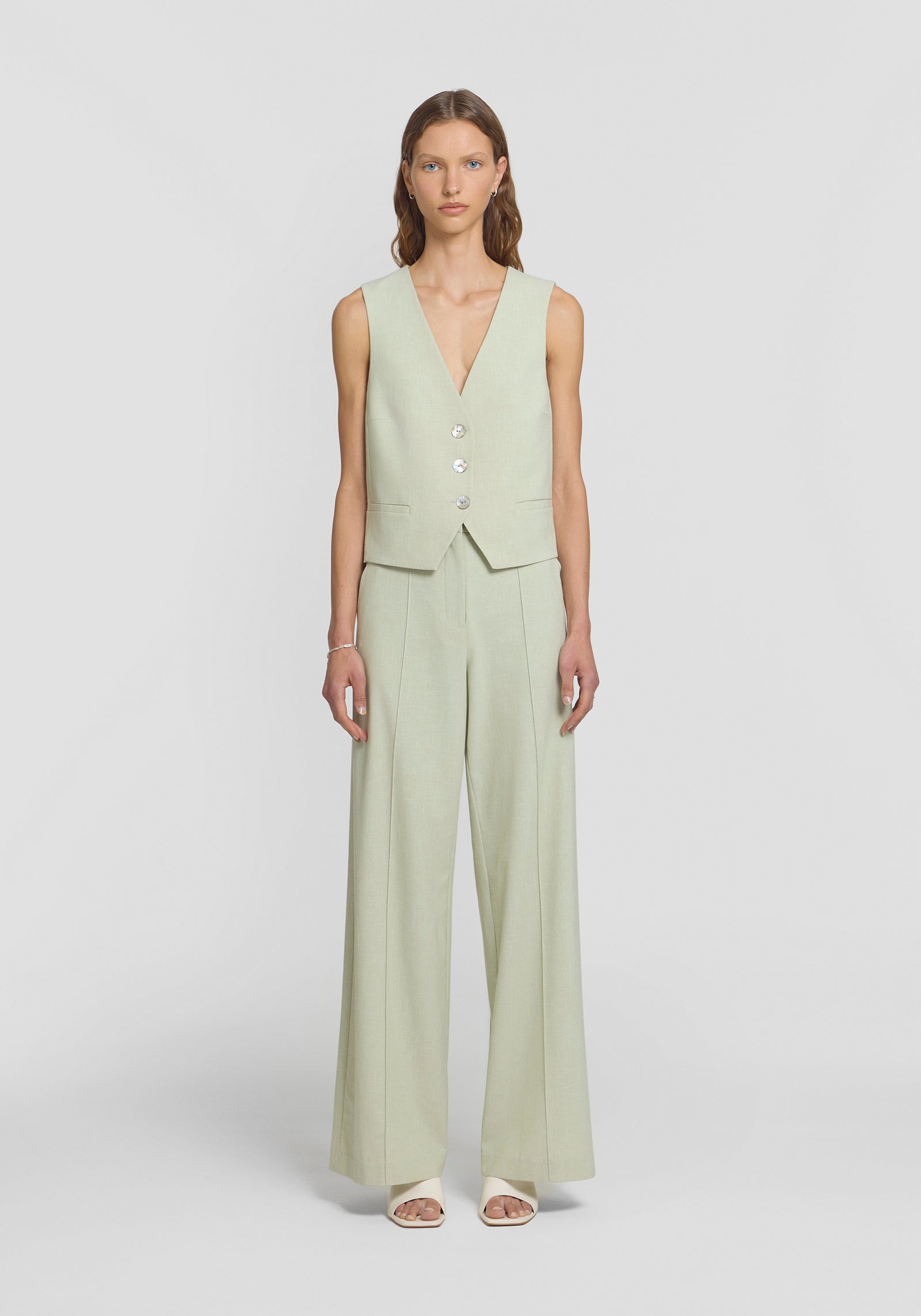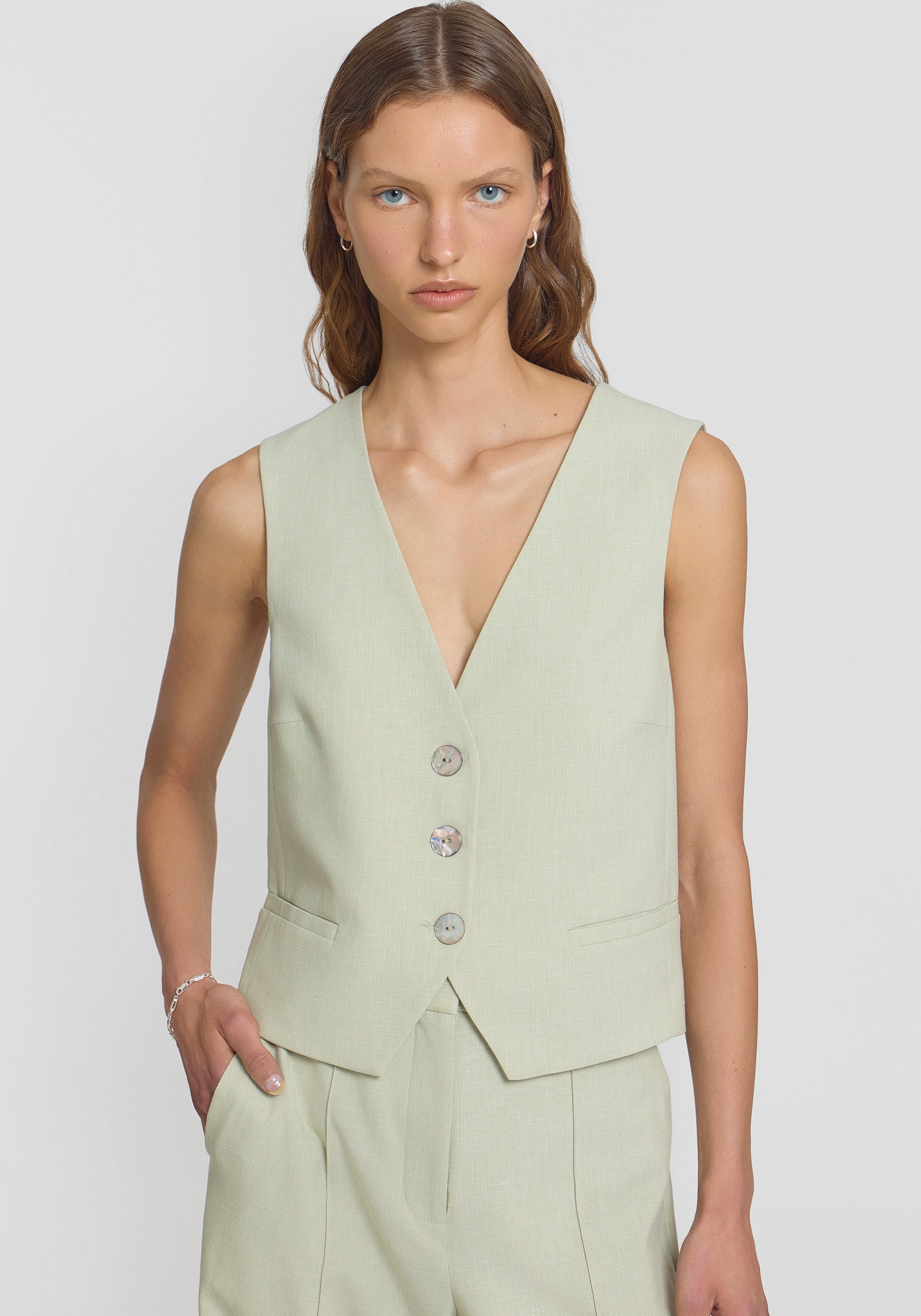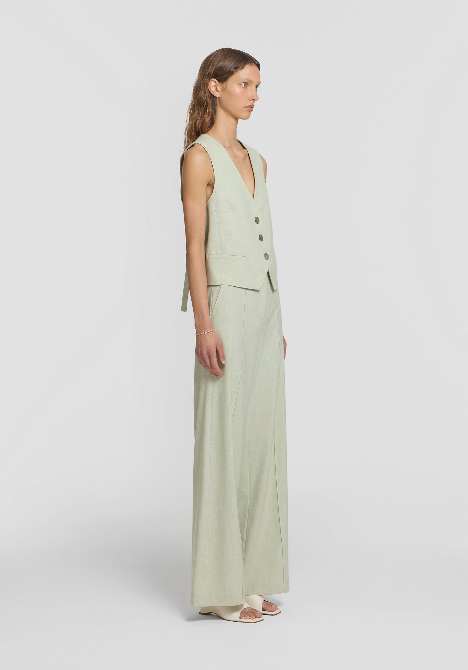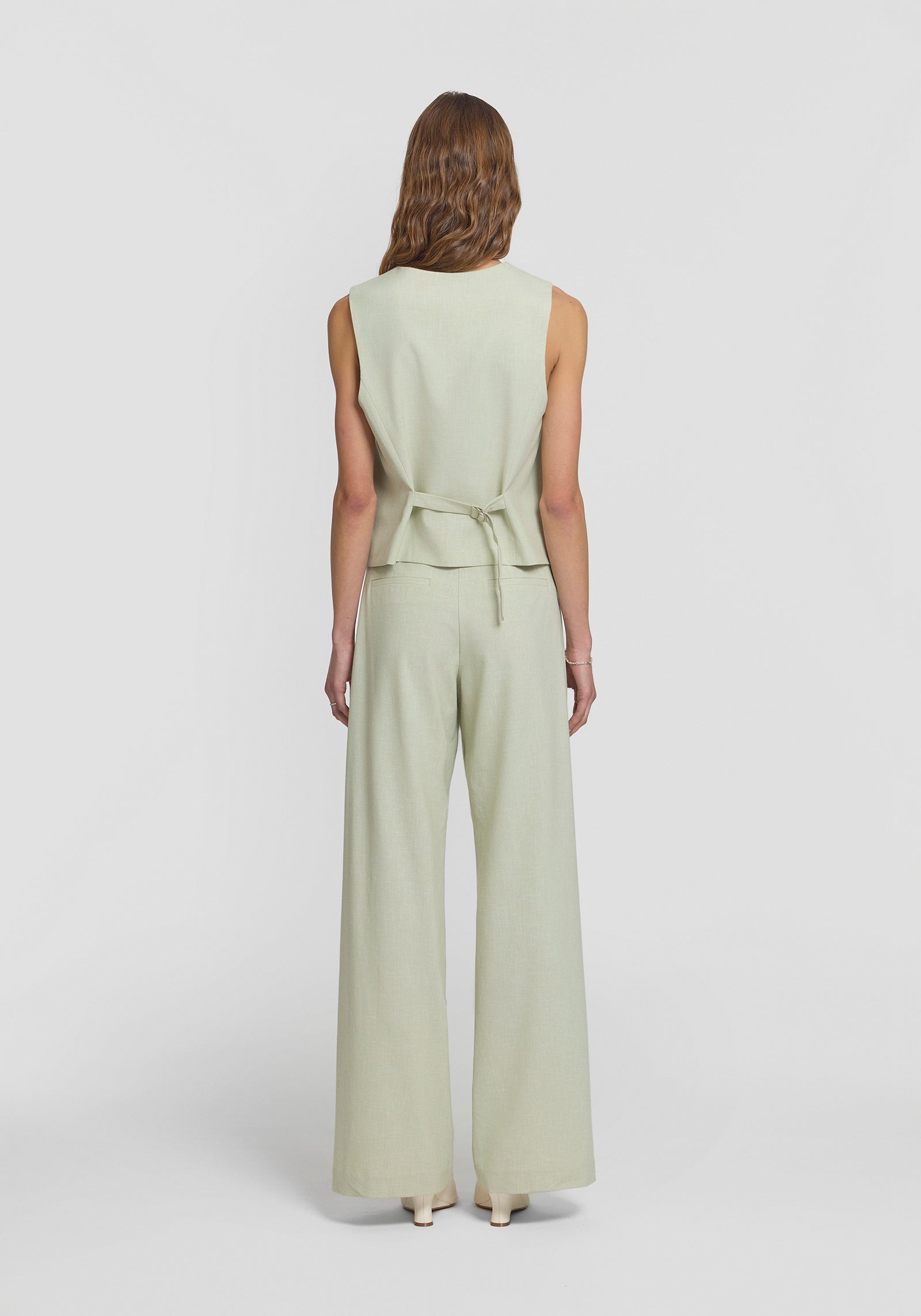 Elevate your spring essentials with the Drumline Vest in a soft green hue. Featuring a button-down V-neck design and a relaxed yet tailored silhouette, it’s adorned with natural shell buttons and an adjustable back ring for a cinched fit. Pair it with the Barker Trouser in the matching shade for a fresh, polished spring suiting ensemble.
