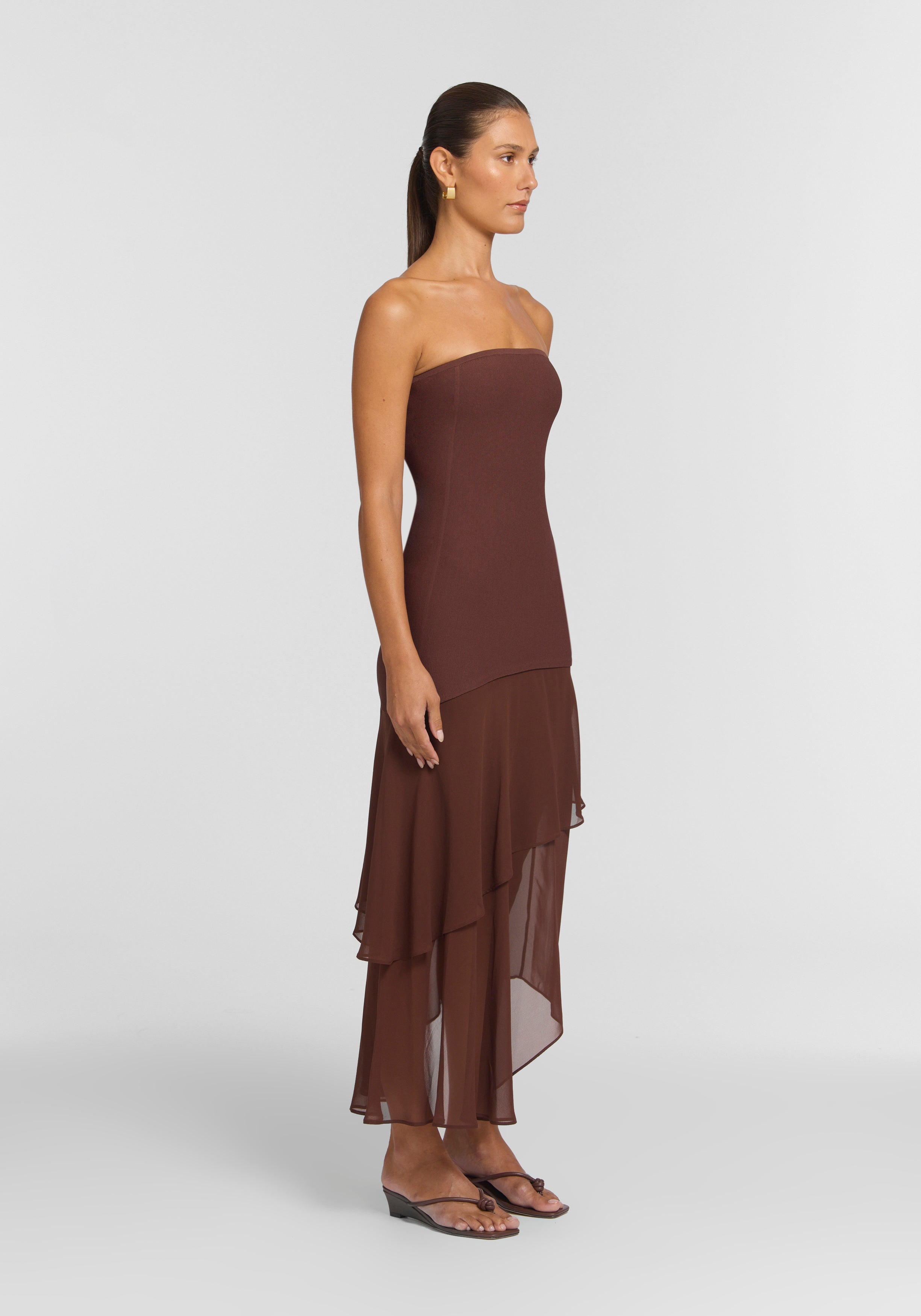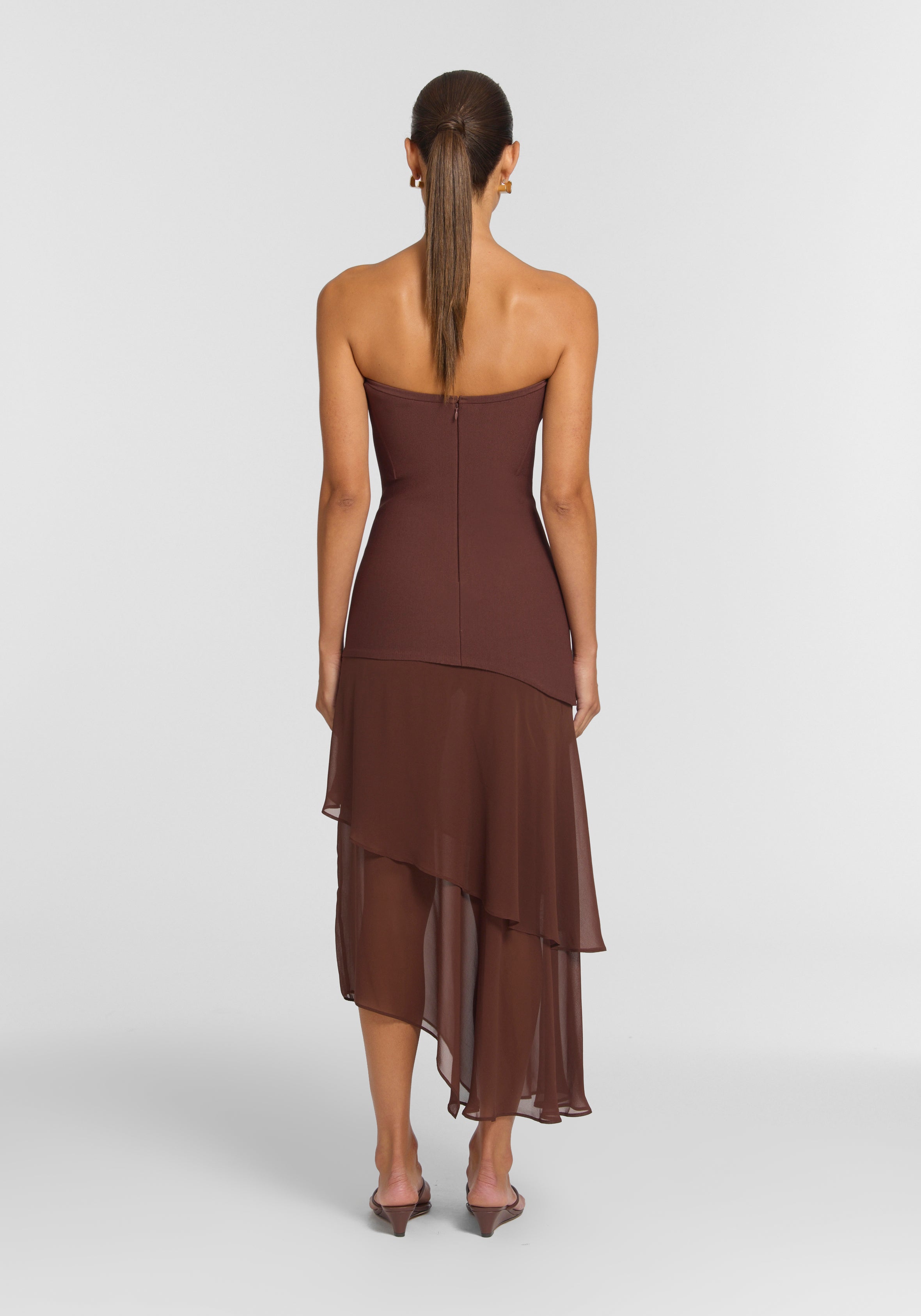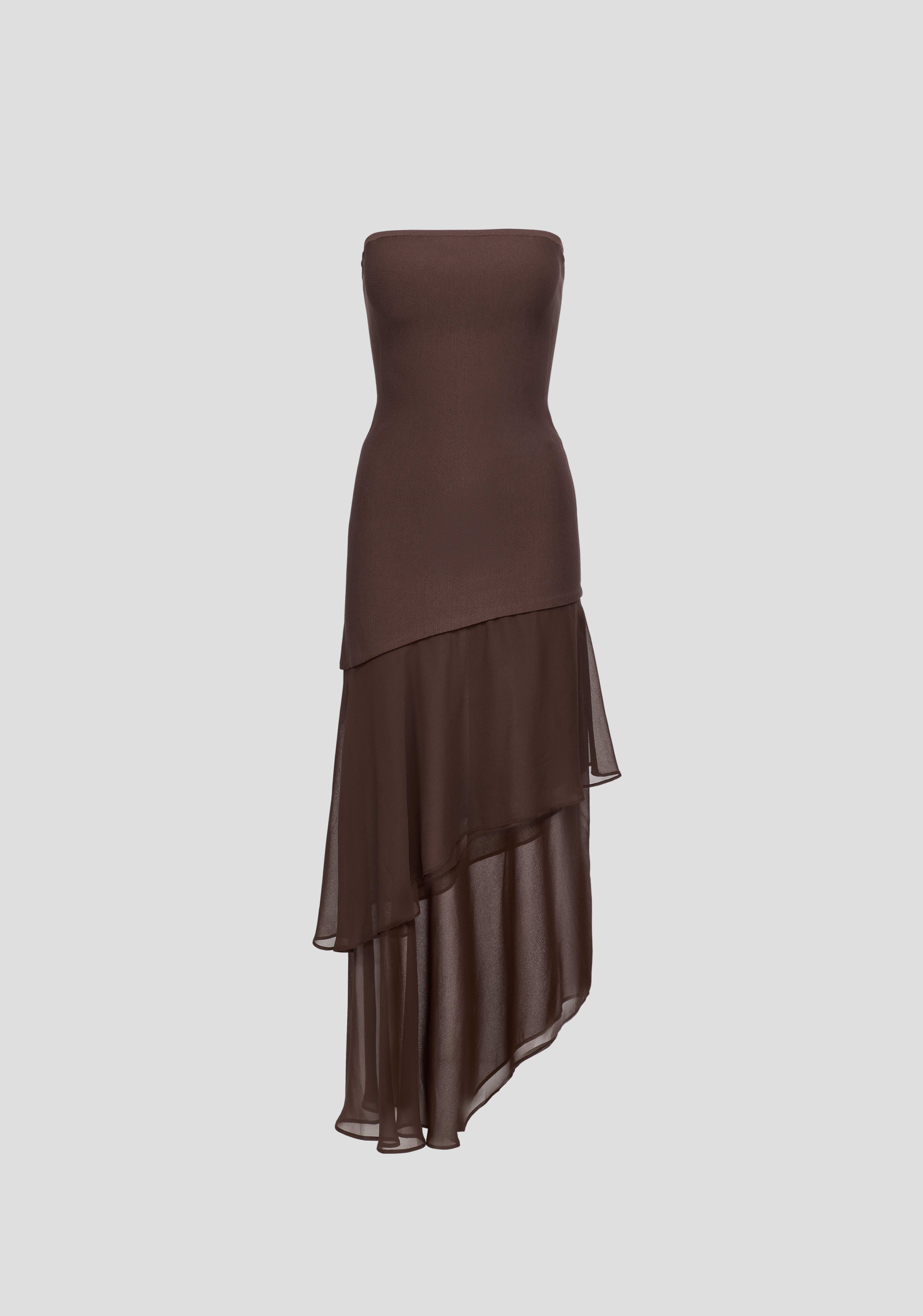 The Endearing Dress offers structure and fluidity, defined by a strapless bodice in a chestnut brown milano stitch with subtle internal boning and modern asymmetric shaping. Contrasted with an ethereal, double-layered silk georgette skirt, creating a softly sheer drape and transitional elegance. Style with the Cleo Headscarf in brown silk georgette to complete your look for your next event.