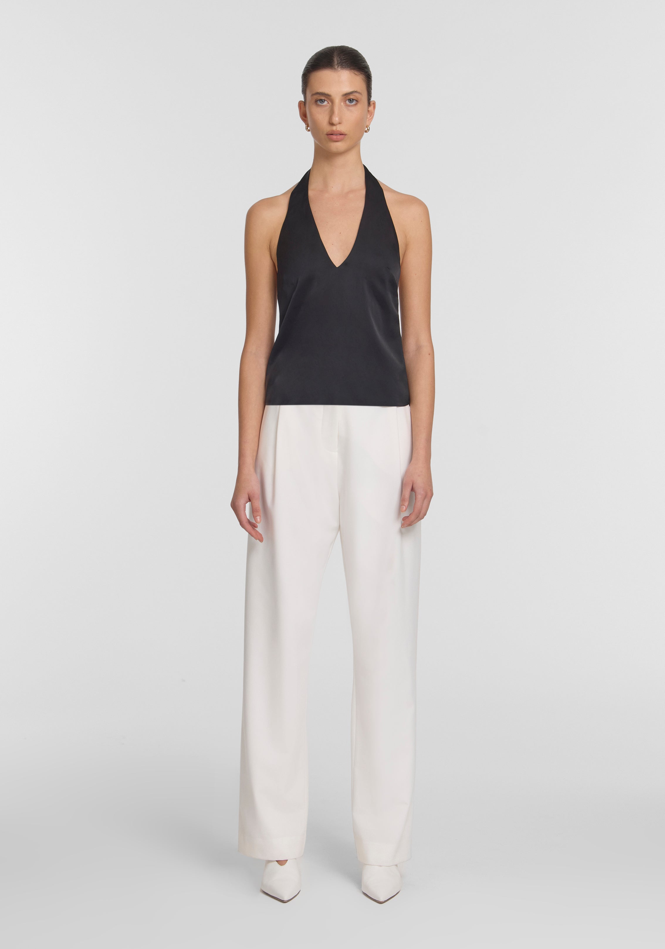 Introducing the Evian Halter Top, a refined essential crafted from lightweight cupro in classic black. This sophisticated piece features a V-neckline, french darts at the bust, and a sleek button fastening at the back for a polished finish. Effortlessly embodying timeless elegance, it’s the perfect go-to for any occasion.