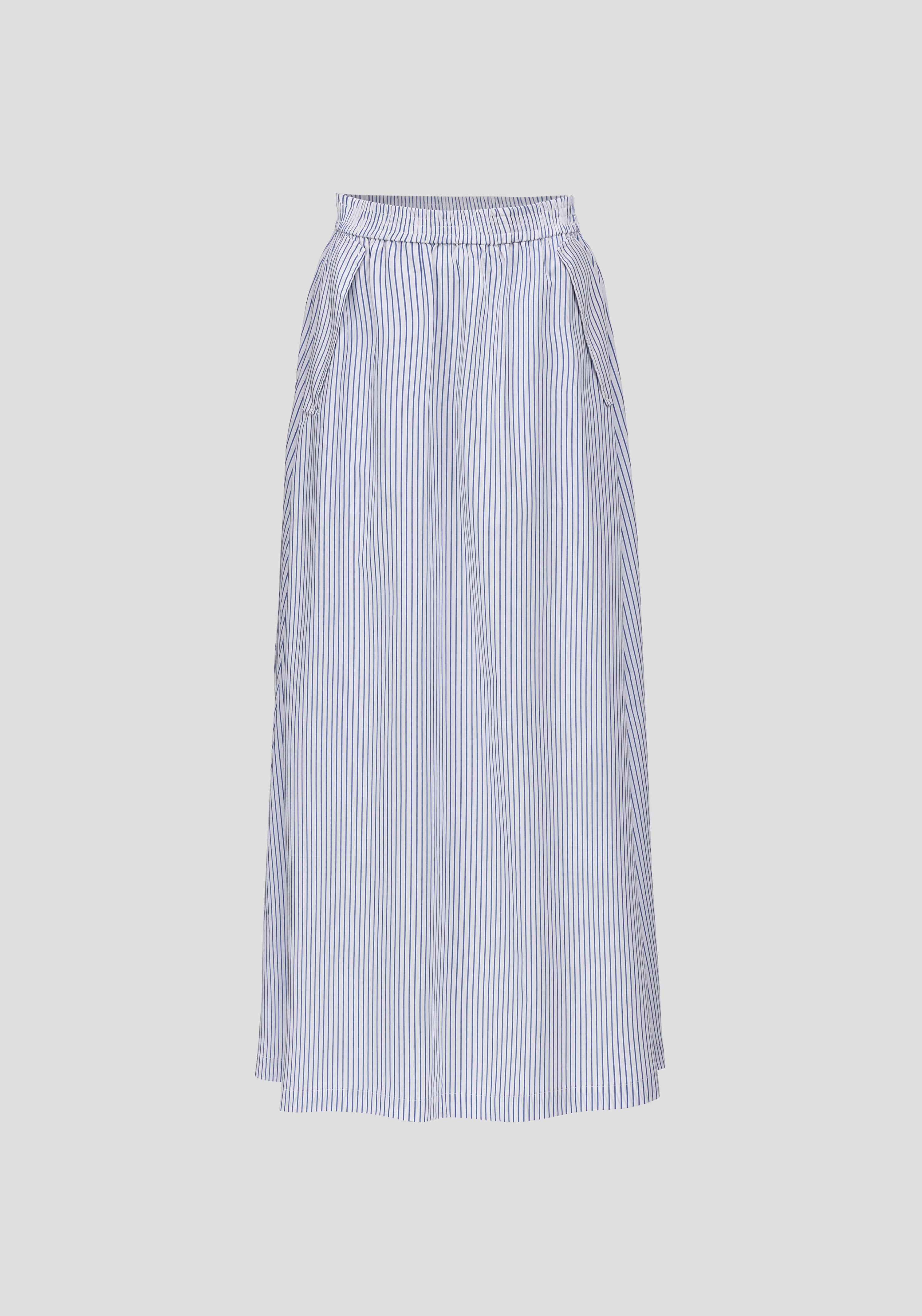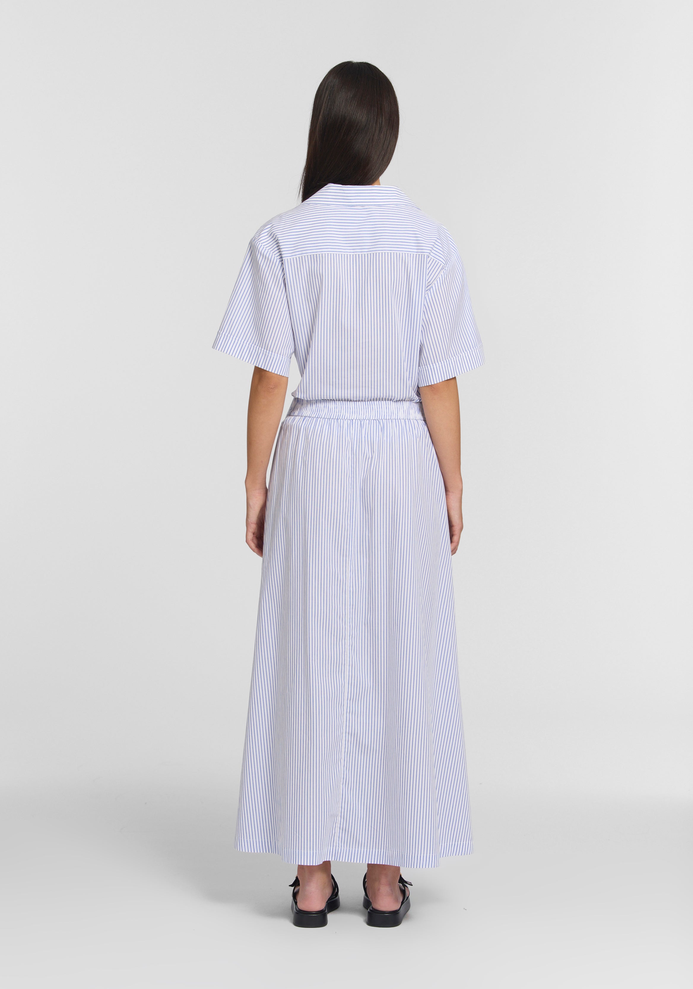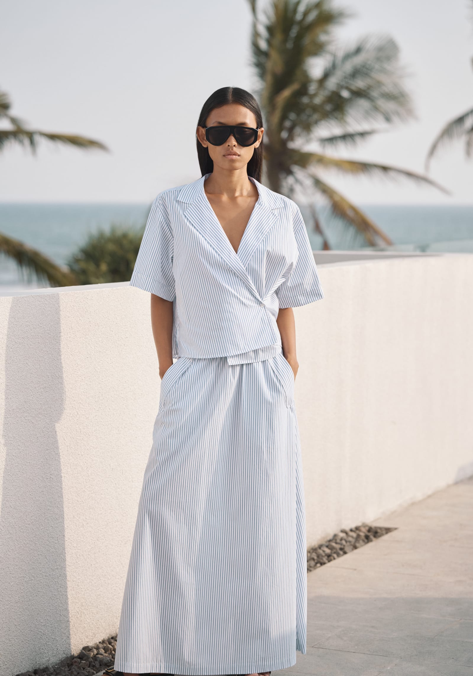 The Ezra Skirt is crafted from lightweight cotton in a timeless light blue and white stripe, evoking pure ease. Designed with an elasticated waist, A-line silhouette, and pockets, this full-length skirt delivers quiet utility and effortless wear. Pair with the Zion Shirt for a high-summer uniform, the ultimate travel companion for sun-drenched escapes.
