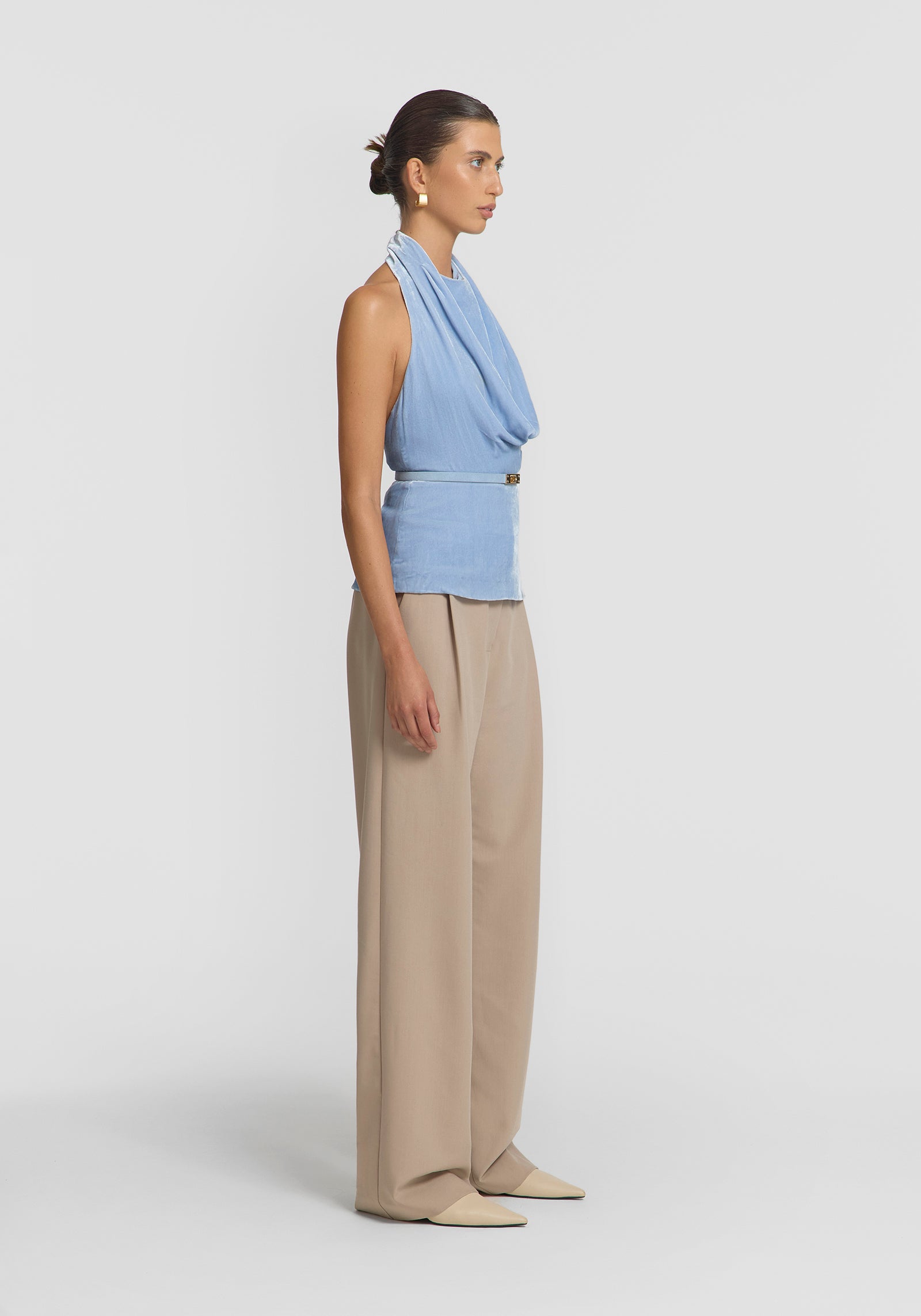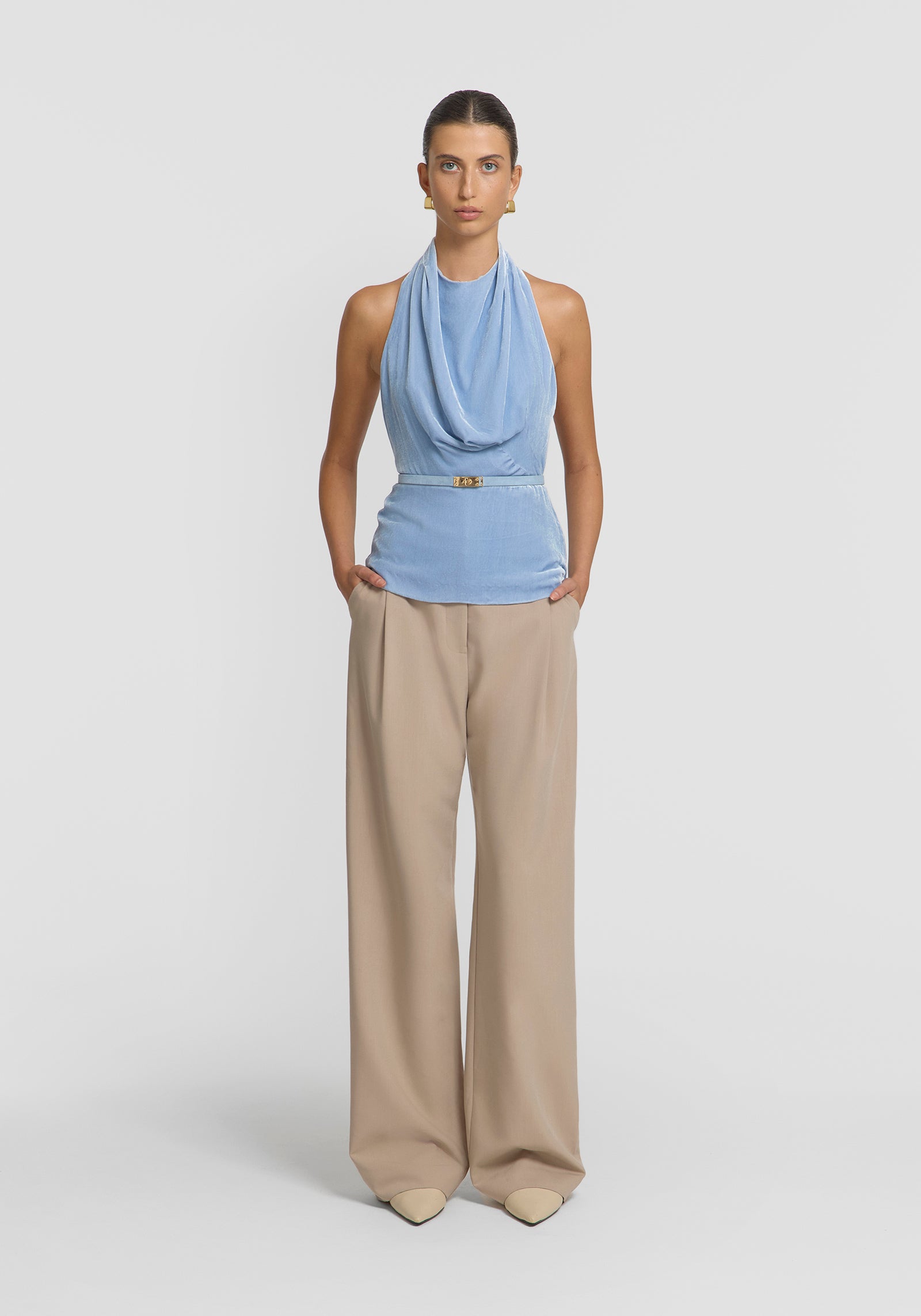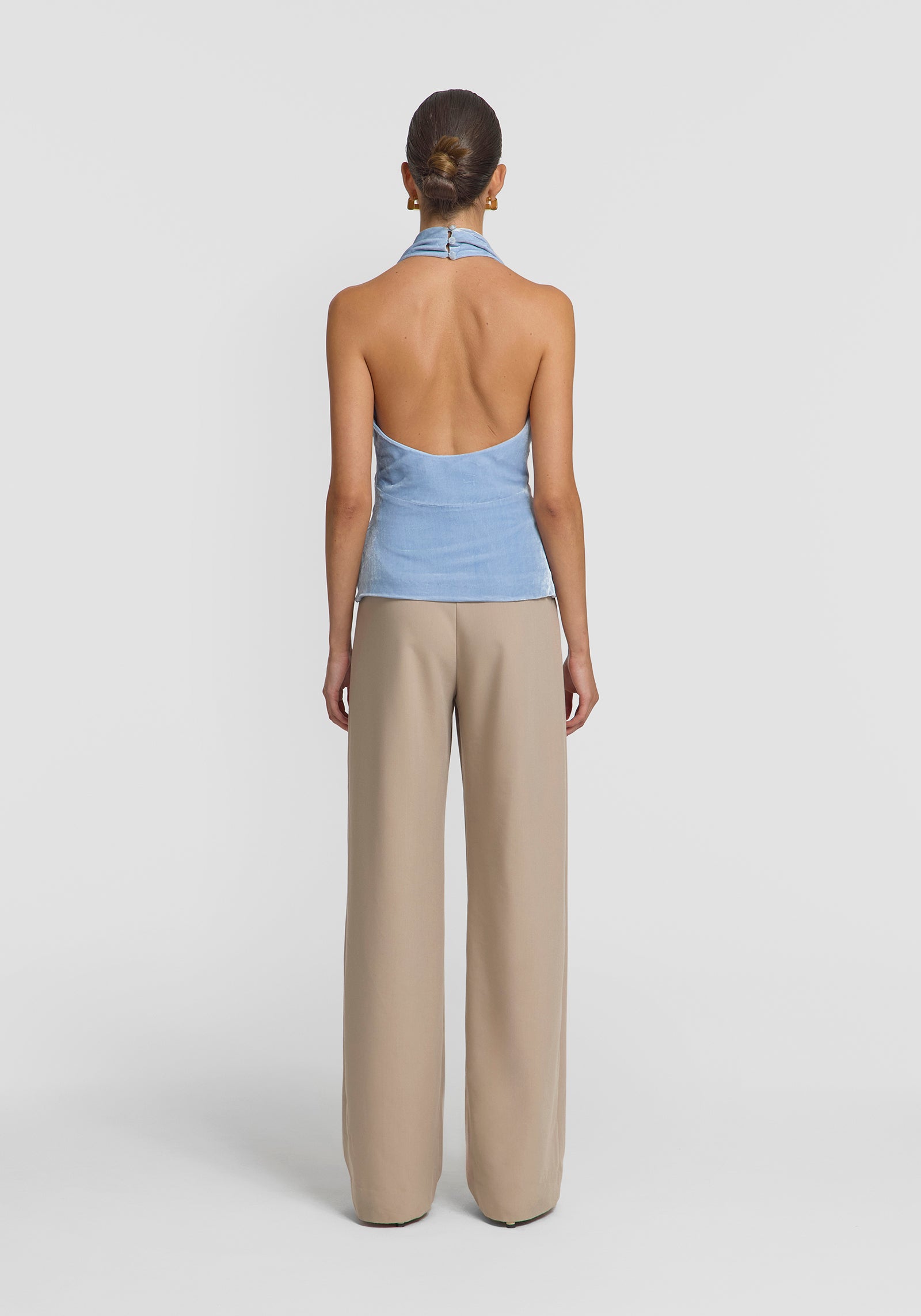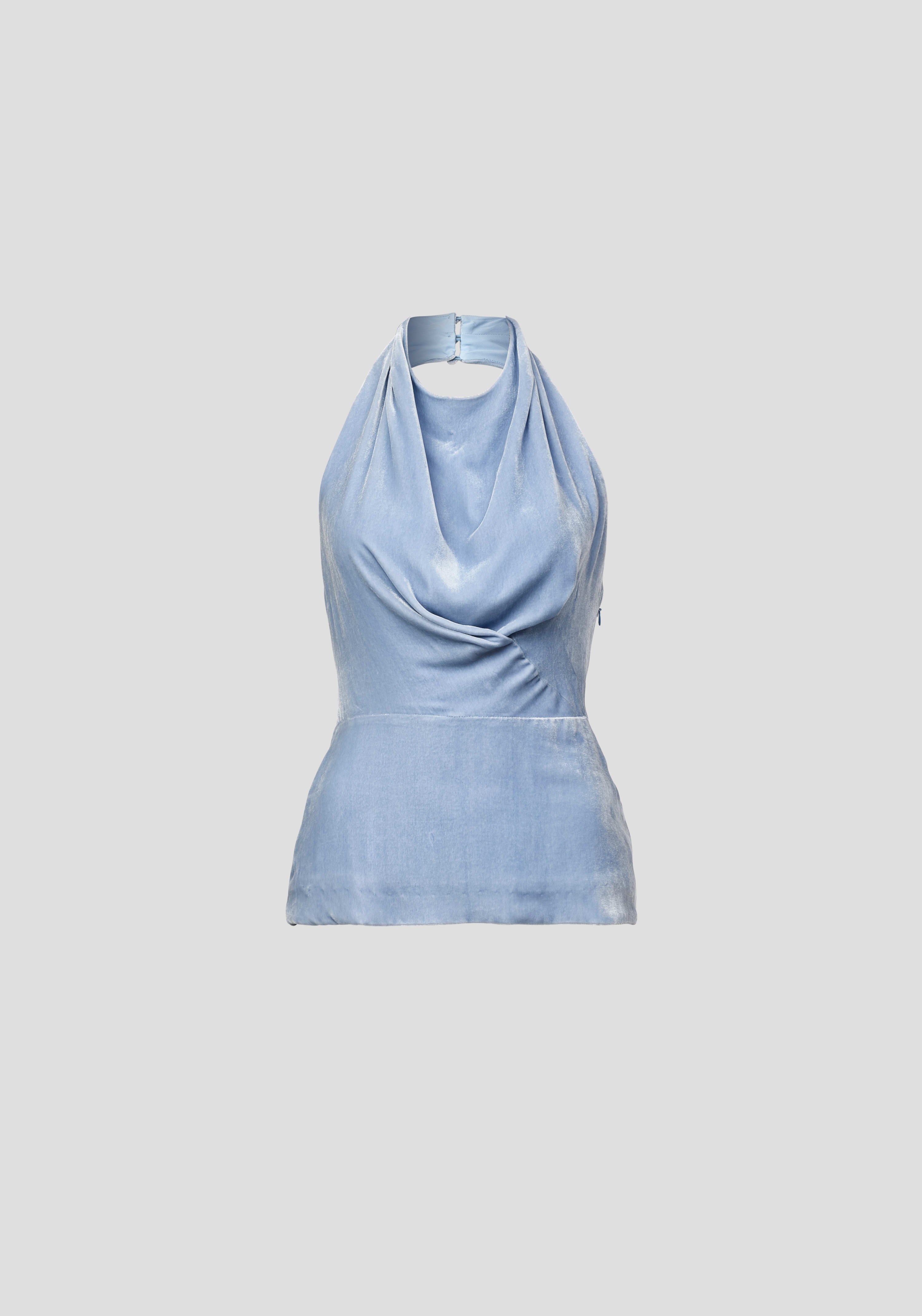The Fallen Top exudes feminine allure with its standout silhouette, luxuriously crafted in rich light blue velvet. Designed with soft tucks through the neck and an open back, it offers a flattering, modern profile. Complete the look with the Rosen Pant for an eventing set, crafted for winter elegance.