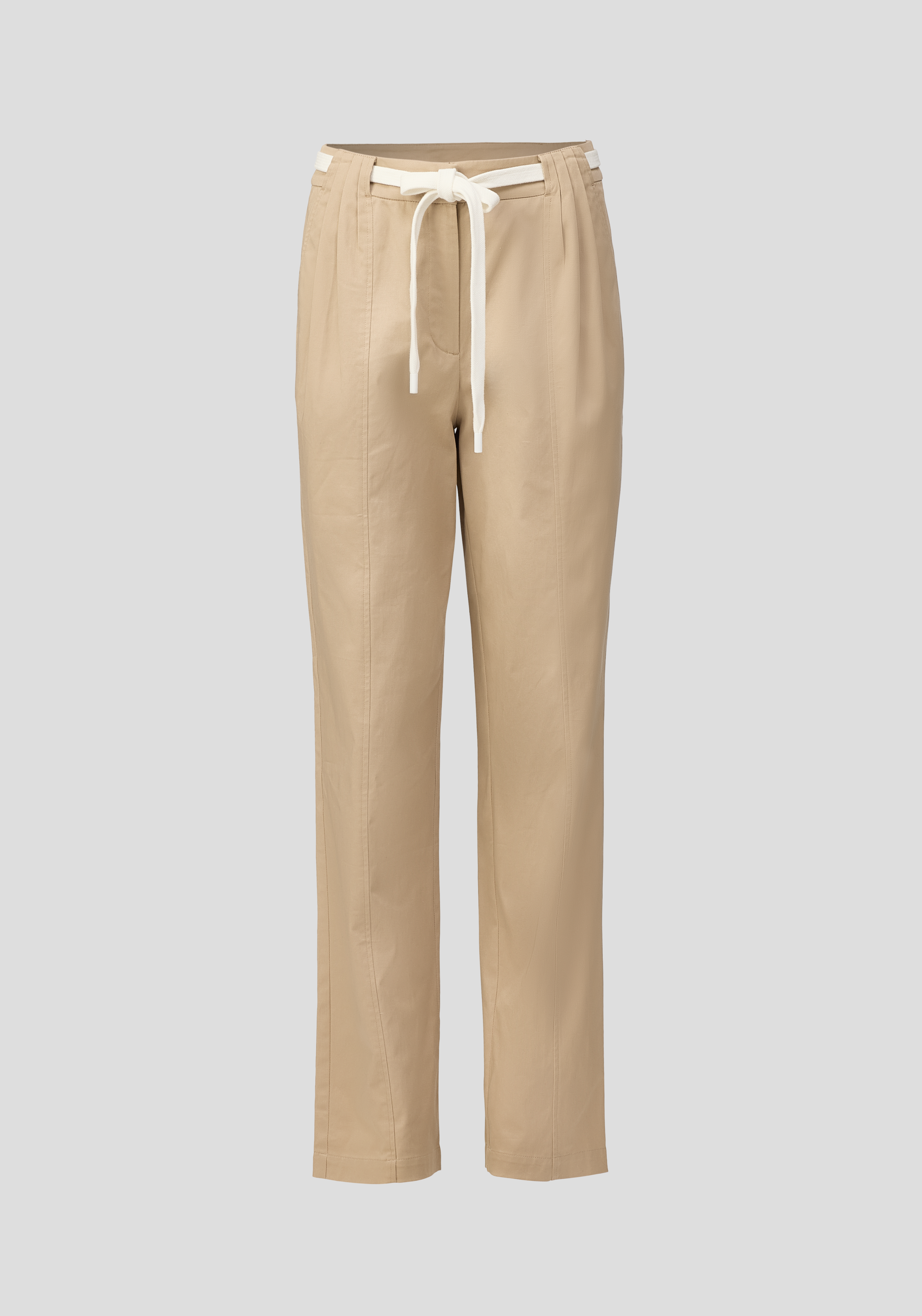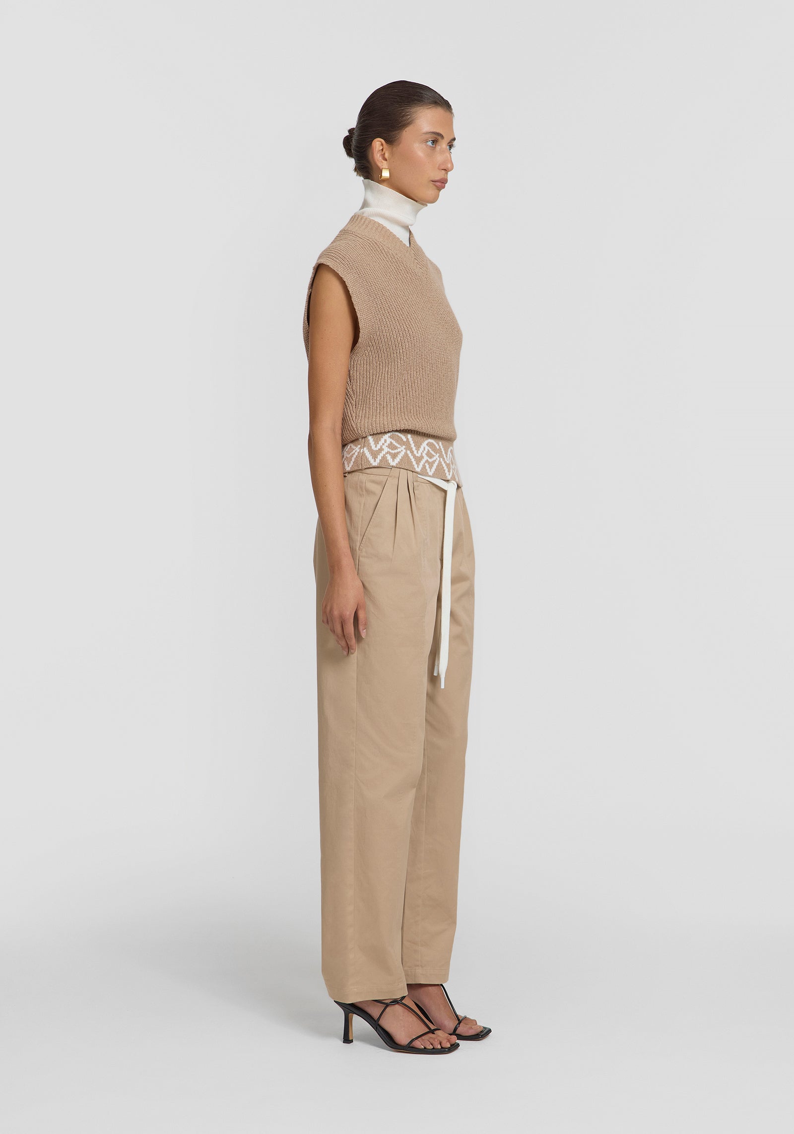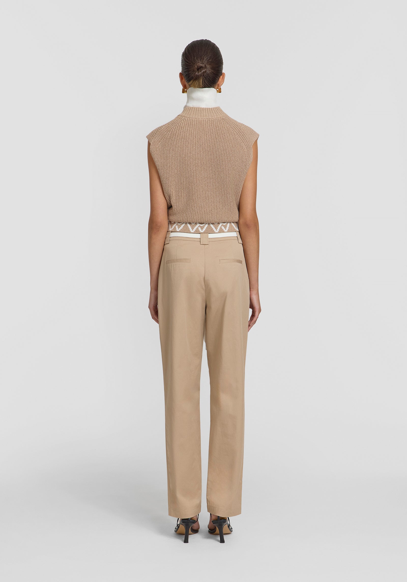 The Fletcher Trouser redefines utilitarian tailoring with an elevated touch, crafted from a cotton-blend fabrication in a classic camel hue. Defined by a striking ivory rope belt that adds a sporty edge, this mid-rise, tapered silhouette embodies timeless versatility. Finished with front slant pockets, belt loops, and centre front pleating, it pairs seamlessly with this season's foundational hues.
