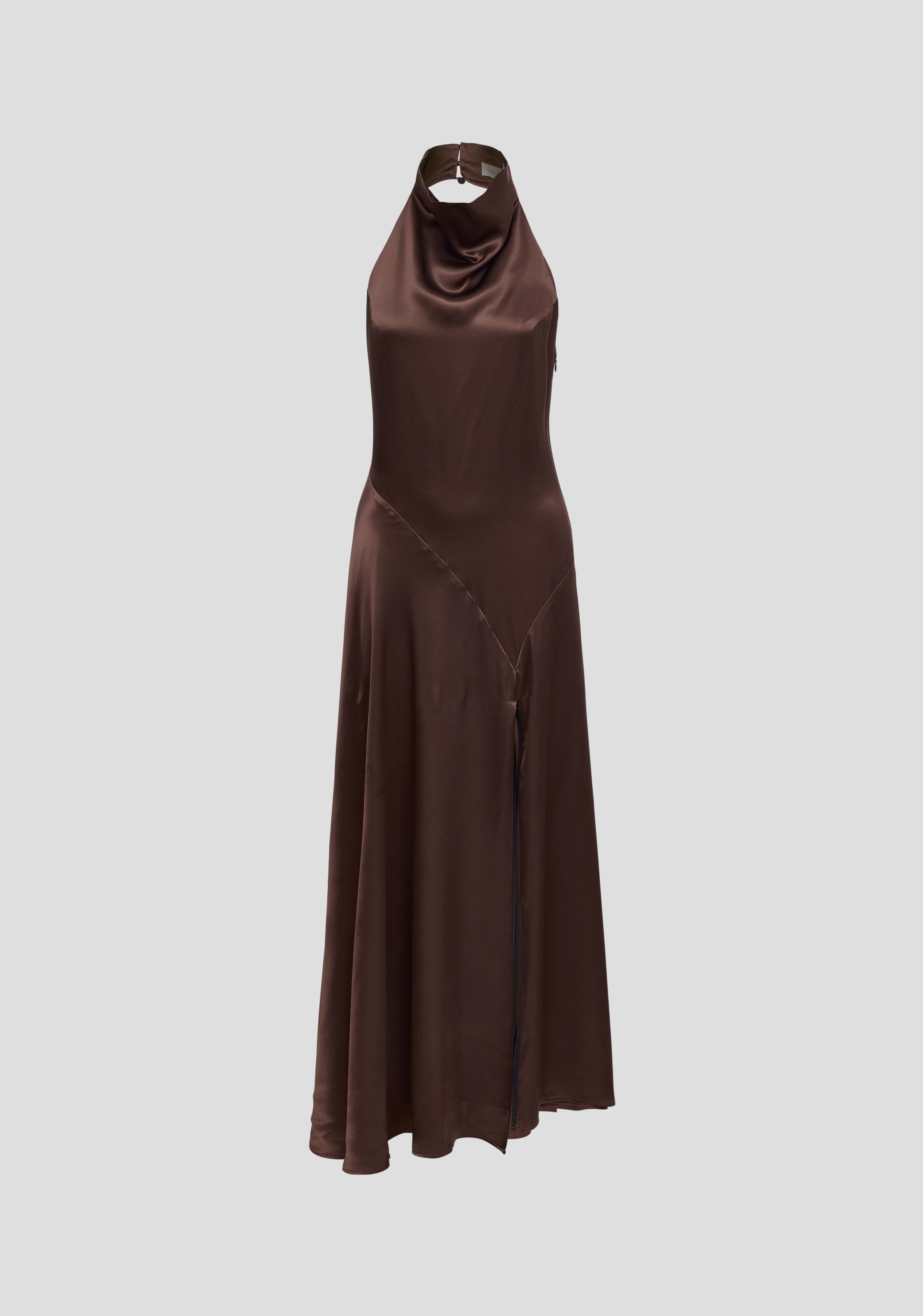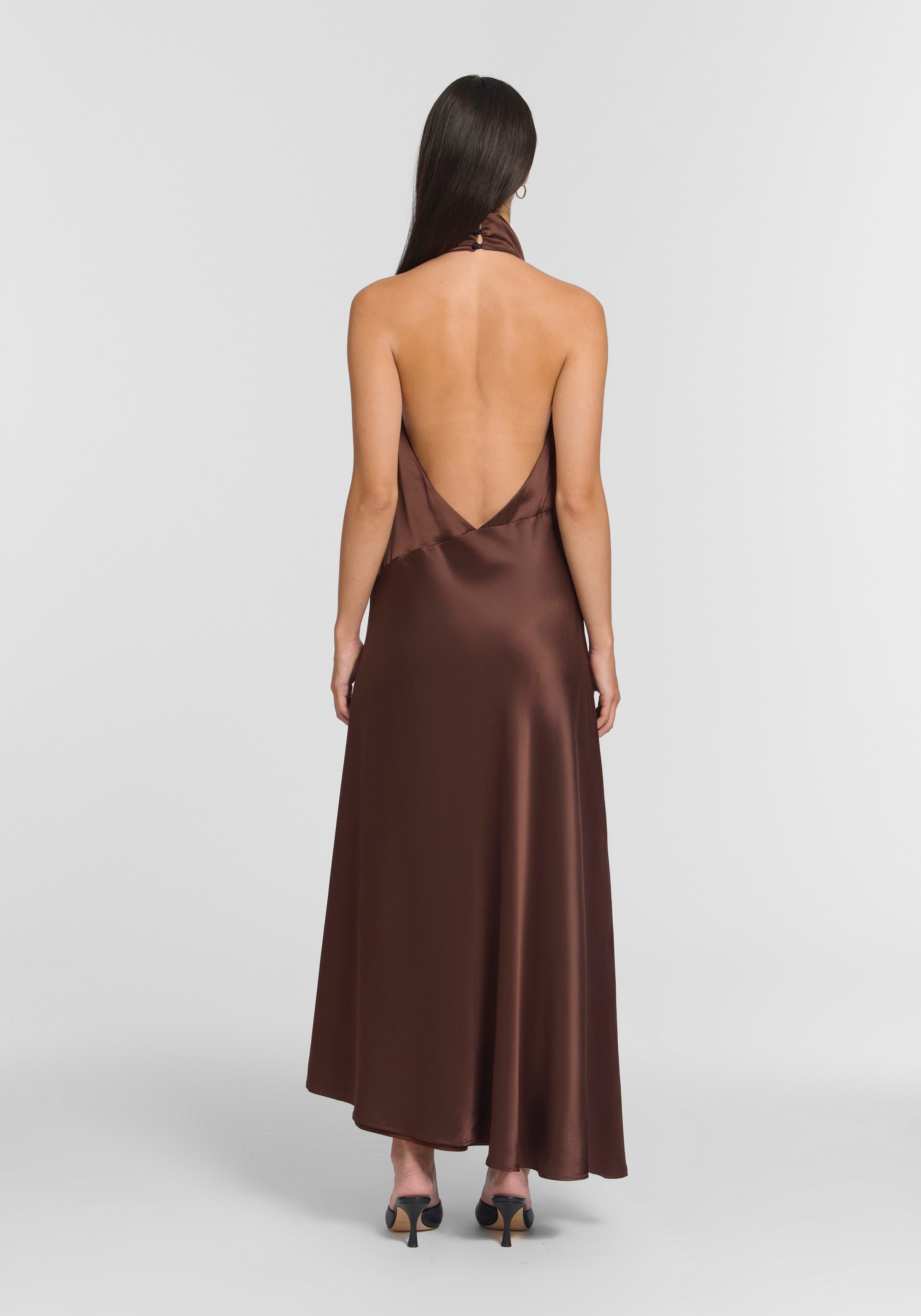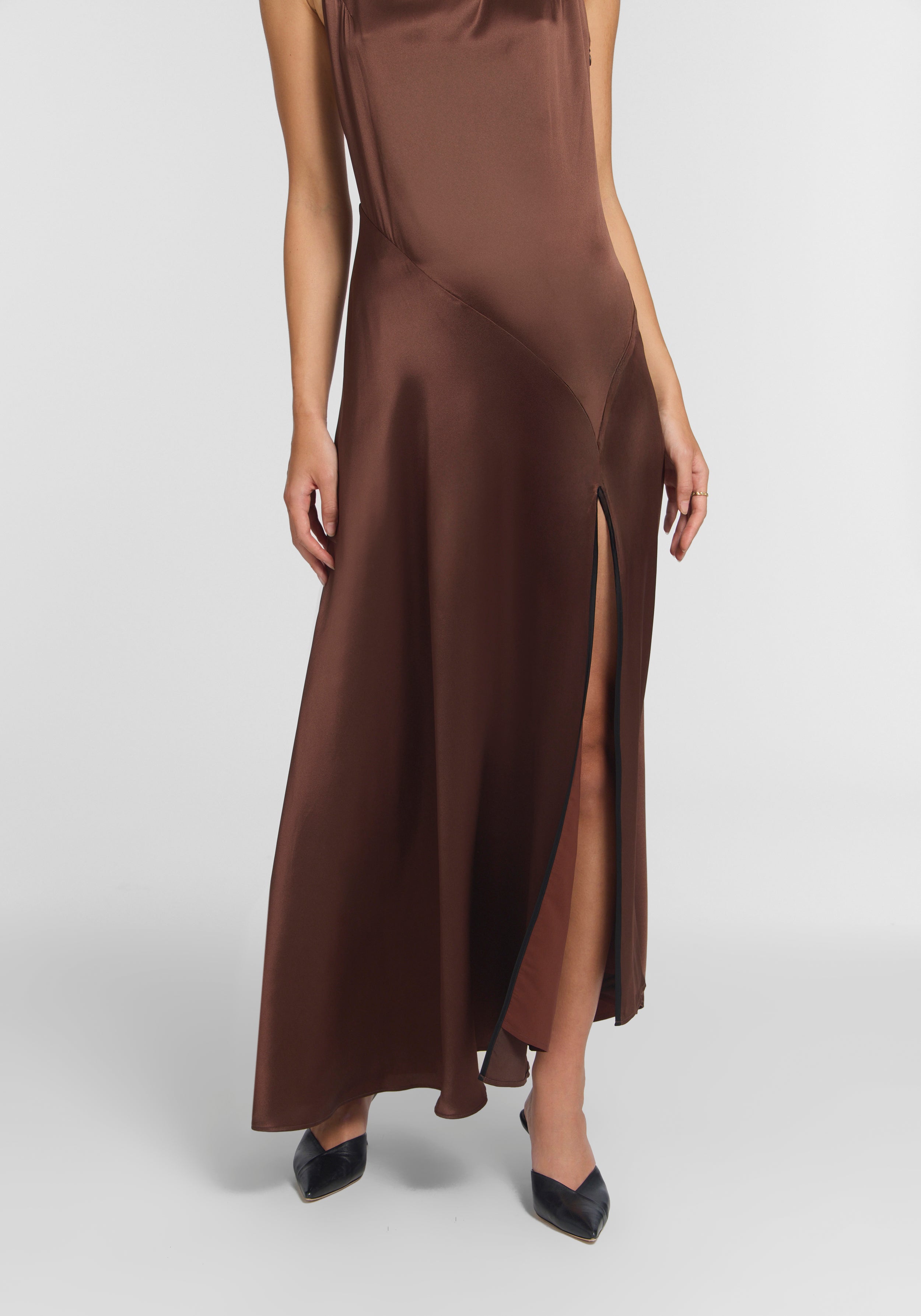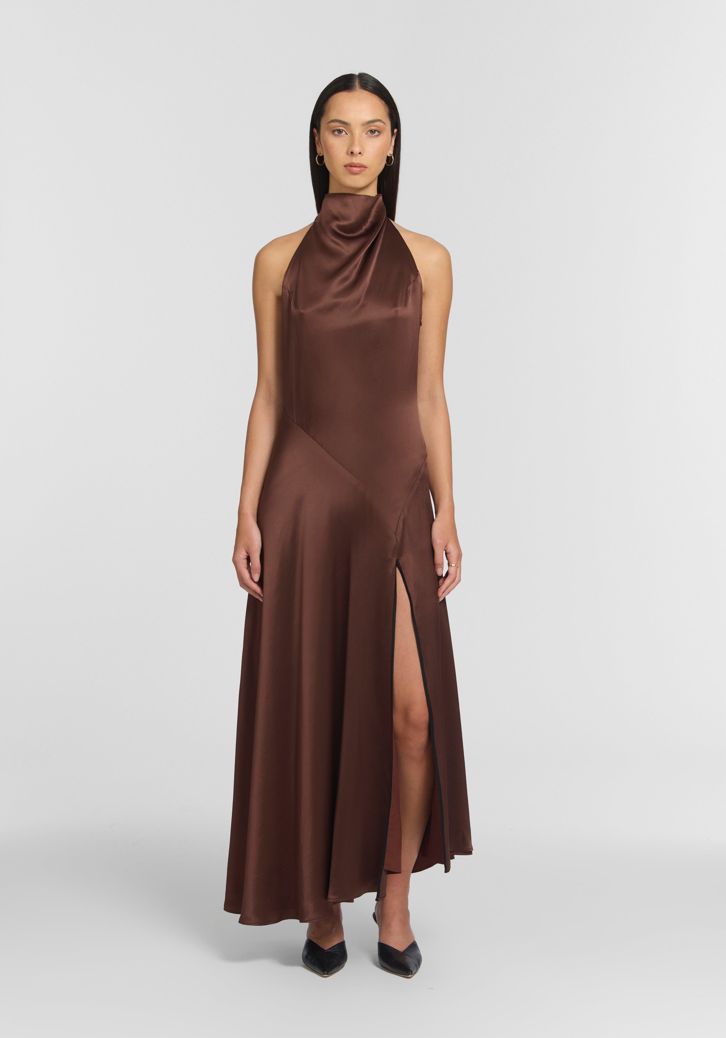 Capture the essence of captivating elegance in the Foreshadow Dress, crafted in a rich chocolate silk. Cut on the bias for a fluid drape, it showcases a halter neckline that falls to a statement low back, a high split and subtle contrast black binding. Accessorise with the Harvey Bag in Zebra for a striking finish - an effortless look for spring event dressing.