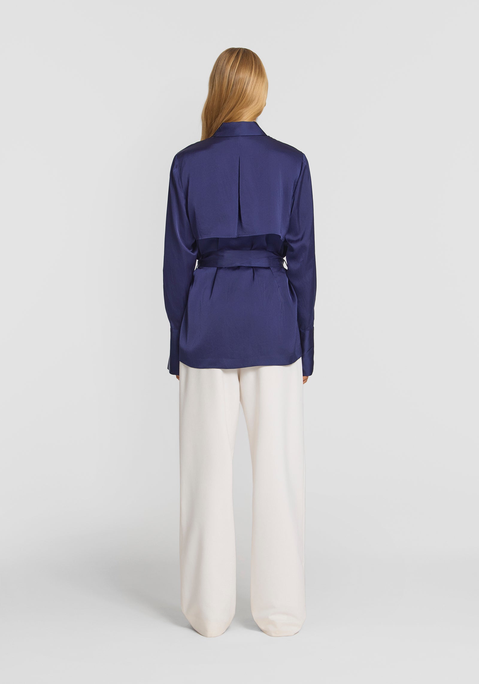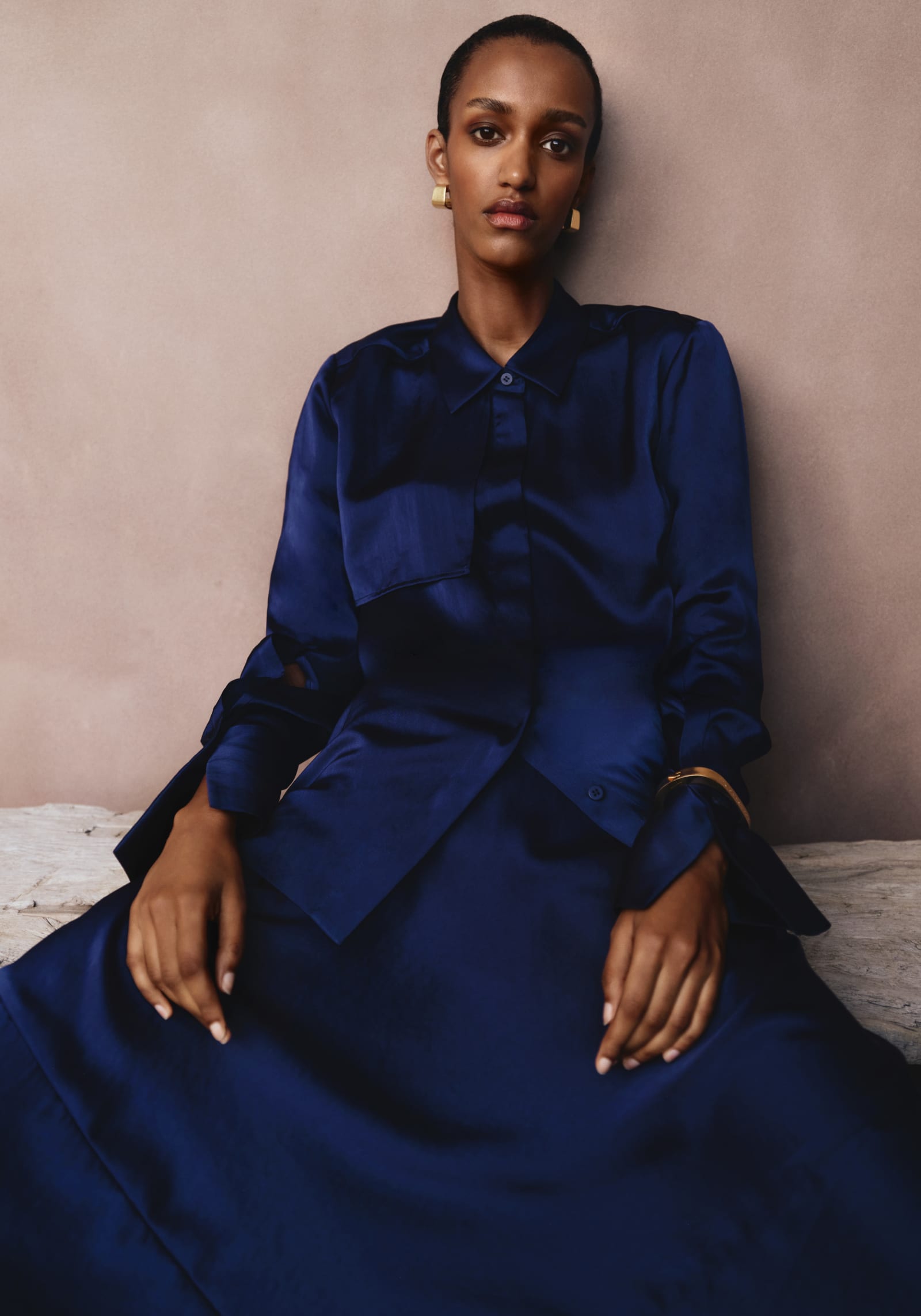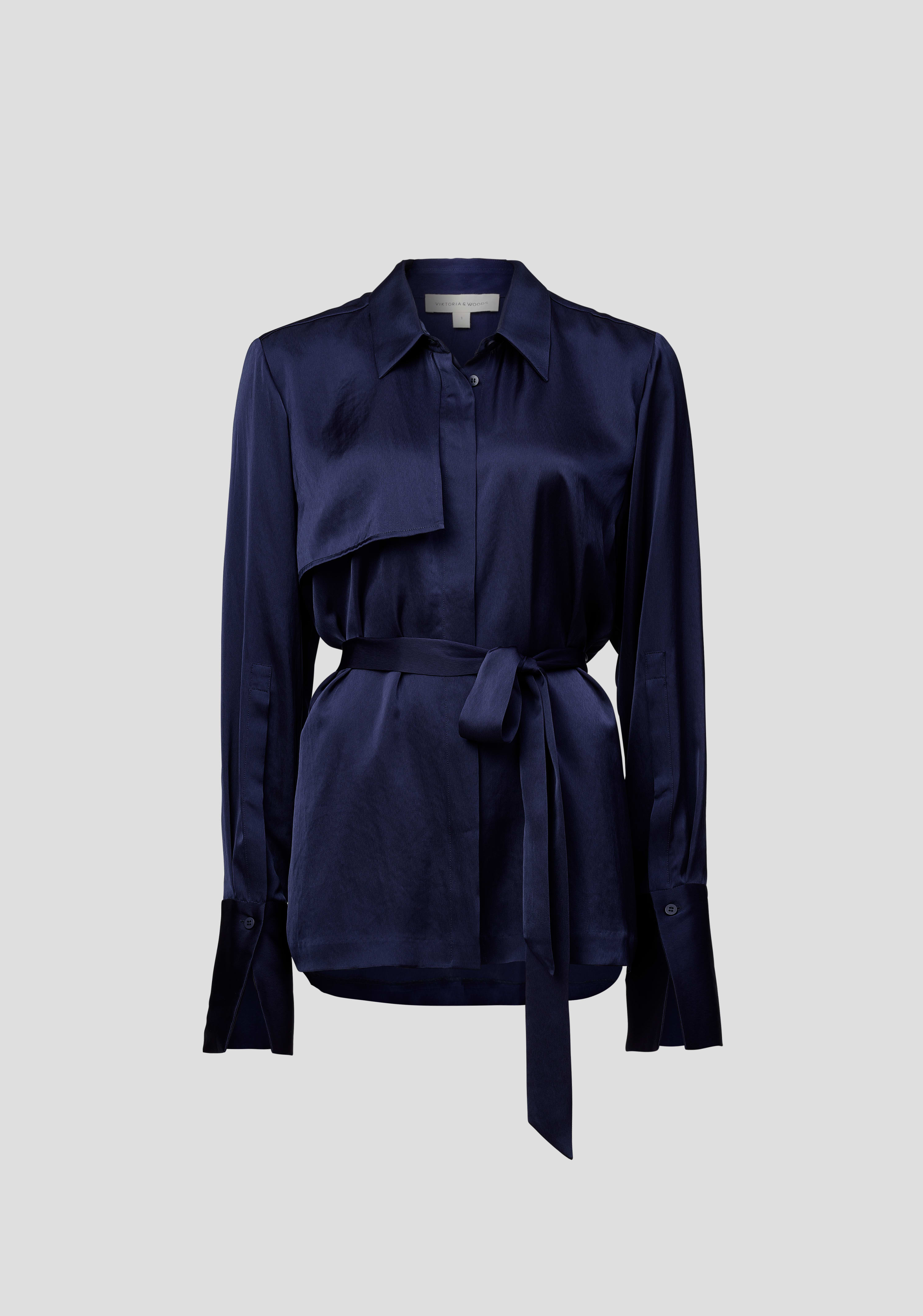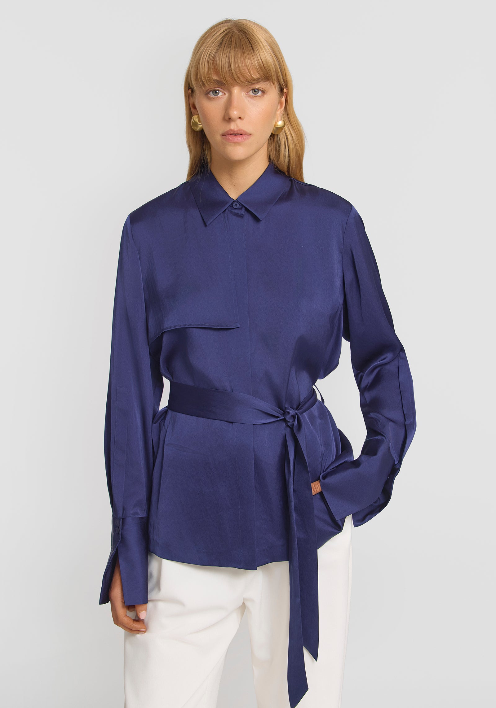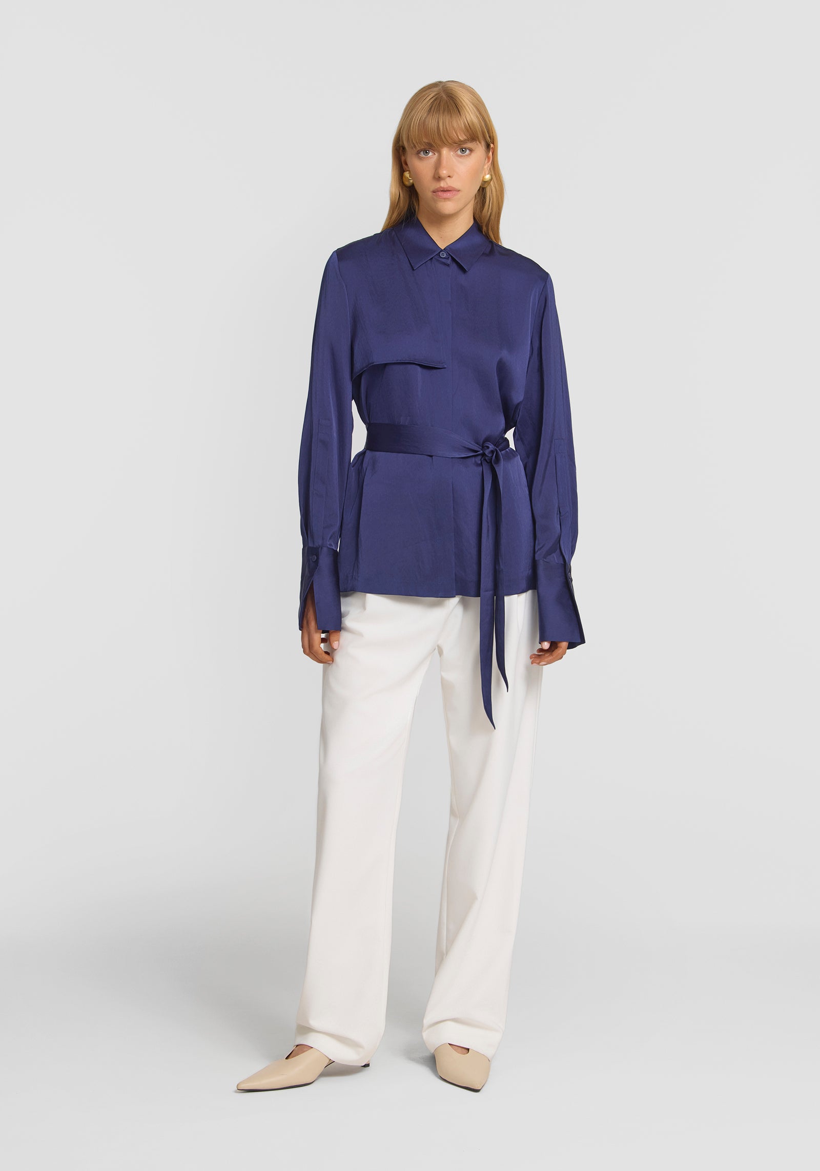 The Formation Shirt is a testament to refined elegance, crafted from a deep blue cupro blend. Featuring traditional shirt detailing with considered storm flap accents, exaggerated cuffs, and a removable tie for versatile styling. Pair with the Whirlwind Pant or Viola Skirt for a set that exudes understated opulence.