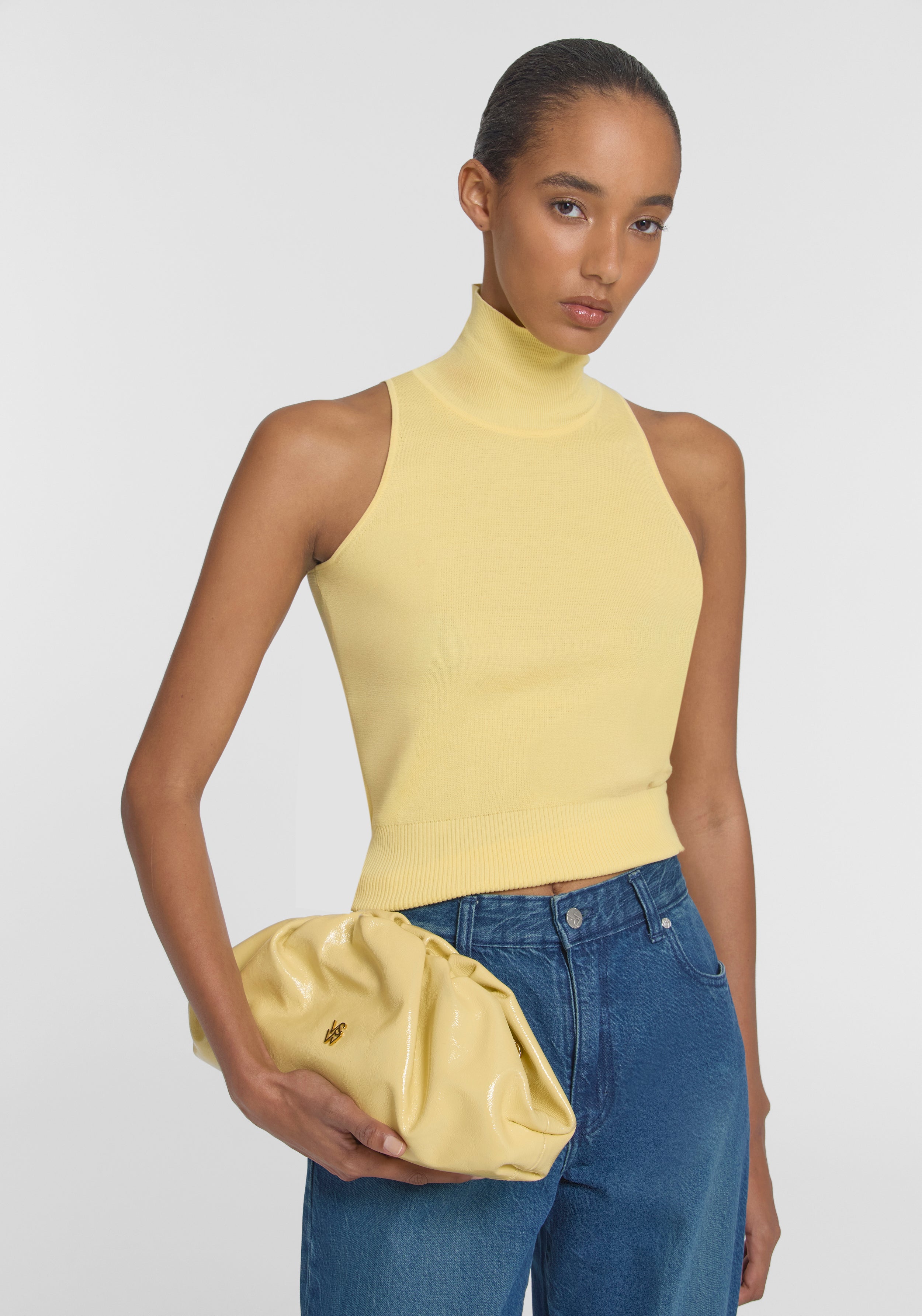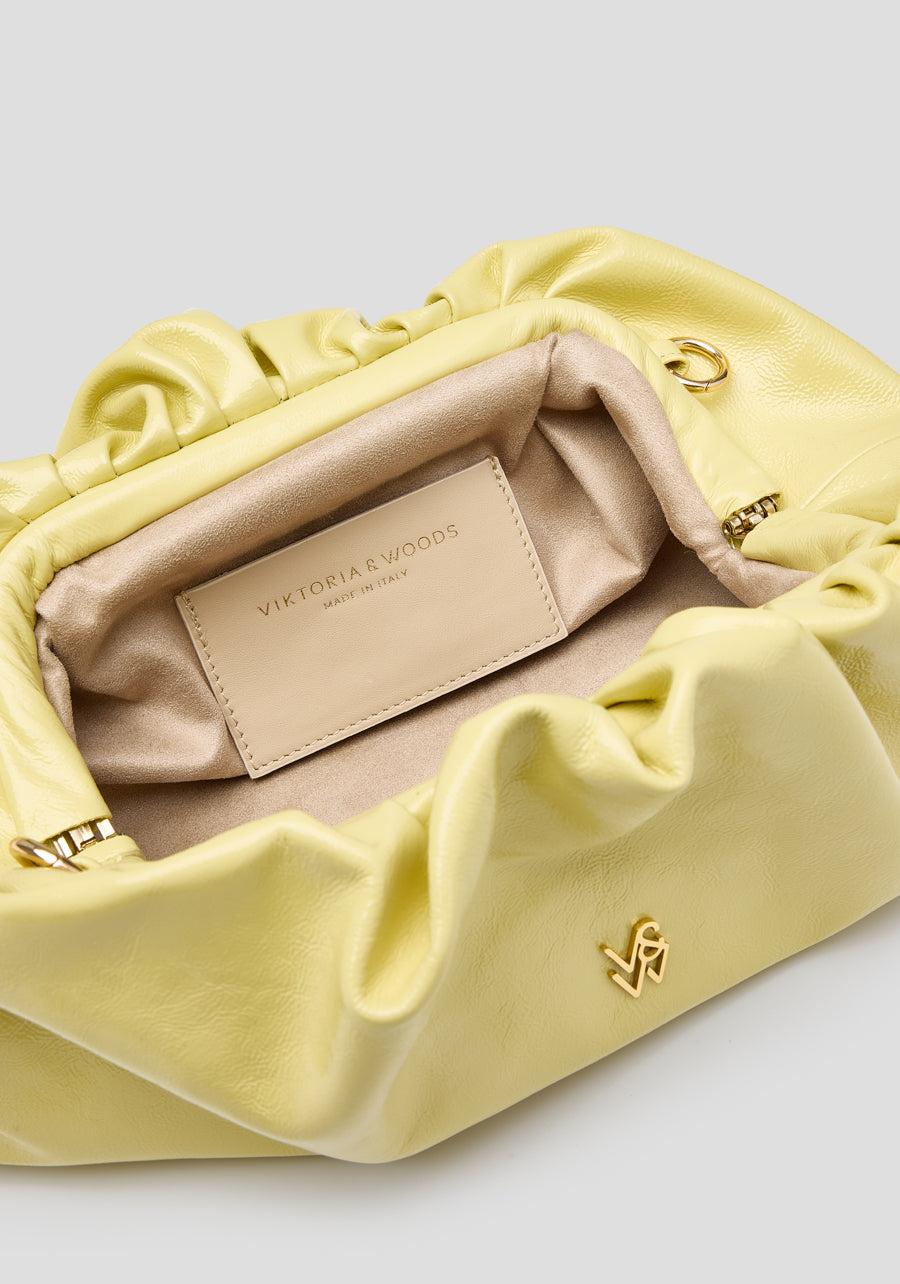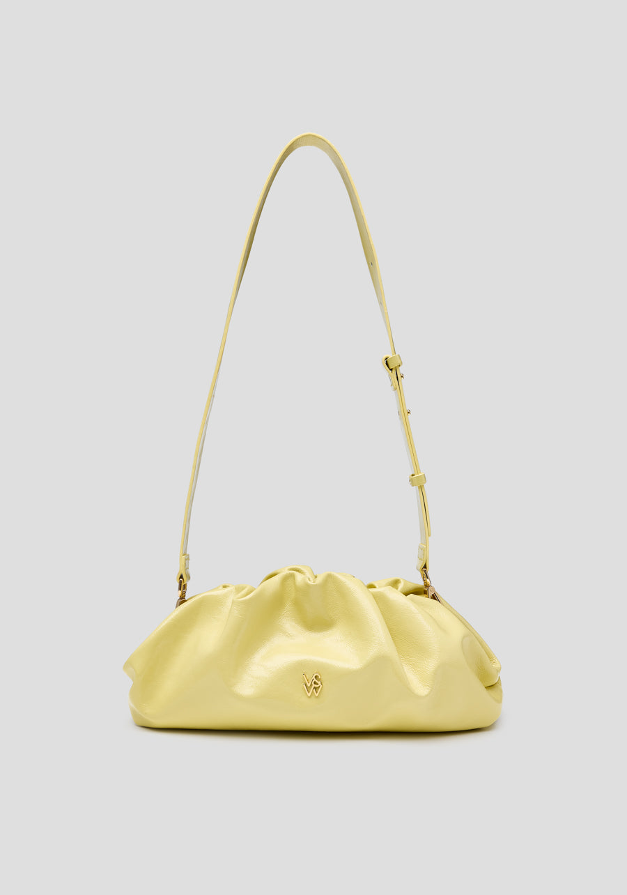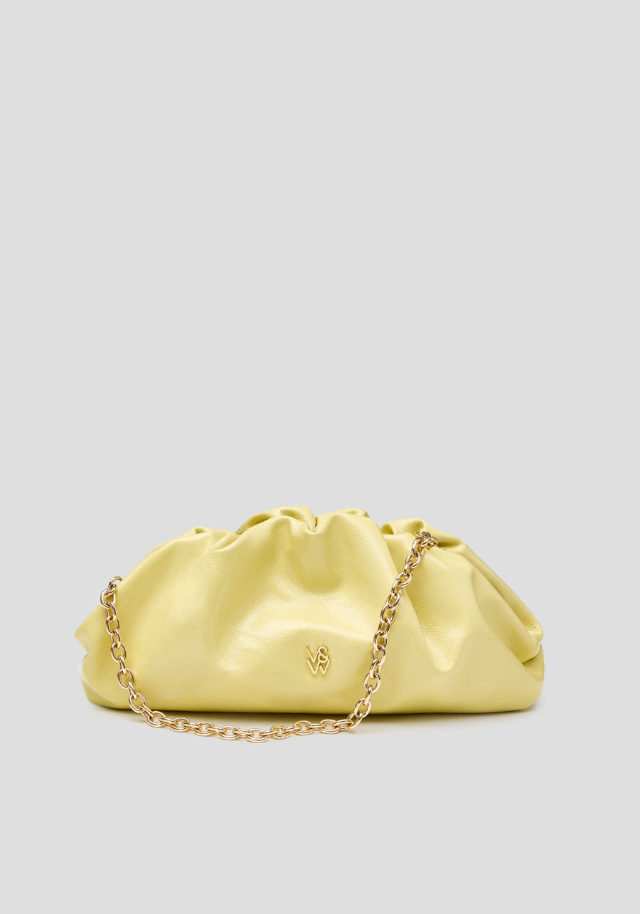 The Frankie Bag returns, a baguette-style clutch crafted from tumbled patent yellow leather. Detailed with gathered accents and adorned with intricate gold logo hardware, it features an internal pocket and a removable chain strap. Versatile and timeless, this bag adds an effortlessly vibrant touch to elevate any look.