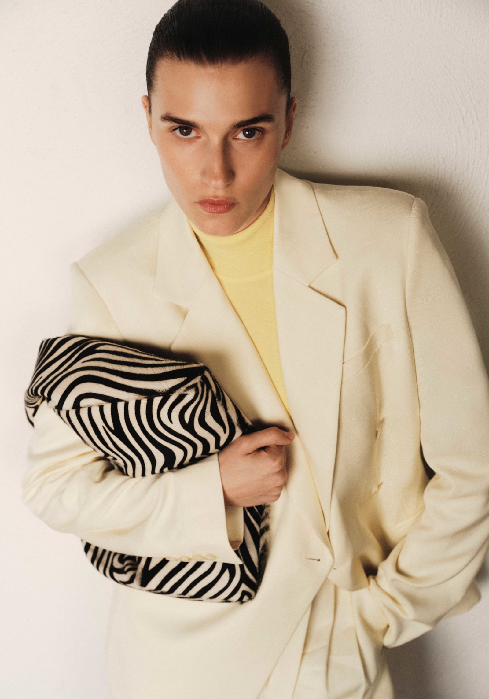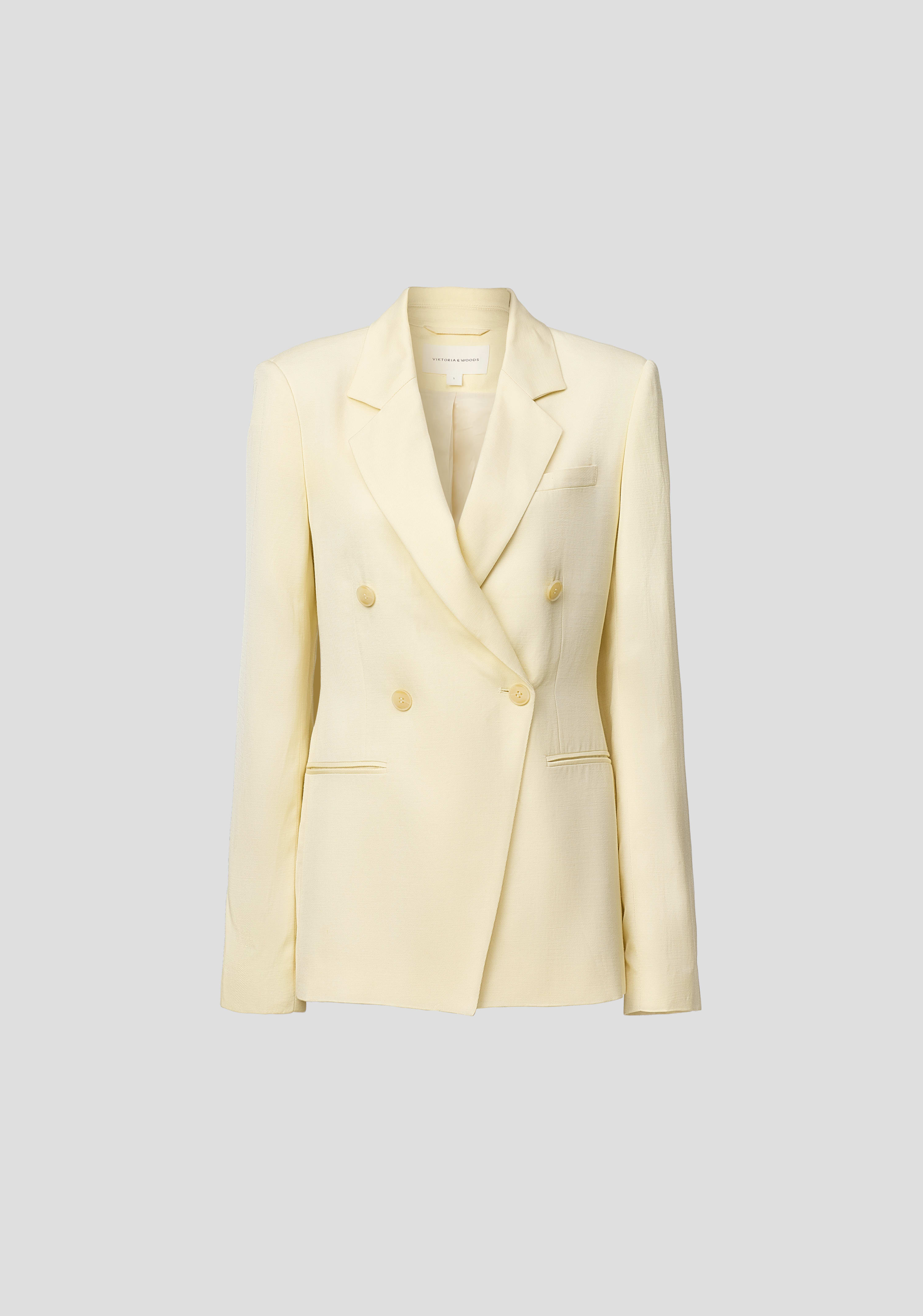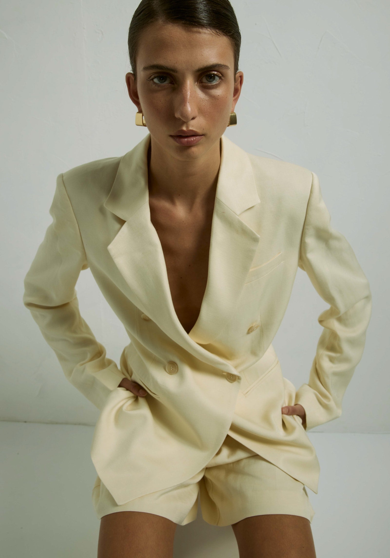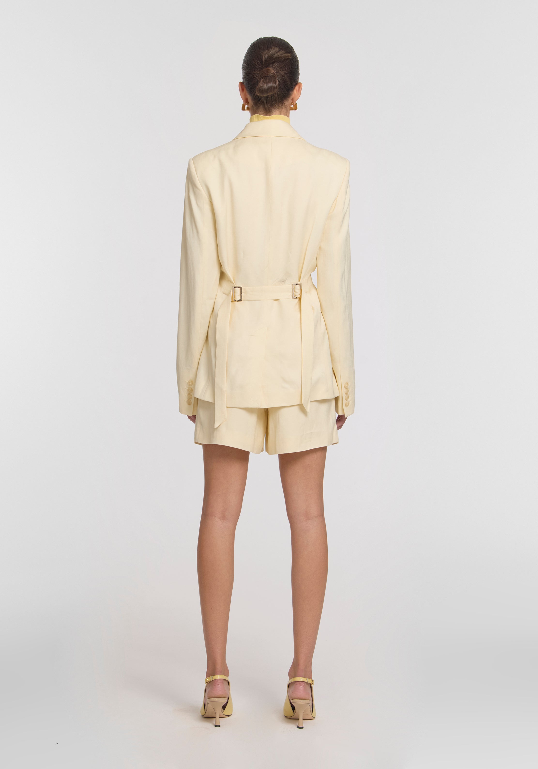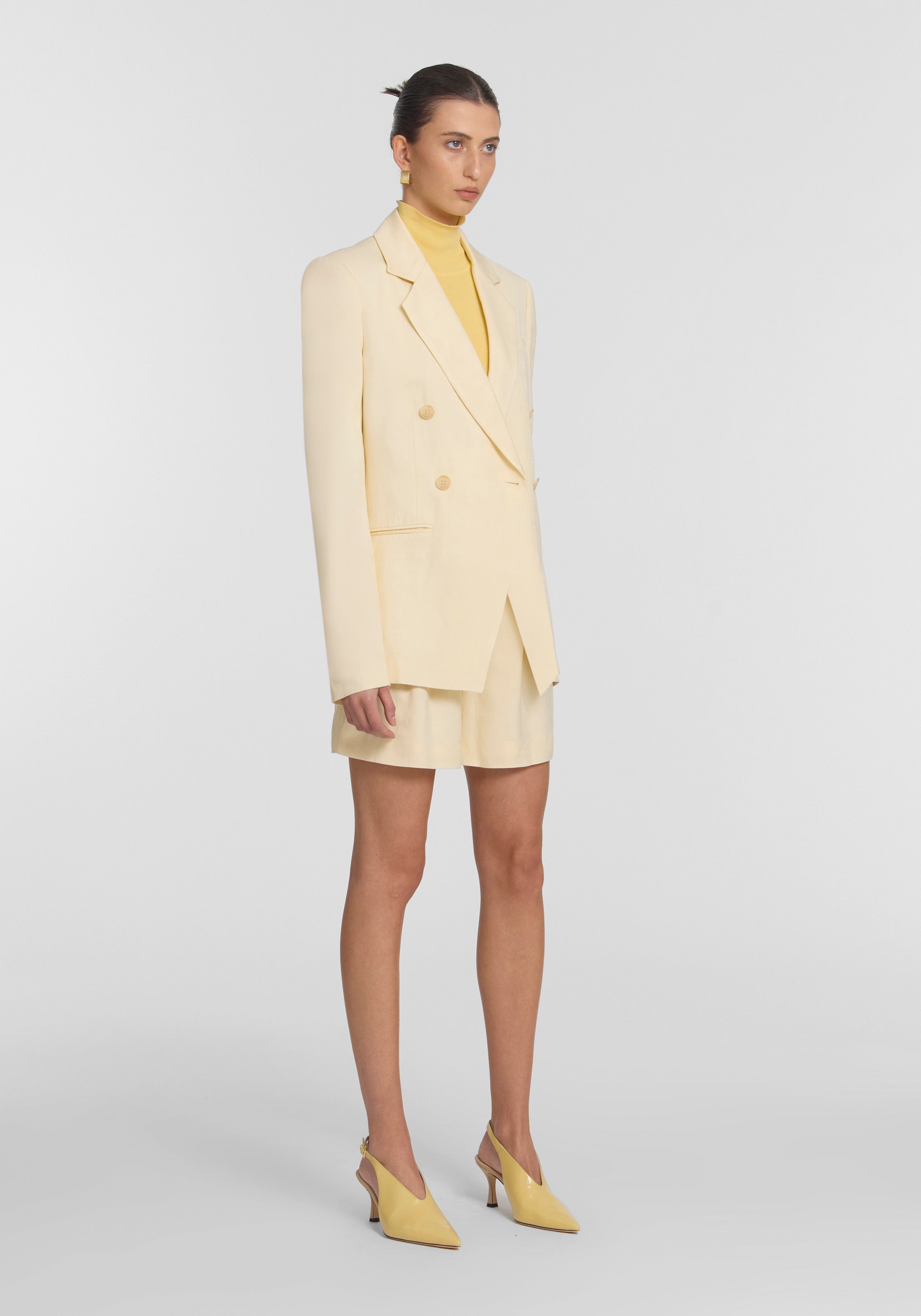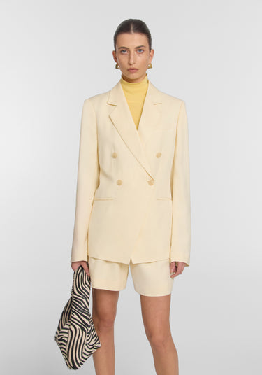 The Freefall Blazer, refined in soft yellow, embodies sophisticated tactility. Its double-breasted silhouette features a notched collar, sharp shoulders, logo buttons and pocket detailing. Complete with a belt to cinch the waist, it accentuates its considered proportions. Pair with the matching Seneca Short for a tailored set or with the Atlantis Pant for a subtle contrast of fabrications and hues.