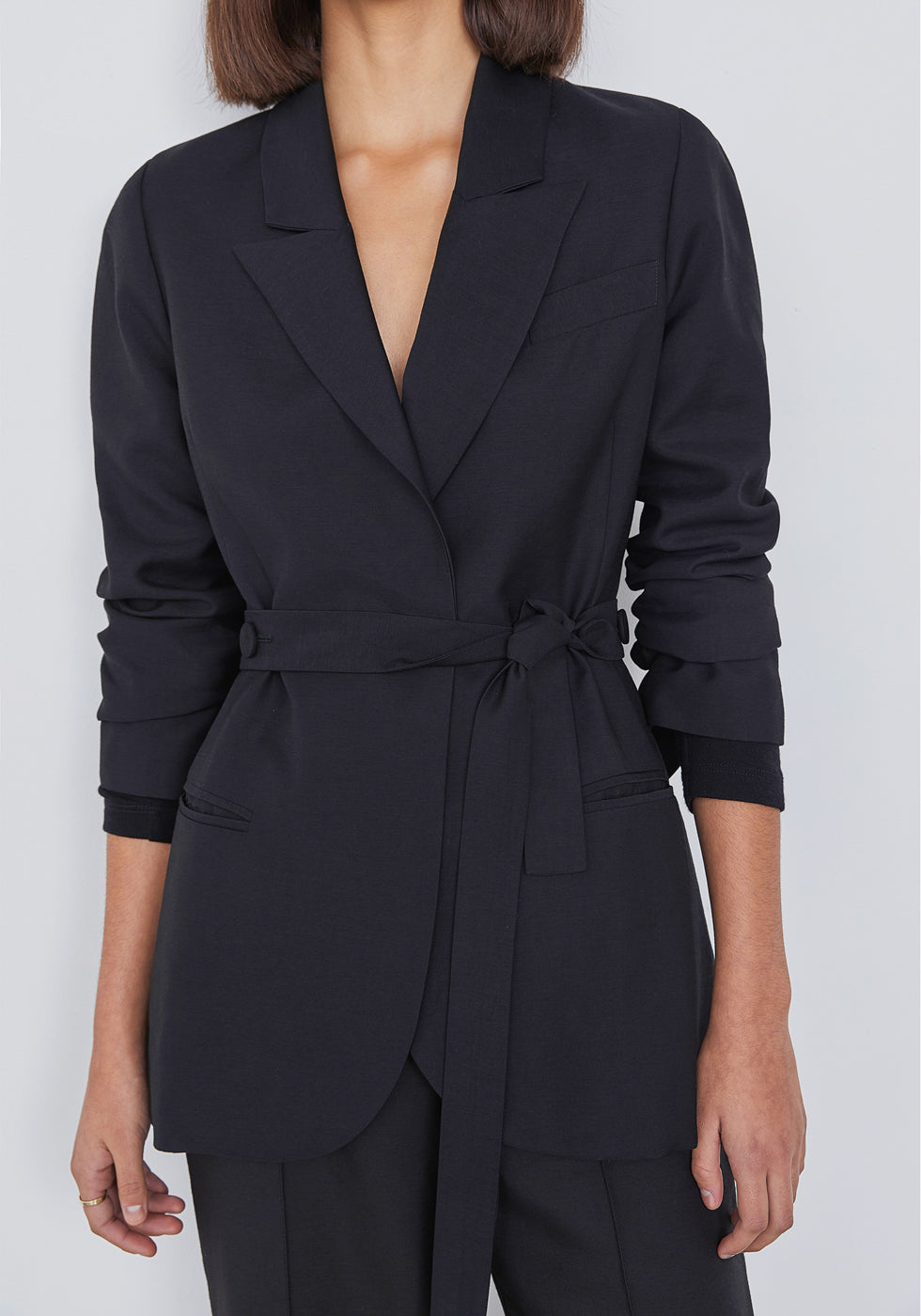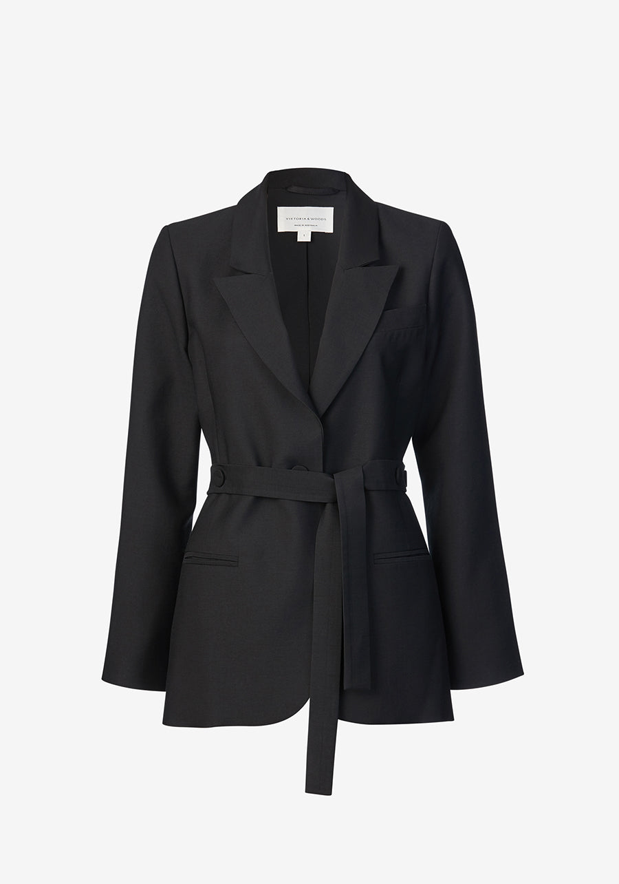 Rendered in our signature bamboo blend fabric, the Frequency Blazer is a softly tailored essential with modern button detailing. Designed with a classic collar and lapel, functional front pockets and matching waist belt for optional styling.