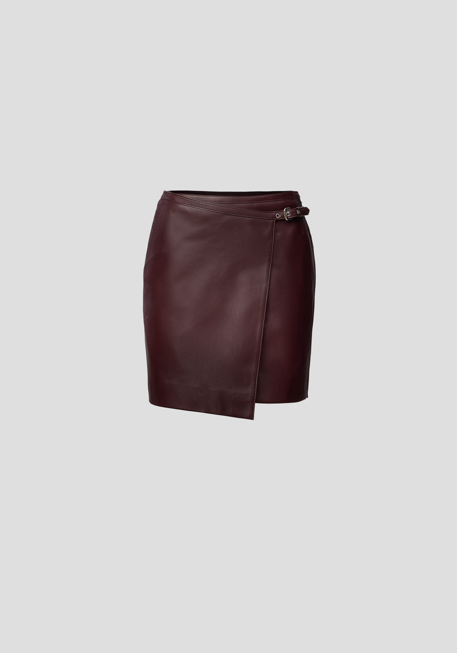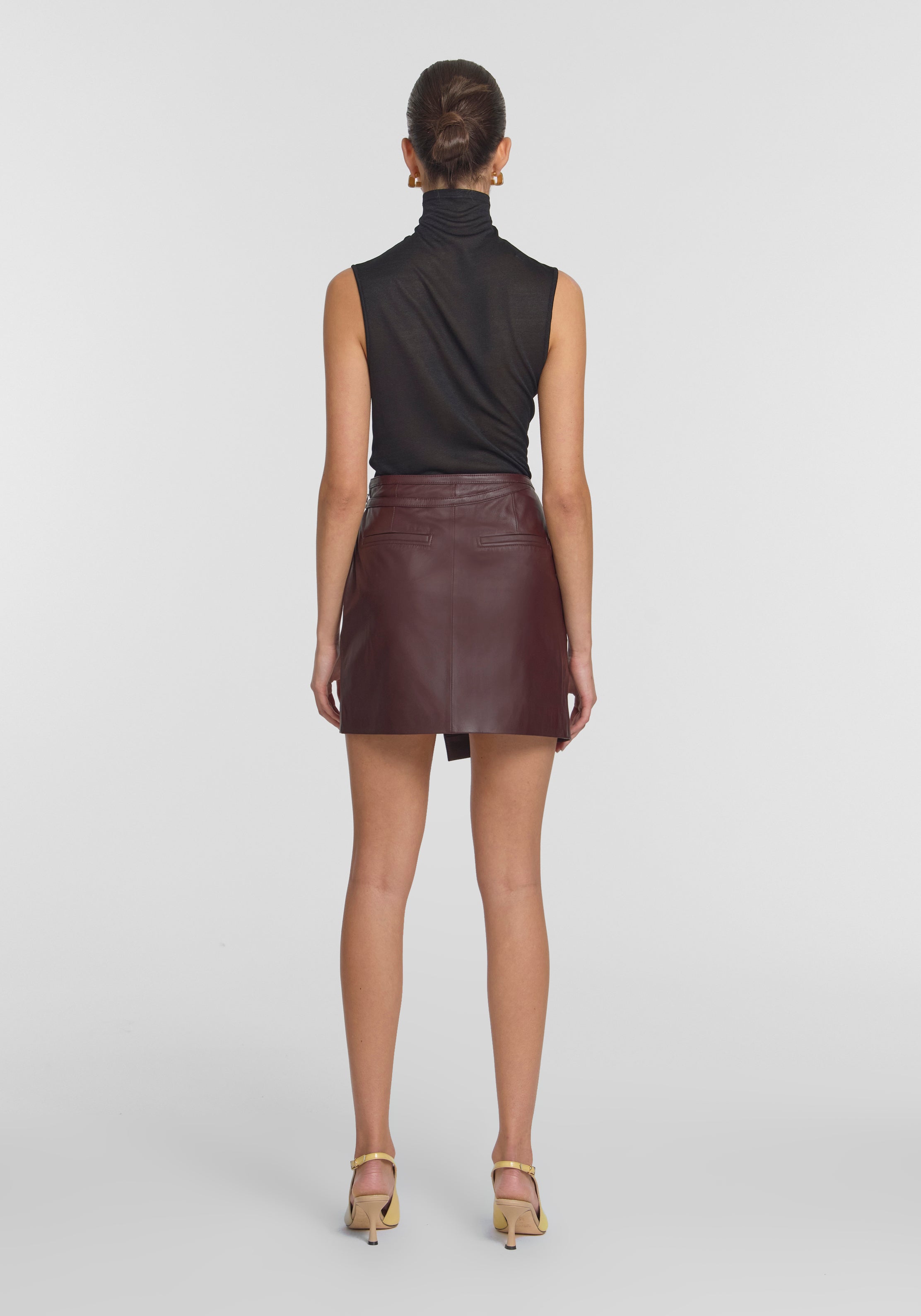 A luxurious statement with modern edge, the Gambit Leather Mini Skirt is crafted from soft nappa leather in a deep plum hue. Designed in a sleek A-line silhouette, it features a mock wrap front with considered belt and buckle detailing, and side pockets. Pair it with the Royale Leather Top for an effortlessly alluring look.