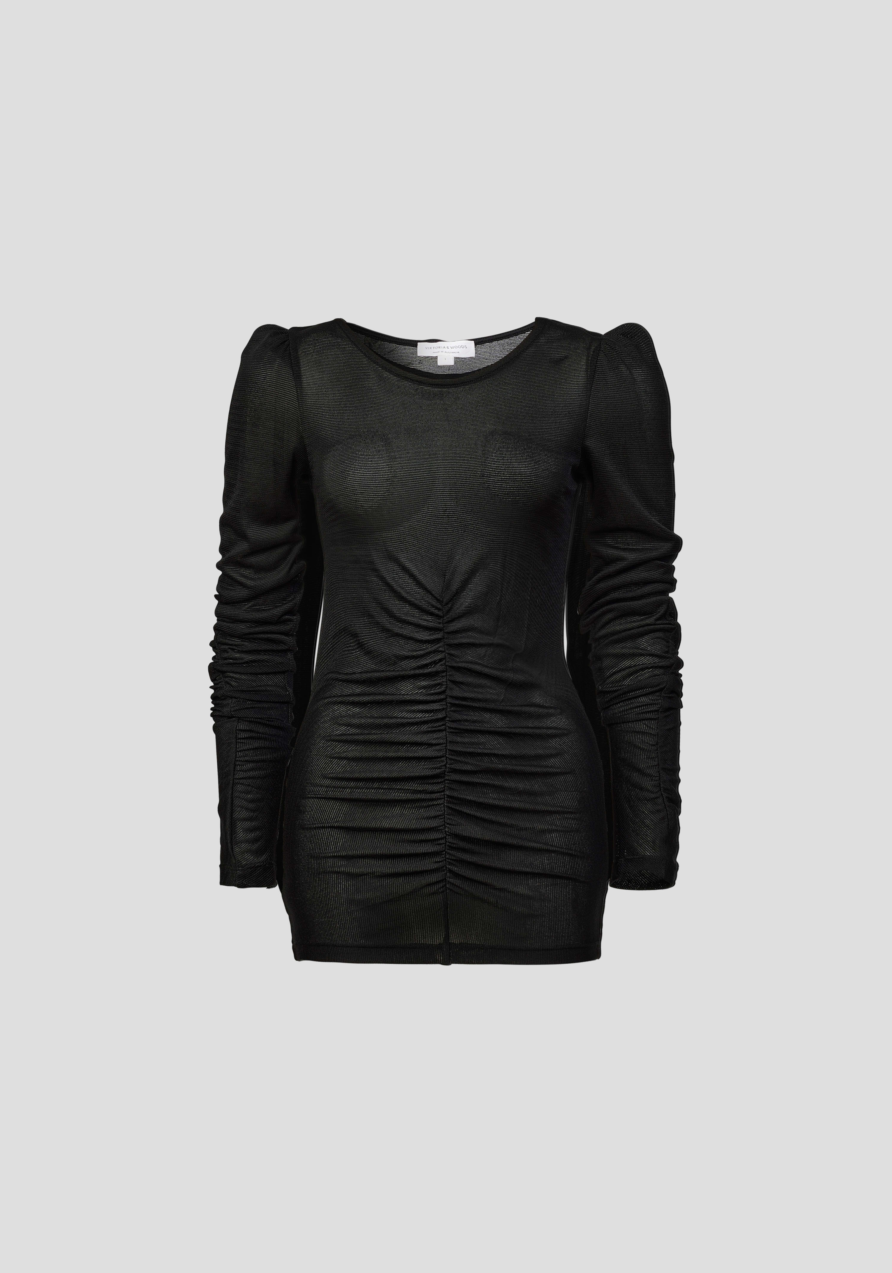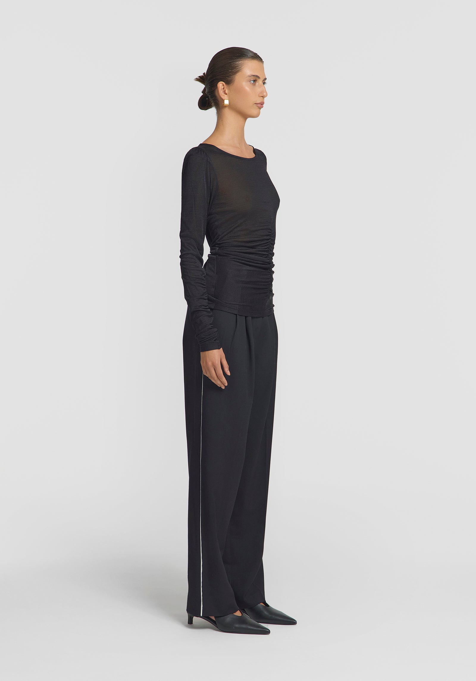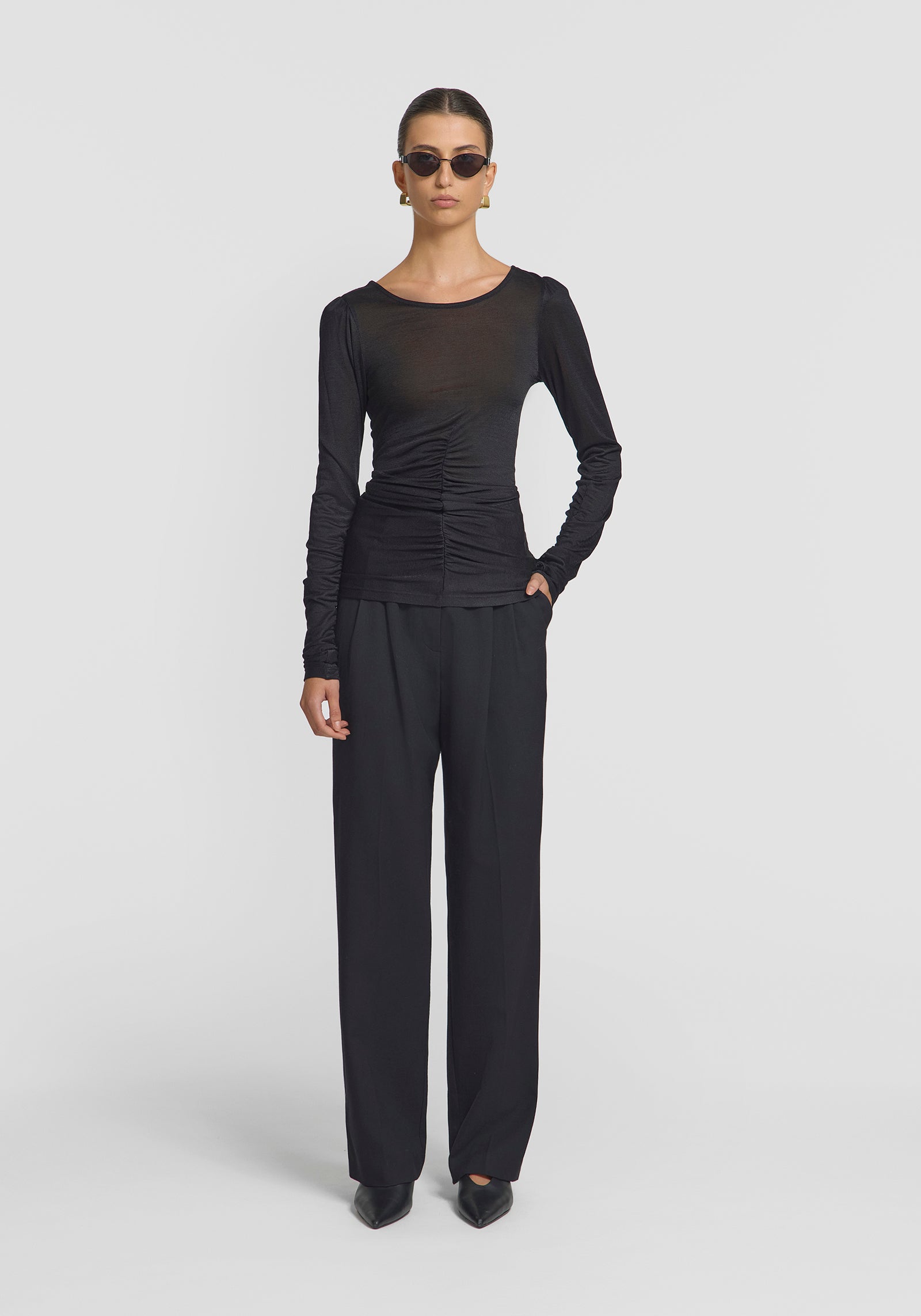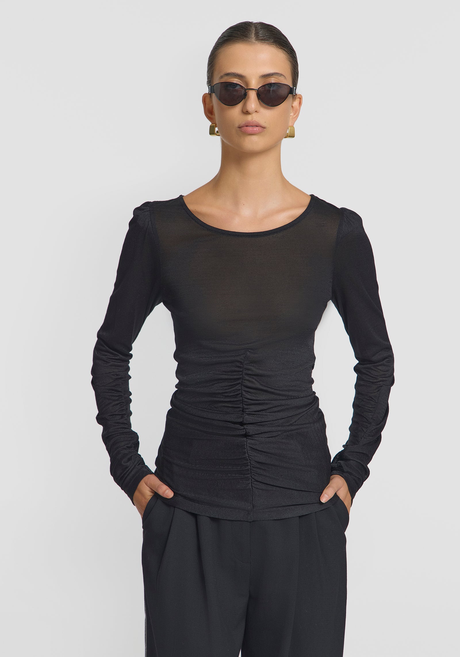An essential building block for your winter wardrobe, the Gloaming Top in black is a versatile first layer. Adorned with soft gathering through the sleeves and front, it exudes effortless elegance, elevating your everyday outfitting with simplicity.