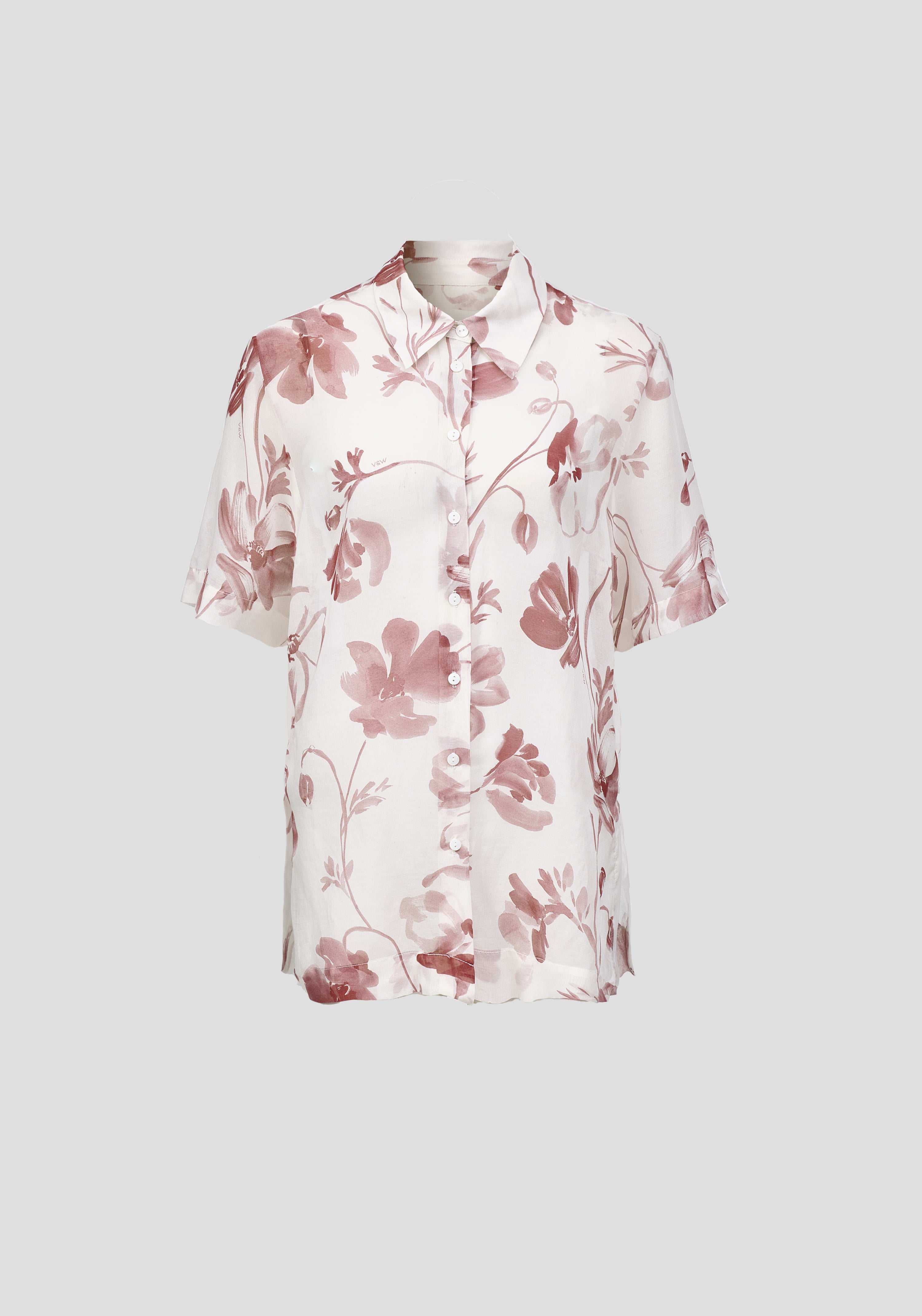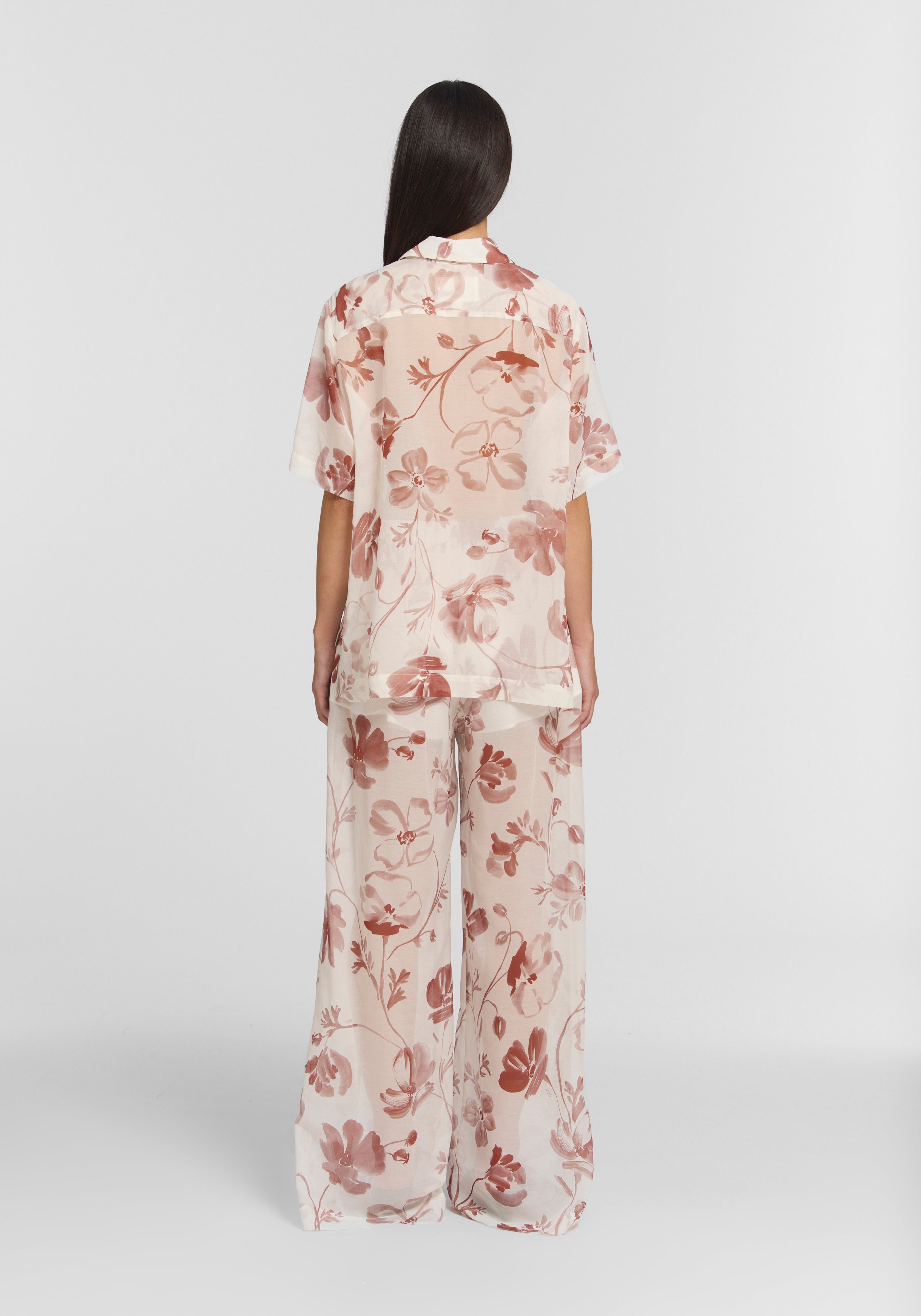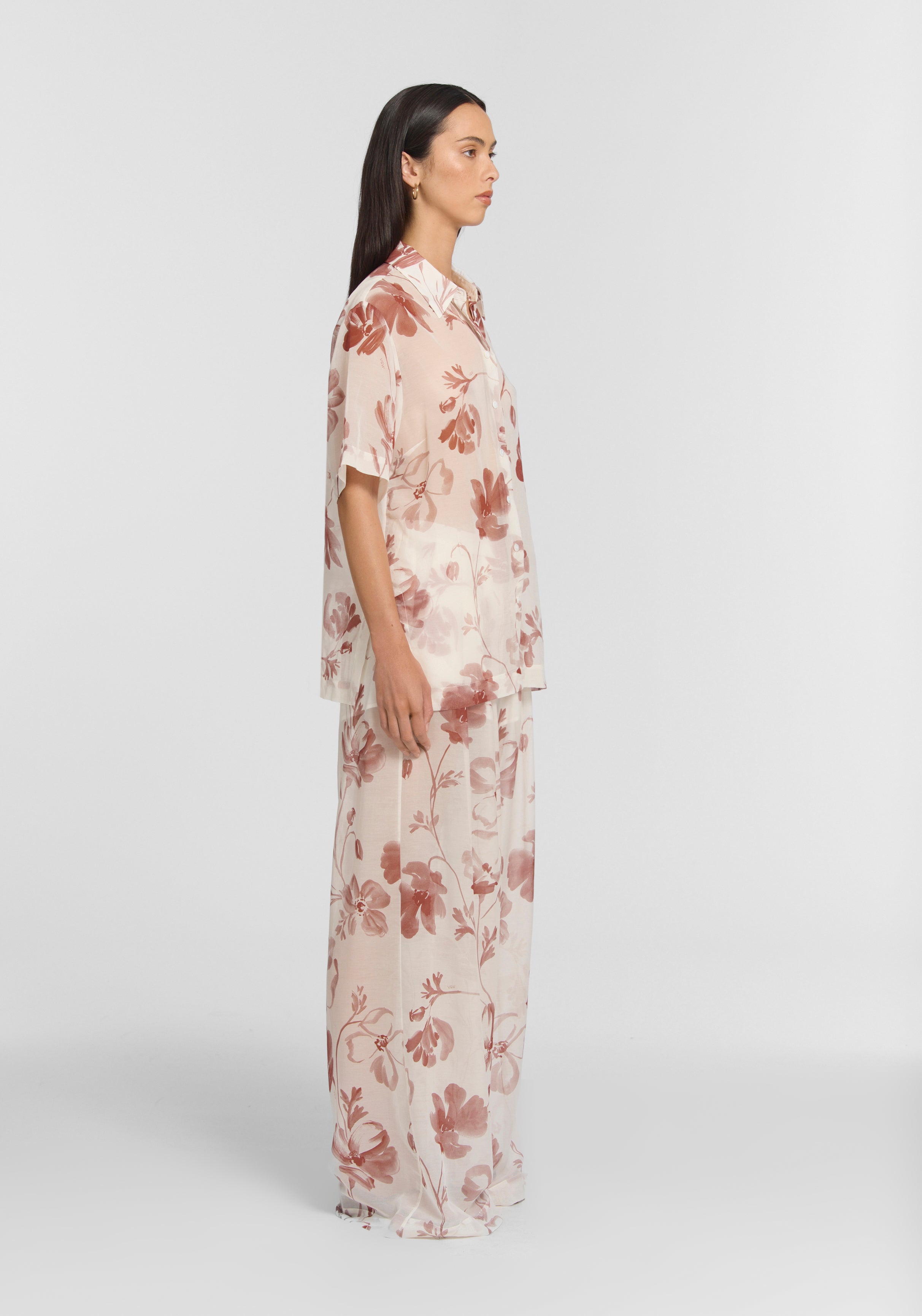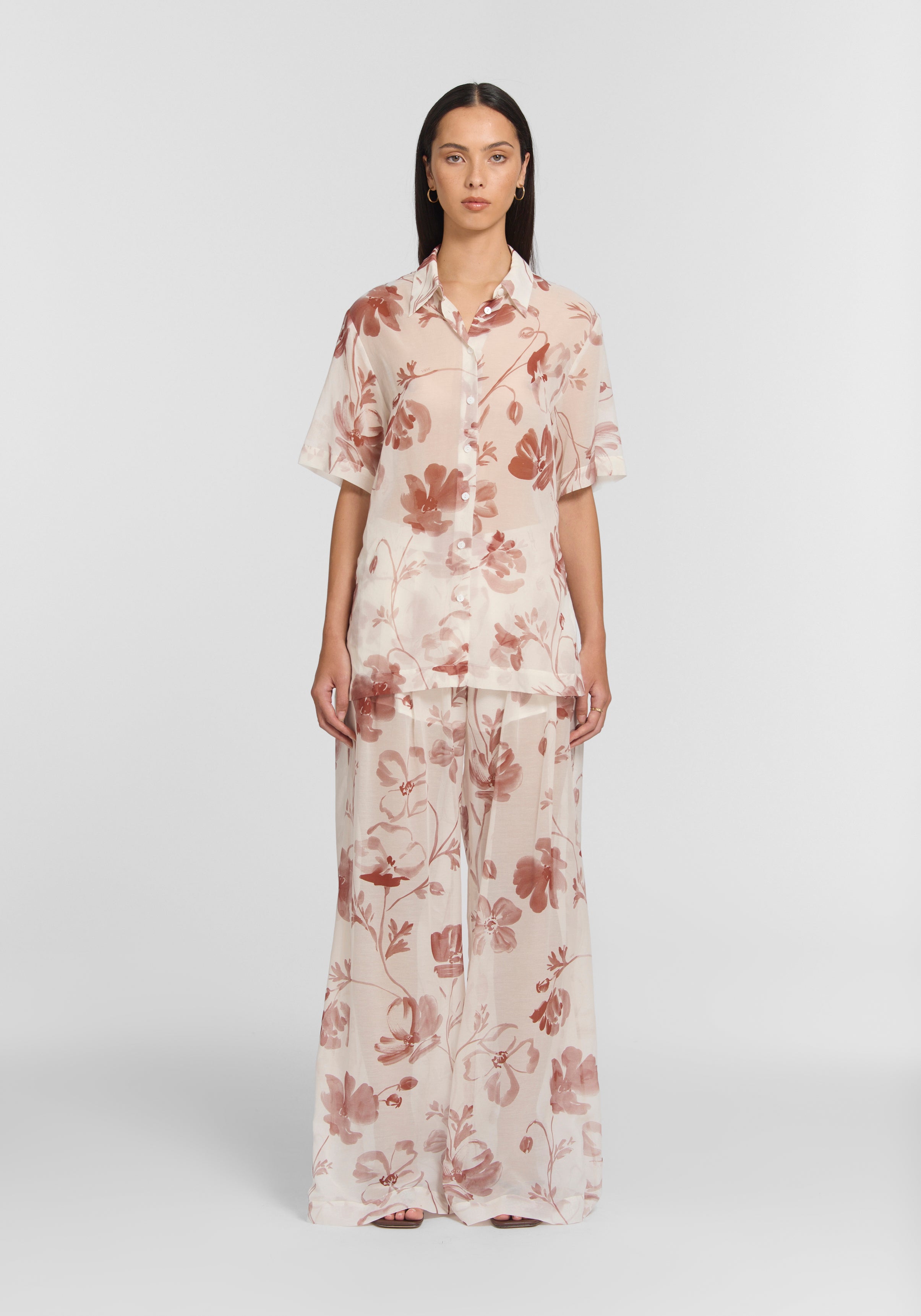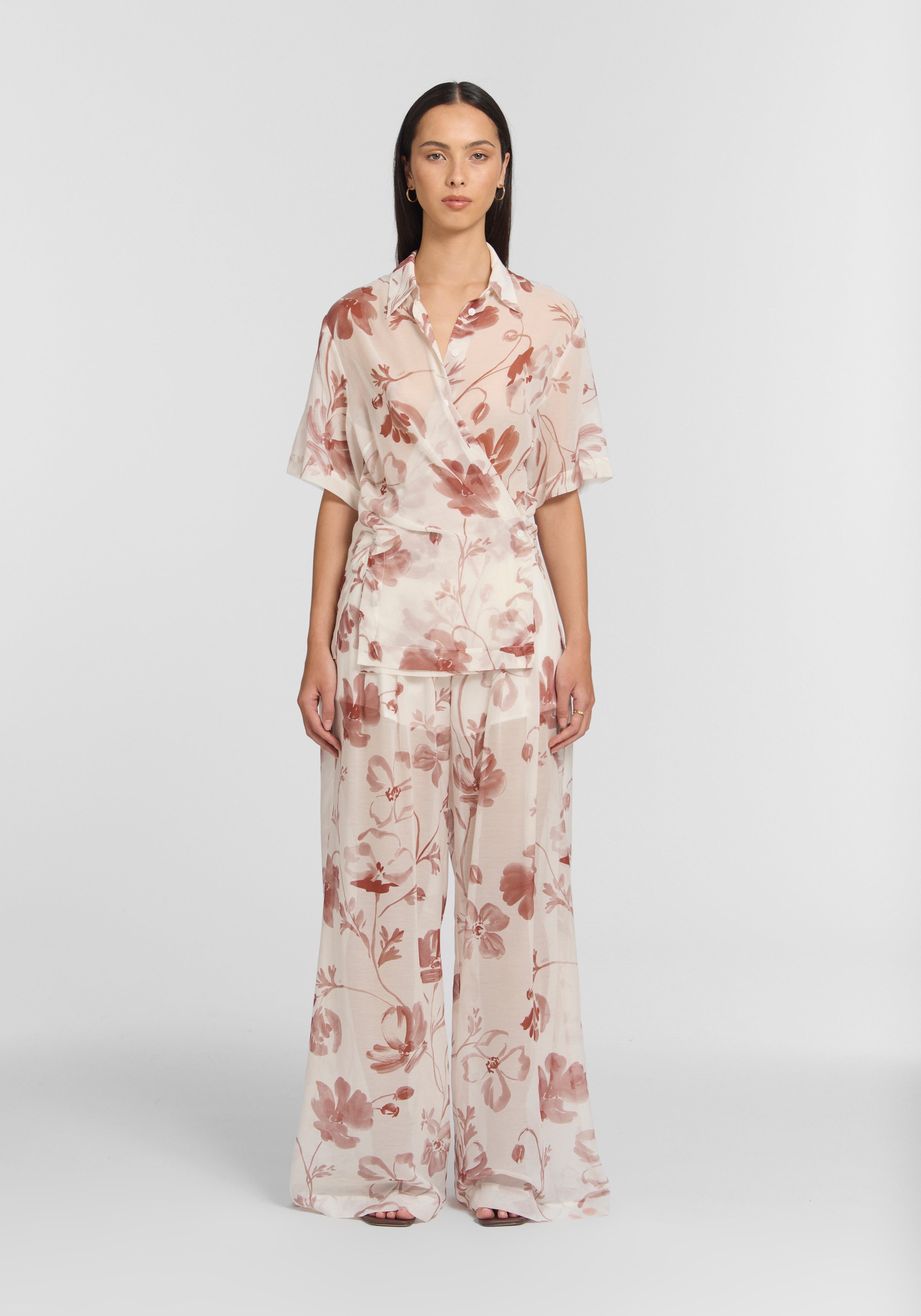 The Goldstone Shirt, crafted from a cotton-silk blend in a unique red and ivory floral, offers effortless elegance. Featuring a traditional collar, button front, and optional wrap detail, it fuses elevated versatility with relaxed sophistication. Pair with the Harlot Pant for a summer set, or style back with everyday staples for a pared-back look.