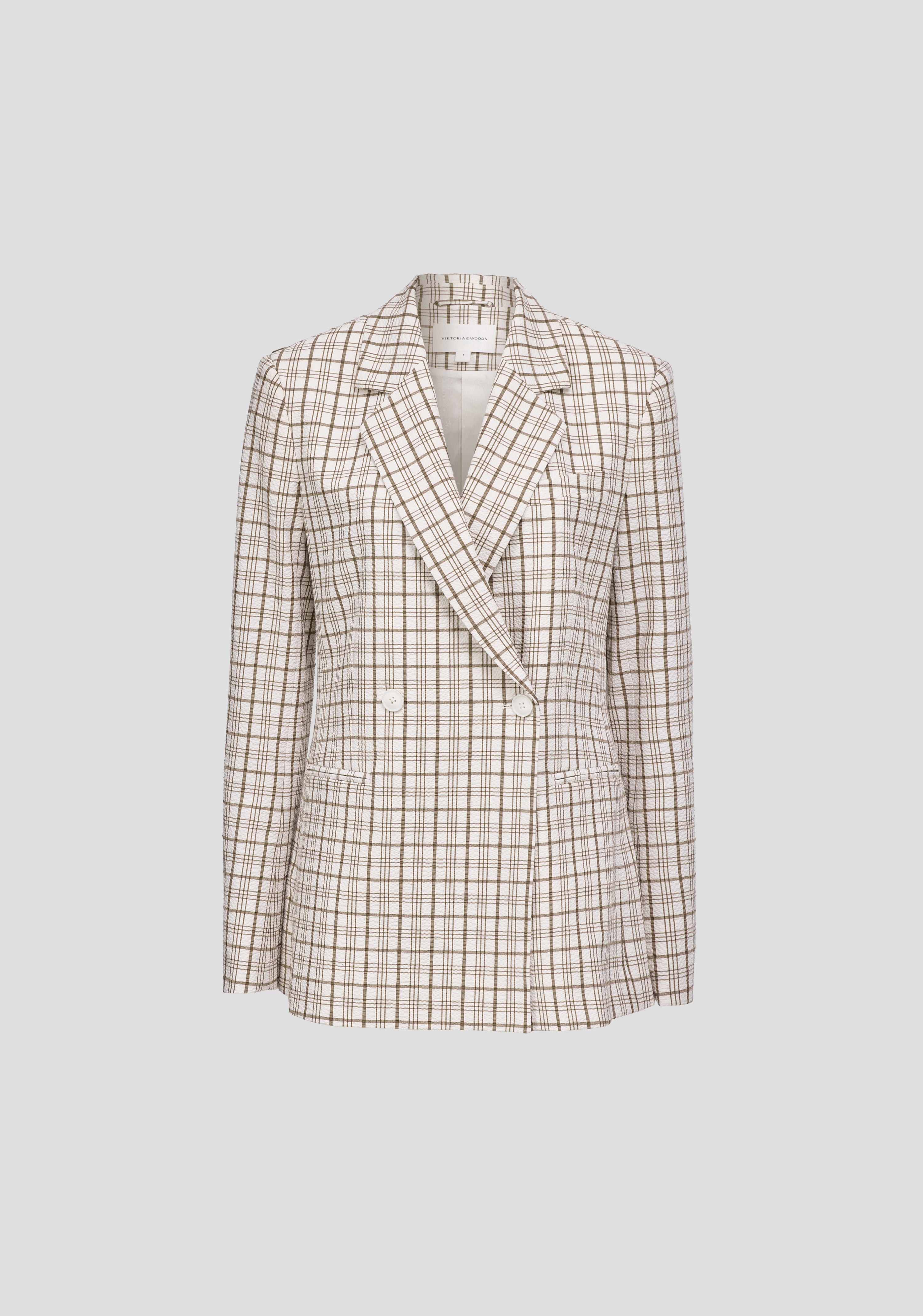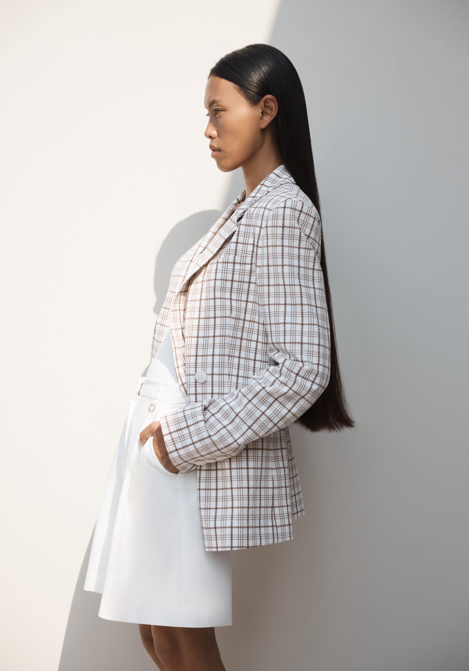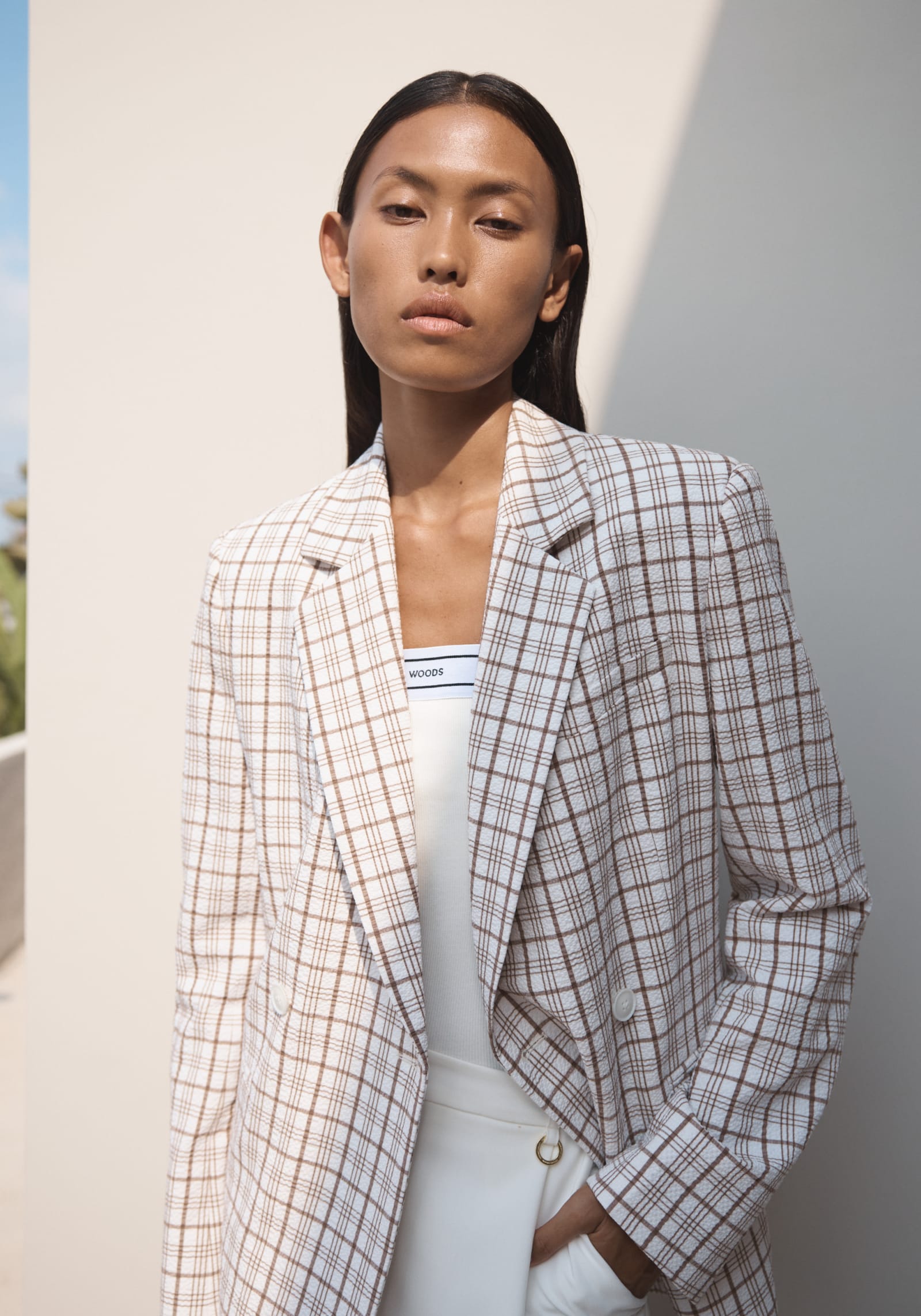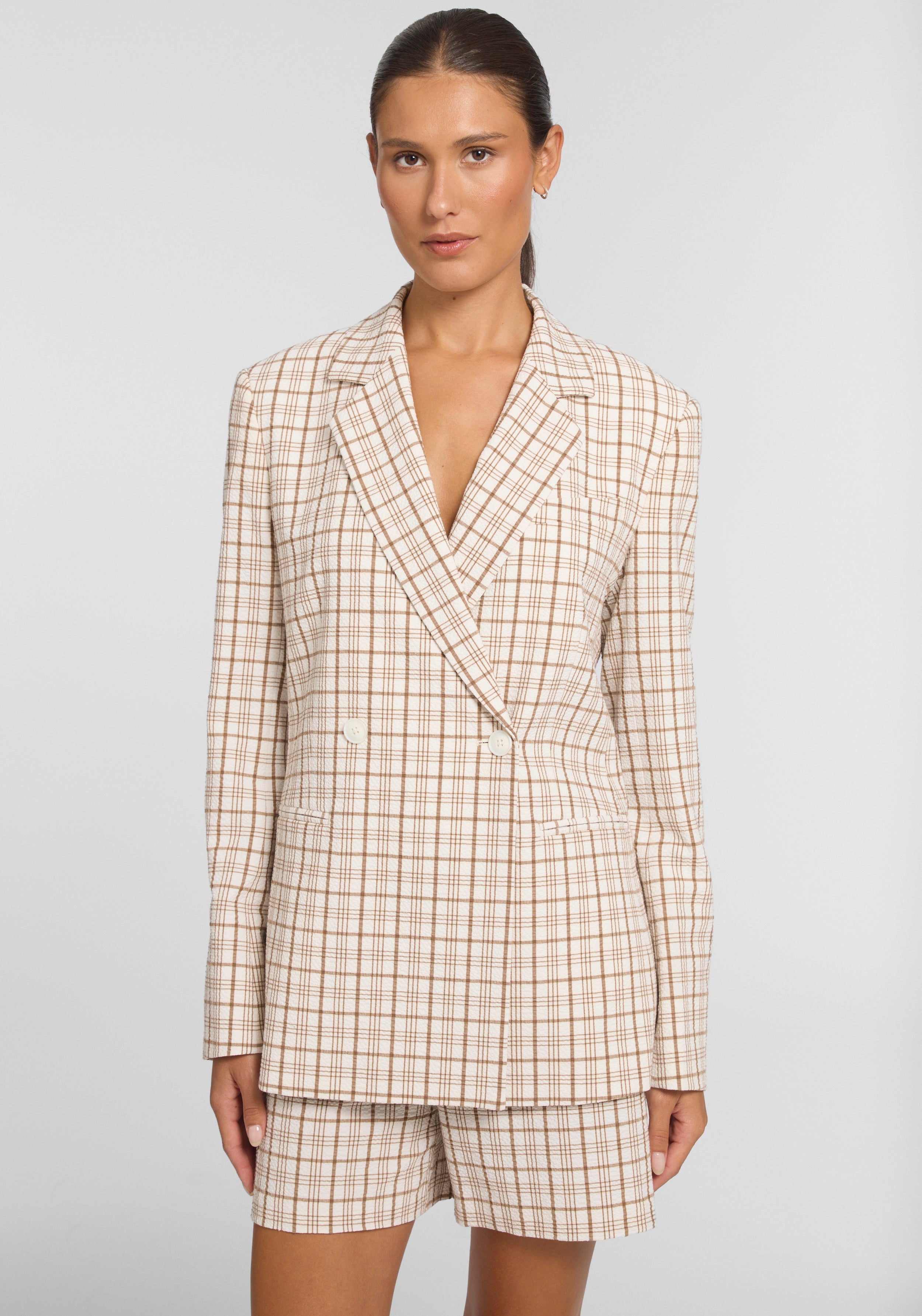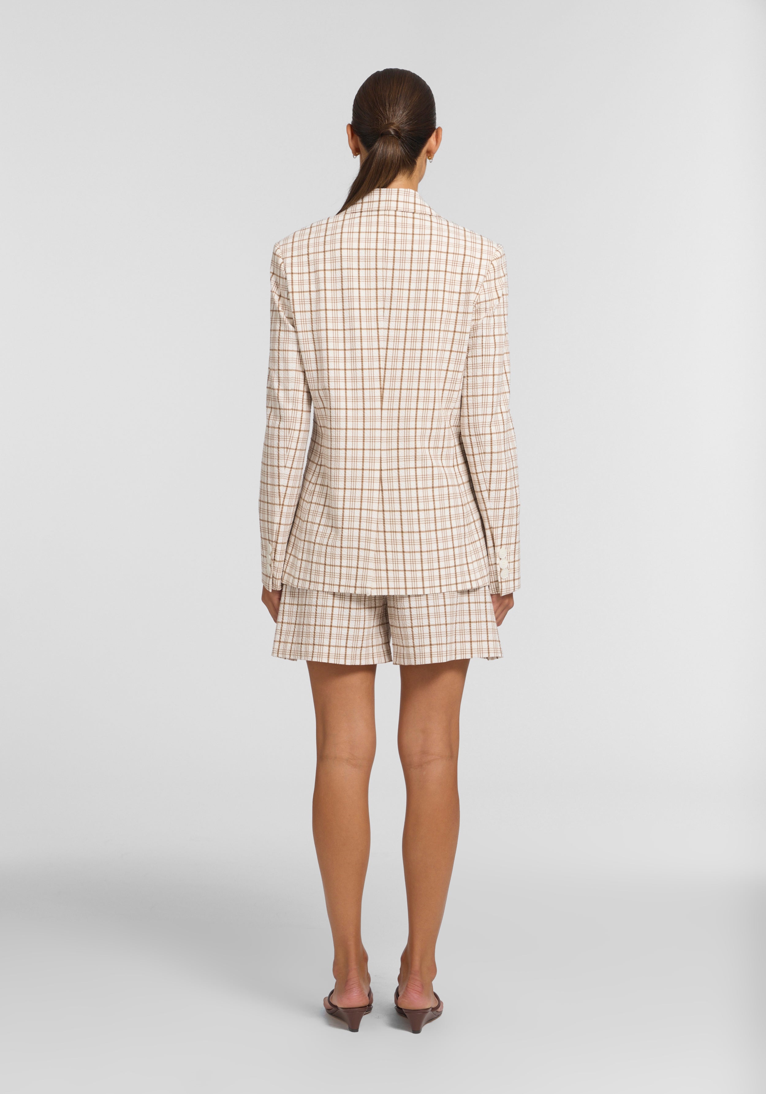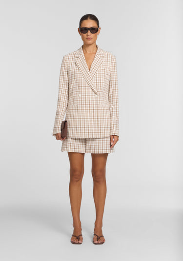 Courtside dressing is redefined with the Grammer Blazer, luxuriously crafted in a textured neutral check. Informed by our signature sports tailoring, this double-breasted blazer features a notched collar and lapel, sharp shoulders, chest and welt pockets, and a centre-back vent. Pair with the Rupert Short for a tailored statement with a preppy undertone.