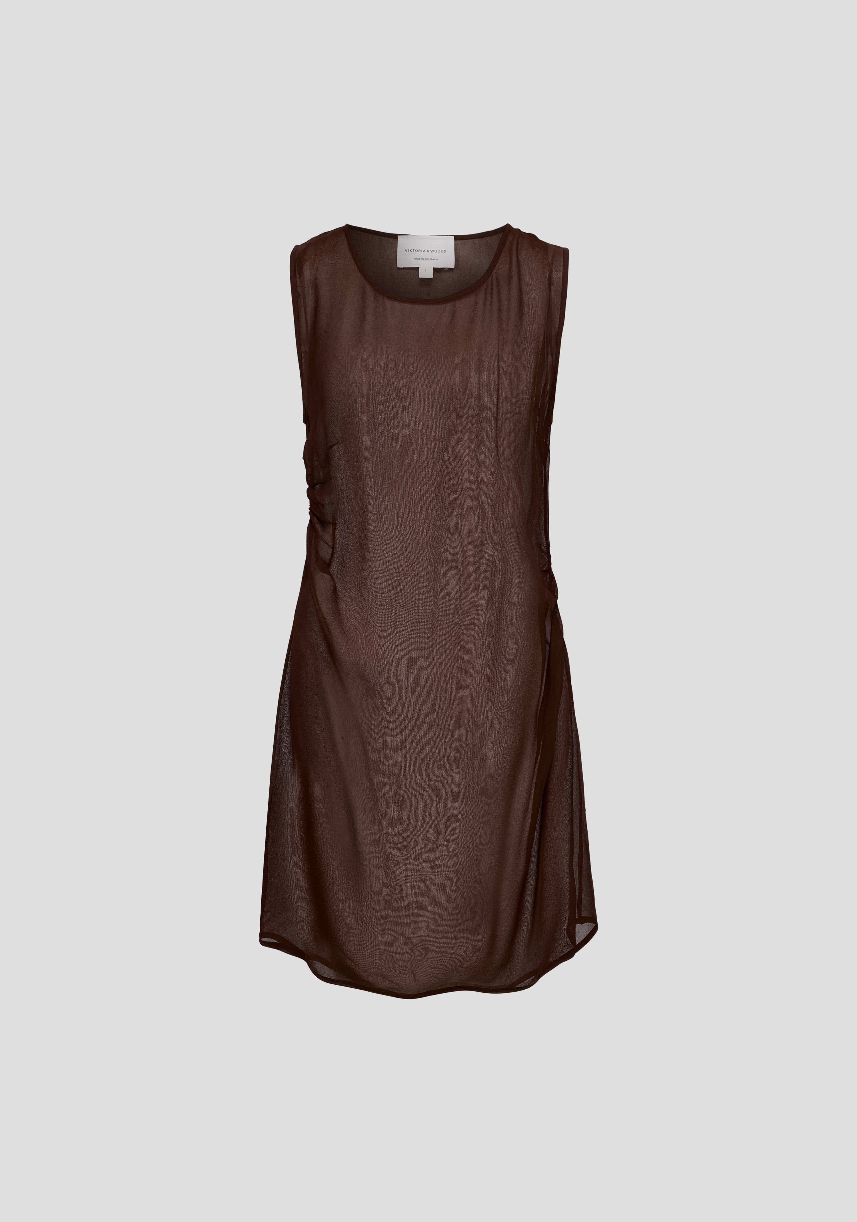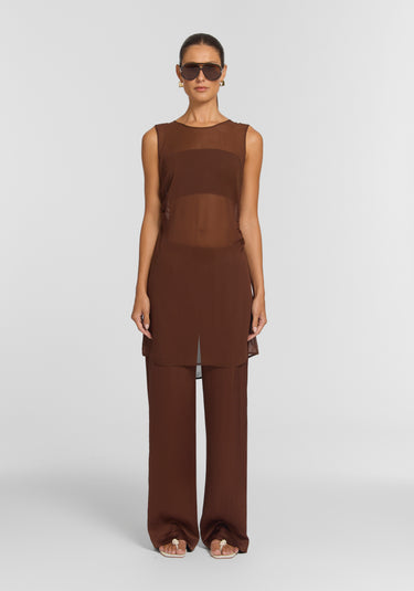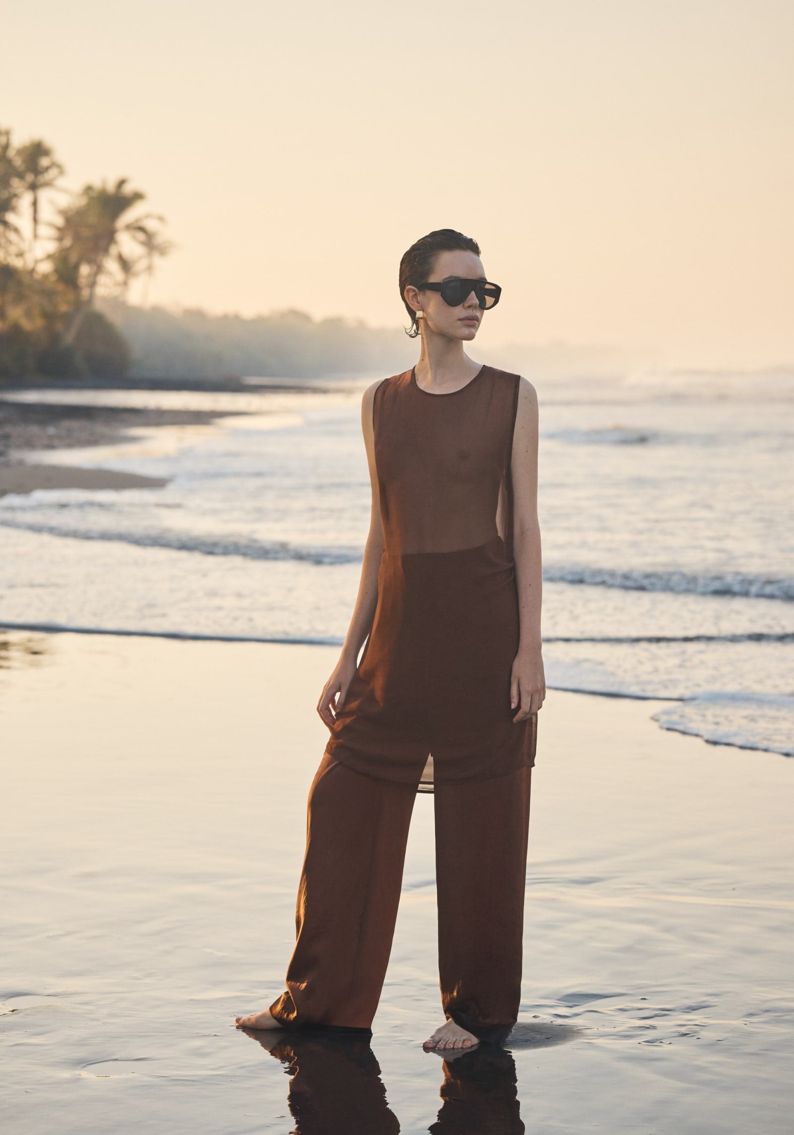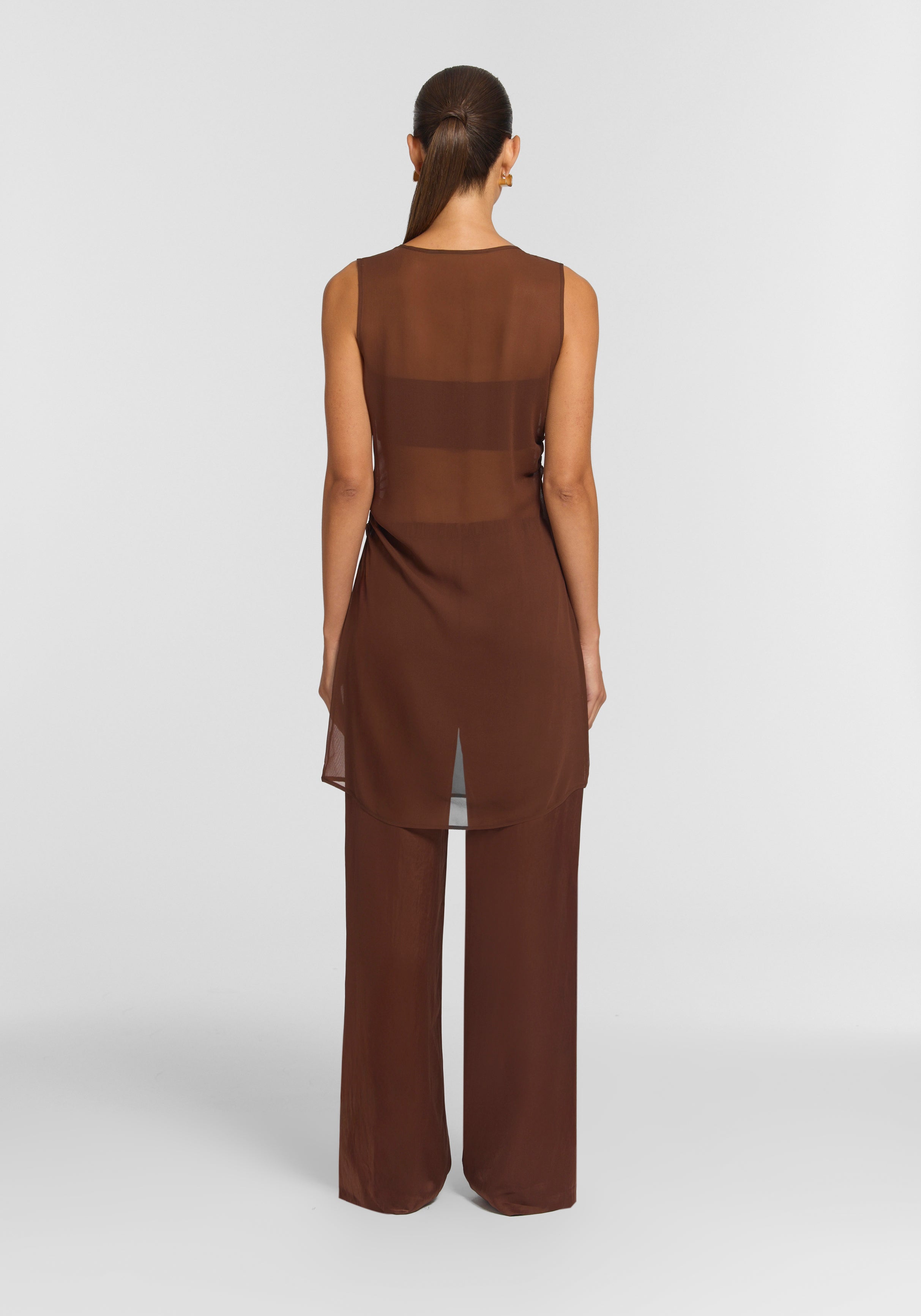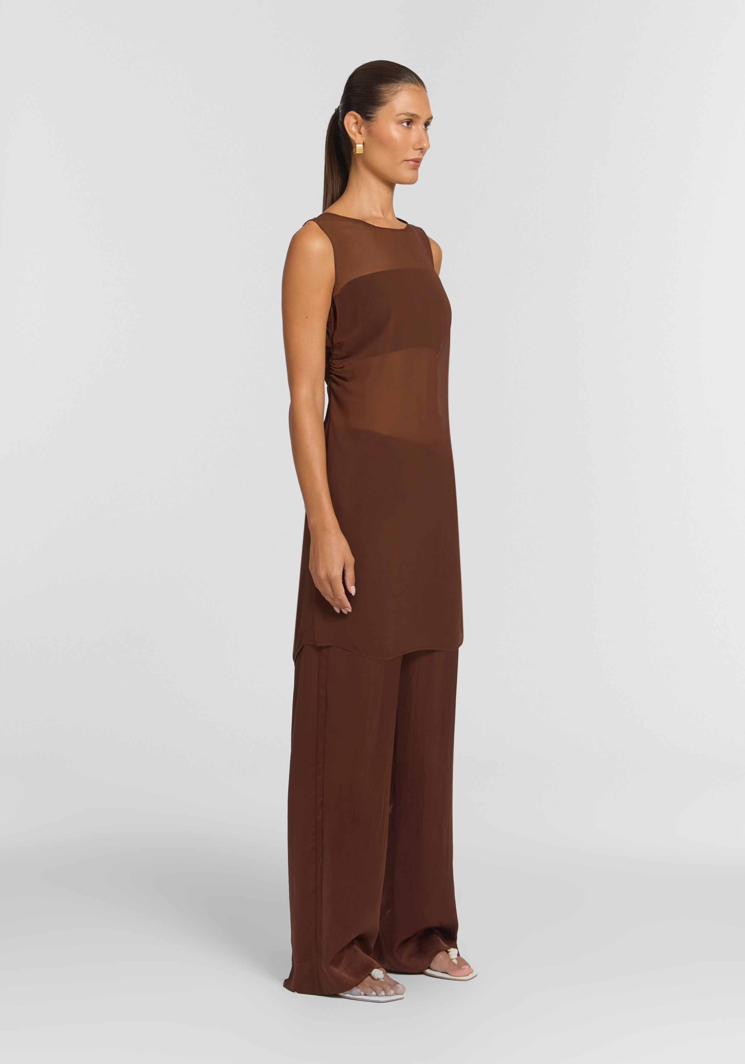 The Halcyon Tunic, crafted in rich chestnut silk, is a multi-functional statement, designed to be the cornerstone of a considered wardrobe. Its relaxed, straight fit is realised in a sleeveless tunic with a crew neck, softened by an asymmetric tuck at the waist. The tunic becomes a canvas for the wearer - worn as a dress, layered over the Rocky Pant, or styled to express your own modern versatility.