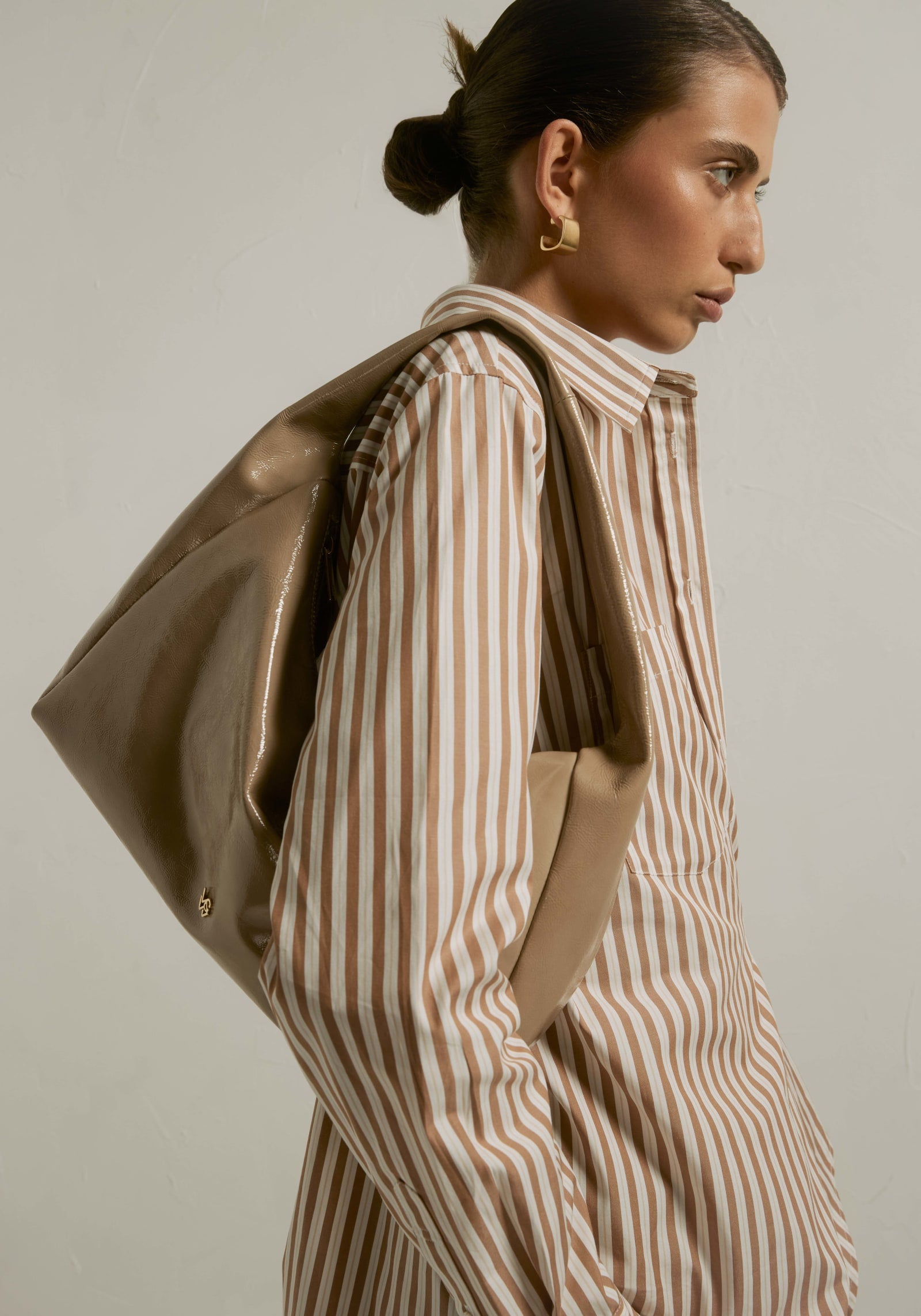 Effortlessly elevate your outfitting with the Harvey Bag, crafted from crinkled patent taupe leather. Accented with gold V&W hardware, a zip opening, and an internal pocket with a branded leather patch. This sleek design adds refined intrigue to any look - a timeless addition to every wardrobe.