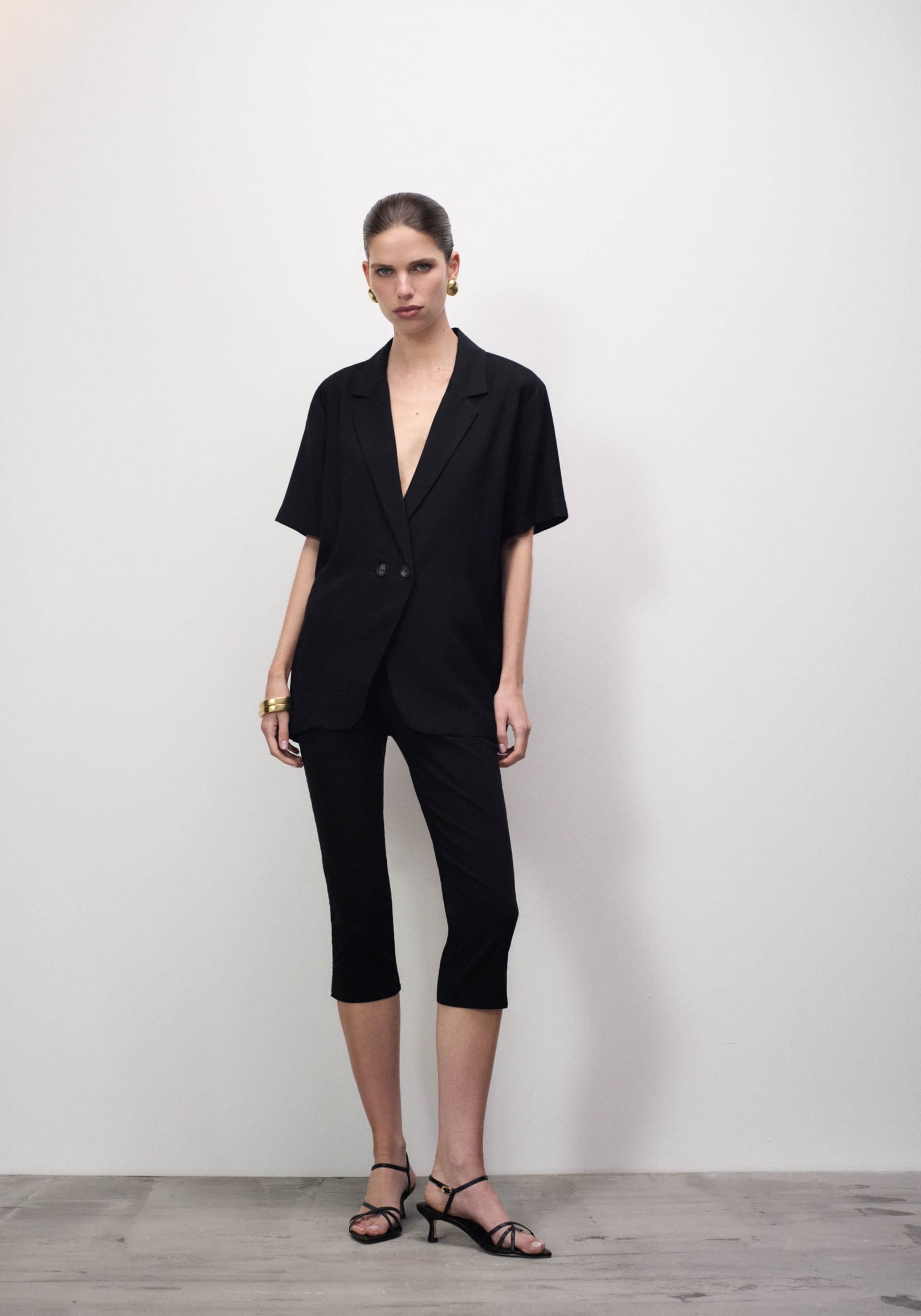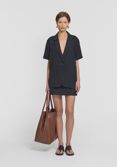 Introducing the Hepburn Shirt, a refined take on our iconic Chorus Shirt, tailored in a luxurious black bamboo blend. With its double-breasted front and relaxed fit, this piece offers timeless versatility. Effortlessly pair it with the Peninsula Skirt for a chic set, or style with tailored separates or denim for a classic, polished look.