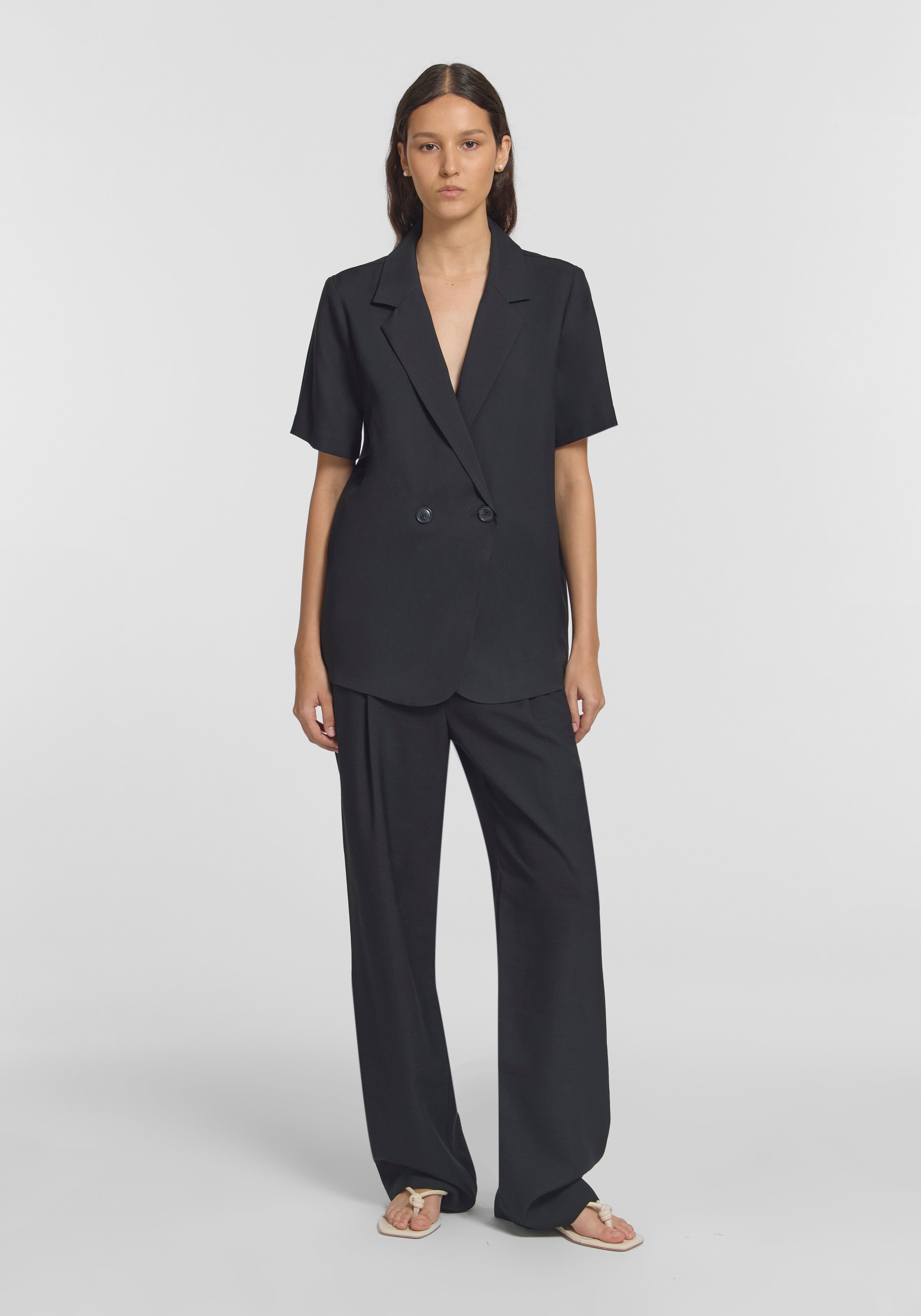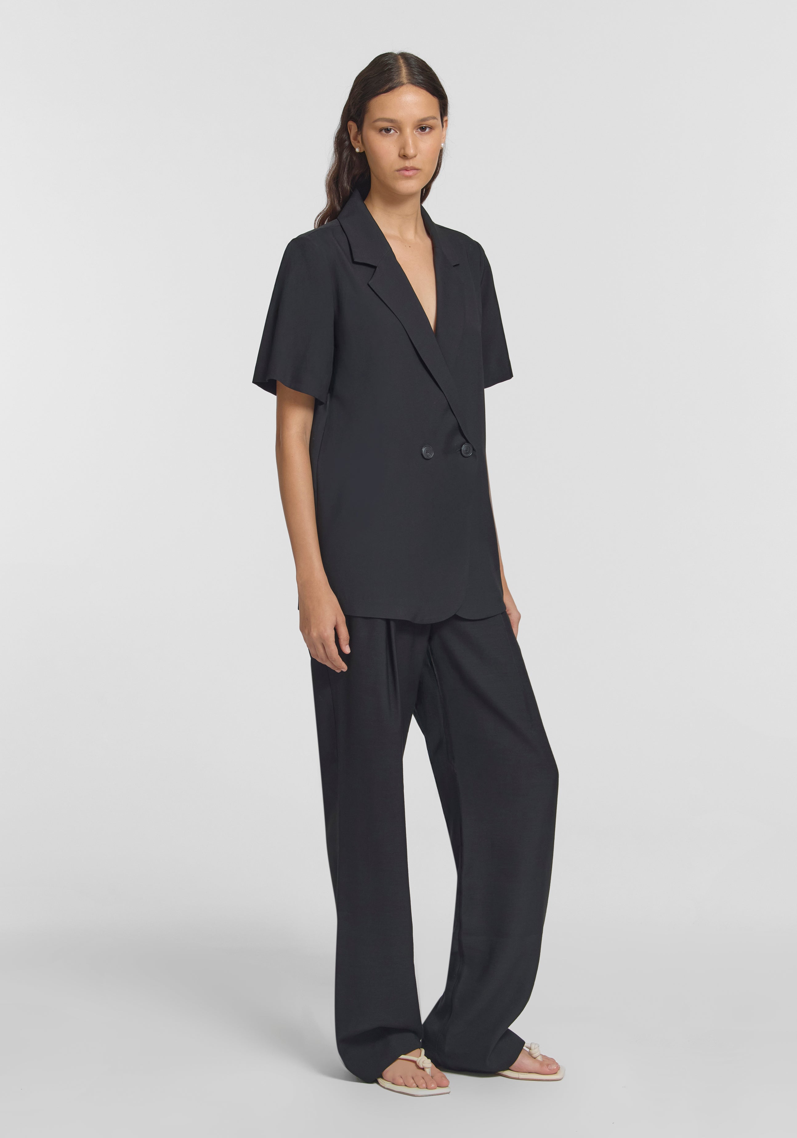 Introducing the Hepburn Shirt, a refined take on our iconic Chorus Shirt, tailored in a luxurious black bamboo blend. With its double-breasted front and relaxed fit, this piece offers timeless versatility. Effortlessly pair it with the Ivanhoe Pant for a chic set, or style with tailored separates or denim for a classic, polished look.