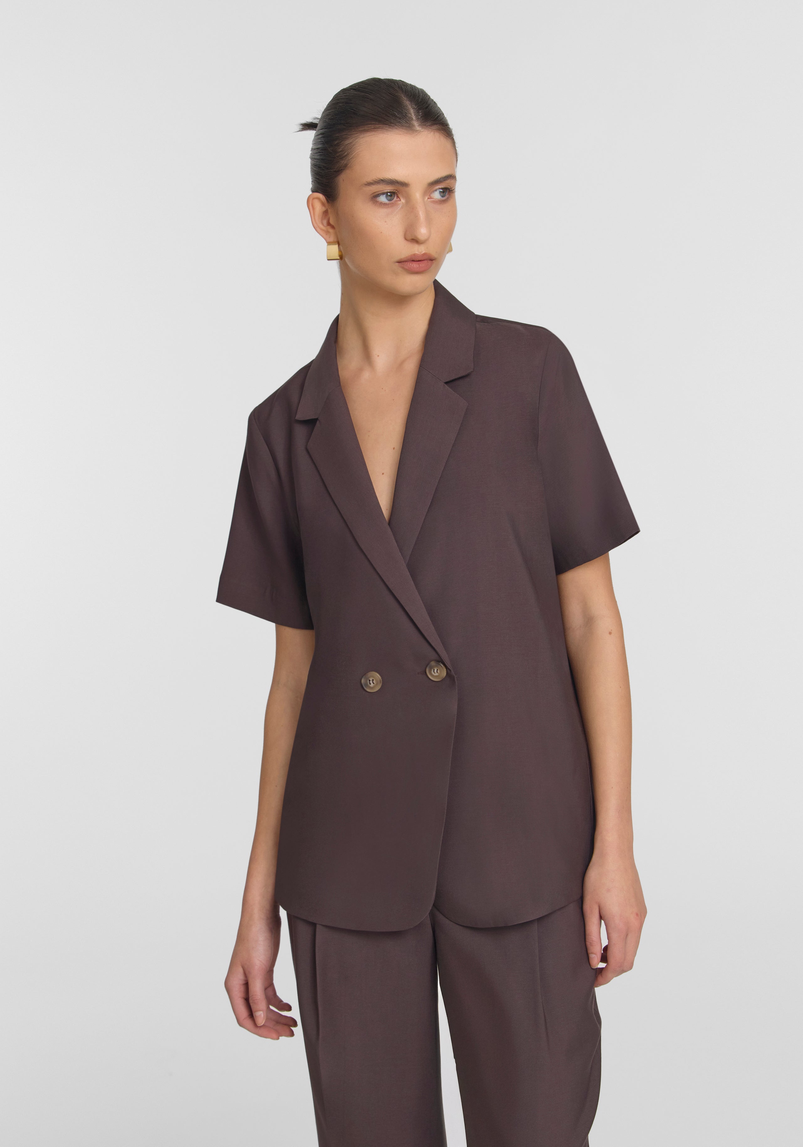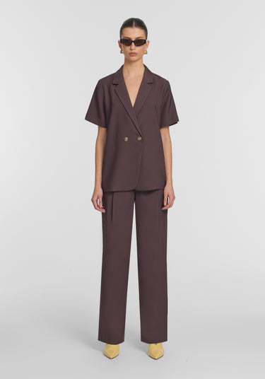 The Hepburn Shirt returns in a rich chocolate hue, tailored from our signature bamboo blend. Featuring a double-breasted front, relaxed fit, and back vent, it offers timeless versatility. Pair effortlessly with the Ivanhoe Pant for a refined set, or style back with denim for polished ease.