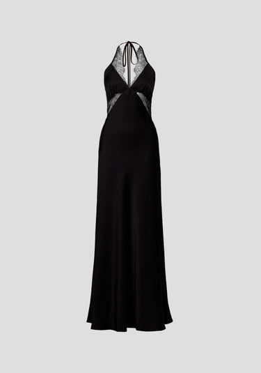 The Heritage Dress, crafted from our signature cupro blend in classic black, embodies modern femininity and enduring elegance. Featuring a halter neckline with delicate lace detailing through the neckline and waist, it falls to full length with underbust seams, creating a timeless silhouette. The perfect black dress for any event, it offers a modern take on monochromatic dressing.