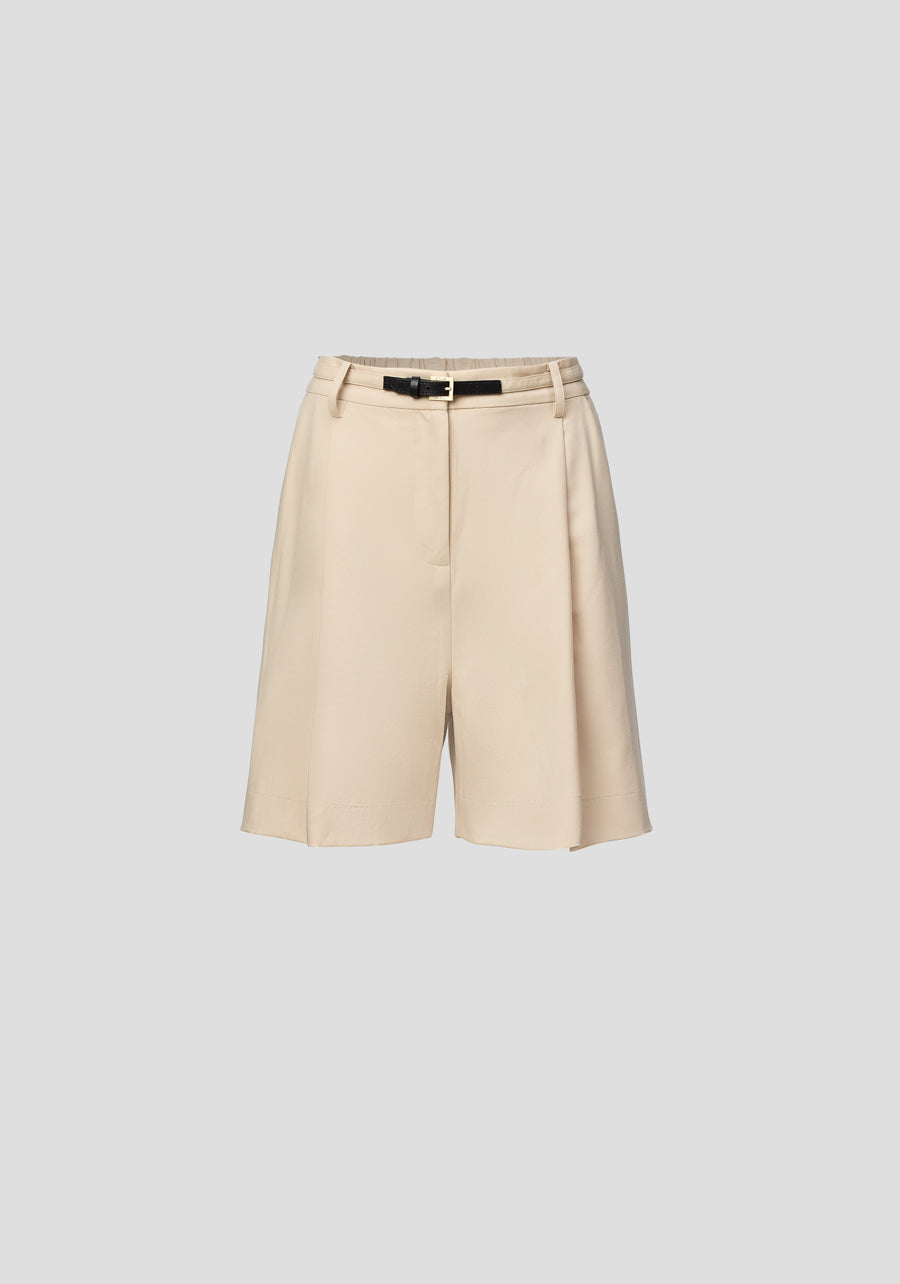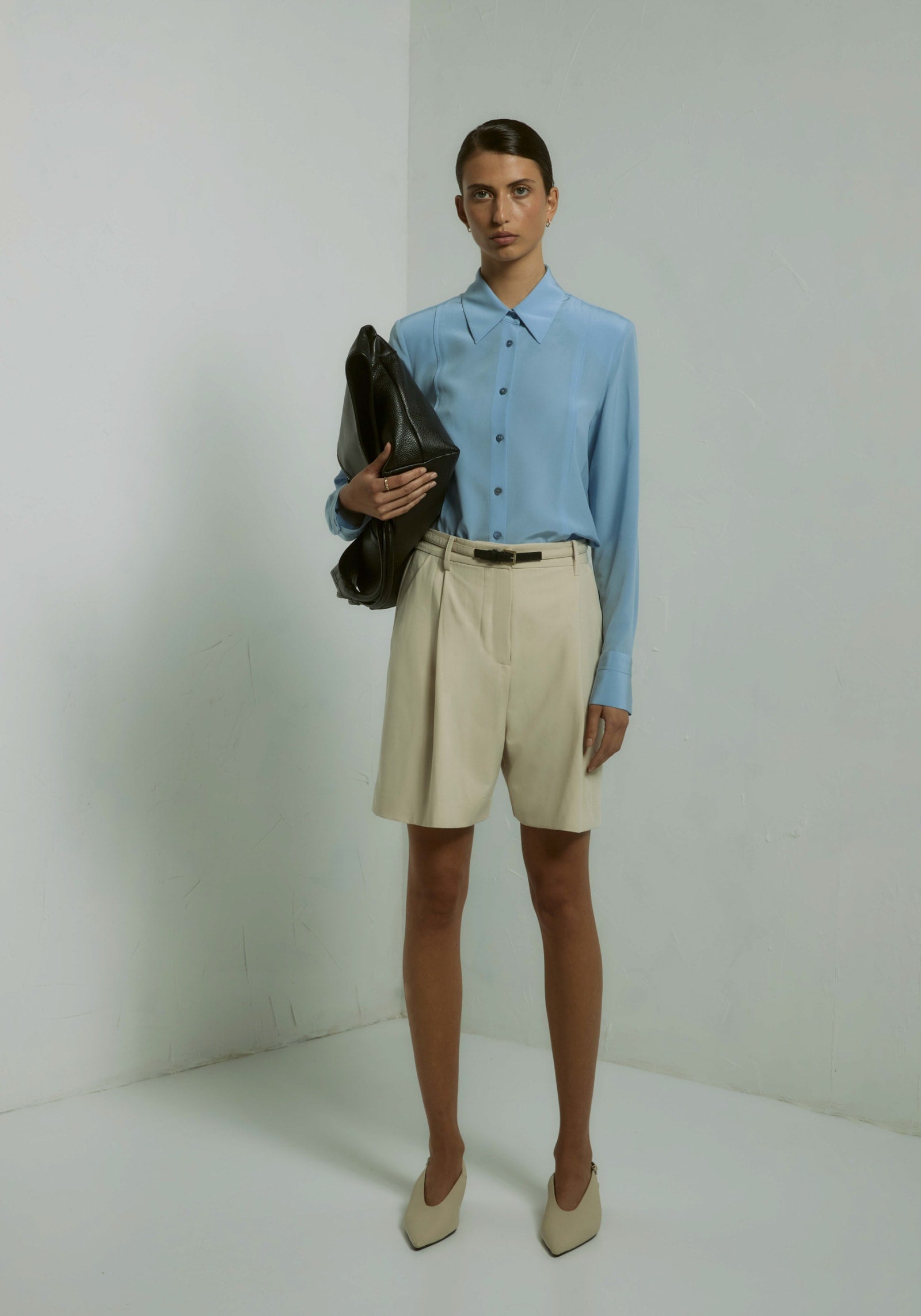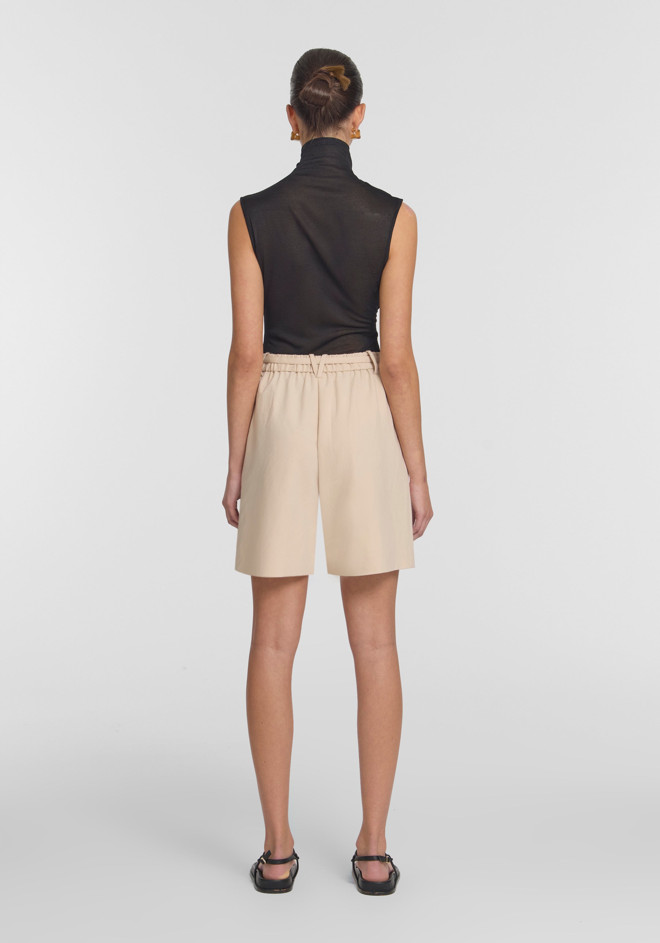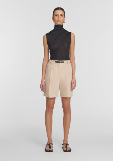 The Hermione Short, crafted from our signature rayon/nylon blend in a neutral almond hue, fuses classic tailoring with soft utilitarian detailing. Showcasing a high-rise silhouette, tailored waistband, and encased elastic back waist, these longline shorts feature front pleats, pockets, and a black leather belt with a gold buckle. Pair with the Acapella Vest or style with V&W cotton basics for timeless, effortless elegance.